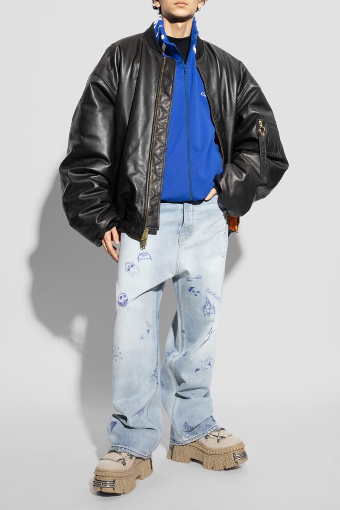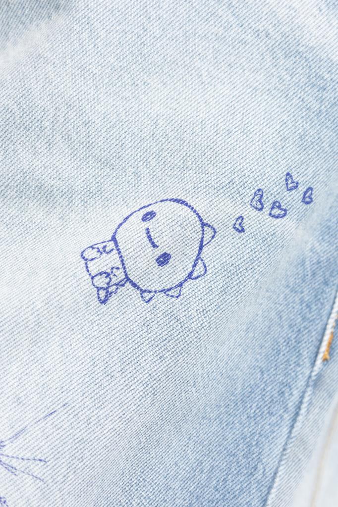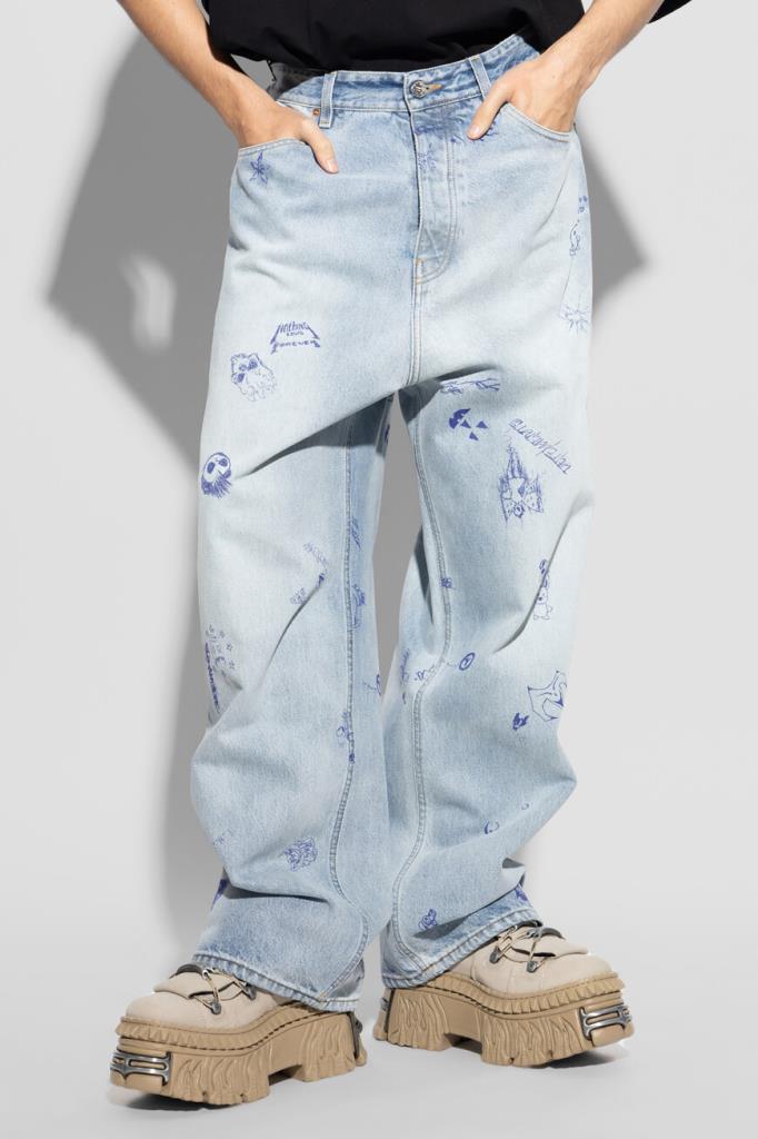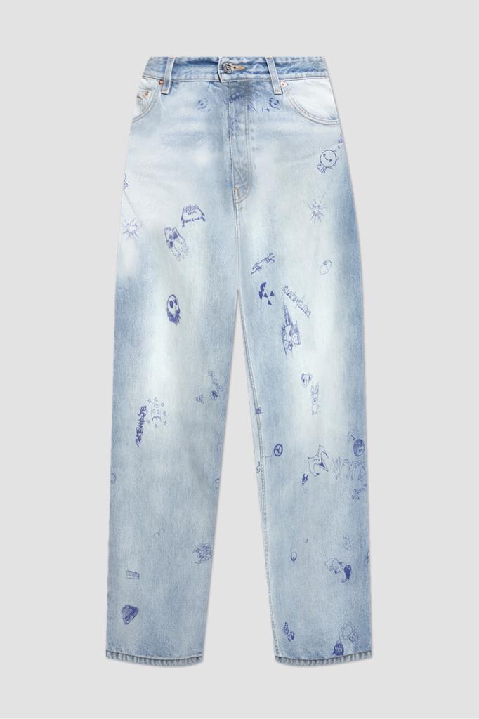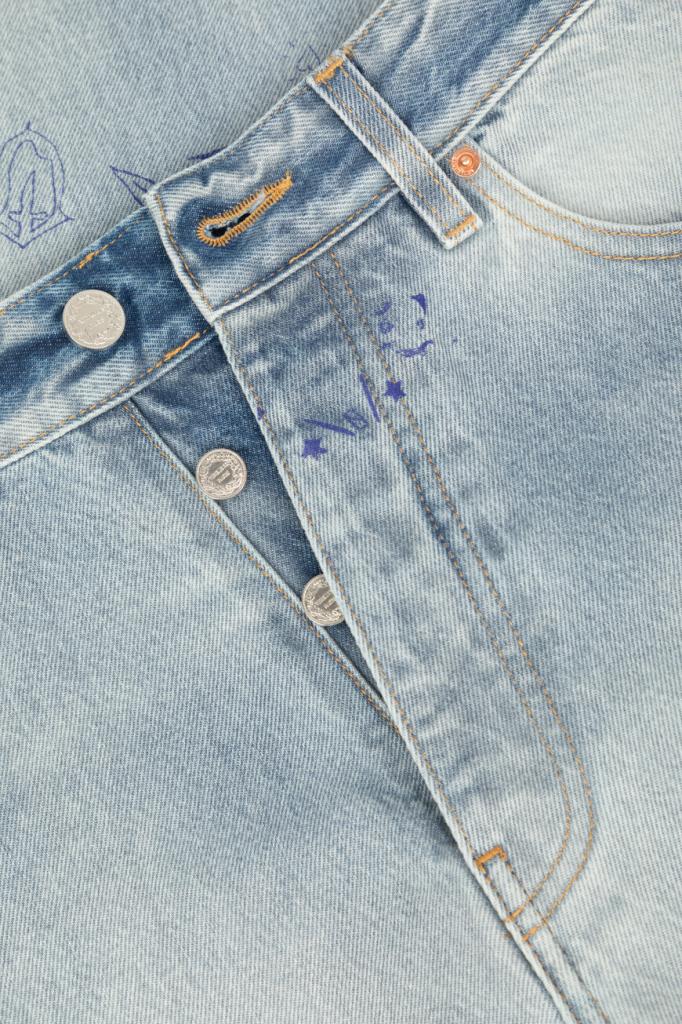 Джинсы с выбеленным эффектом от VETEMENTS вдохновлены уличным стилем 90-х. Модель из эксклюзивной коллекции, отличающаяся инновационным дизайном, сшита из чистого хлопкового денима светло-синего оттенка. Поверхность изделия немного расклешенного книзу свободного силуэта декорирована принтом и символикой Дома, словно нарисованными от руки синей ручкой.