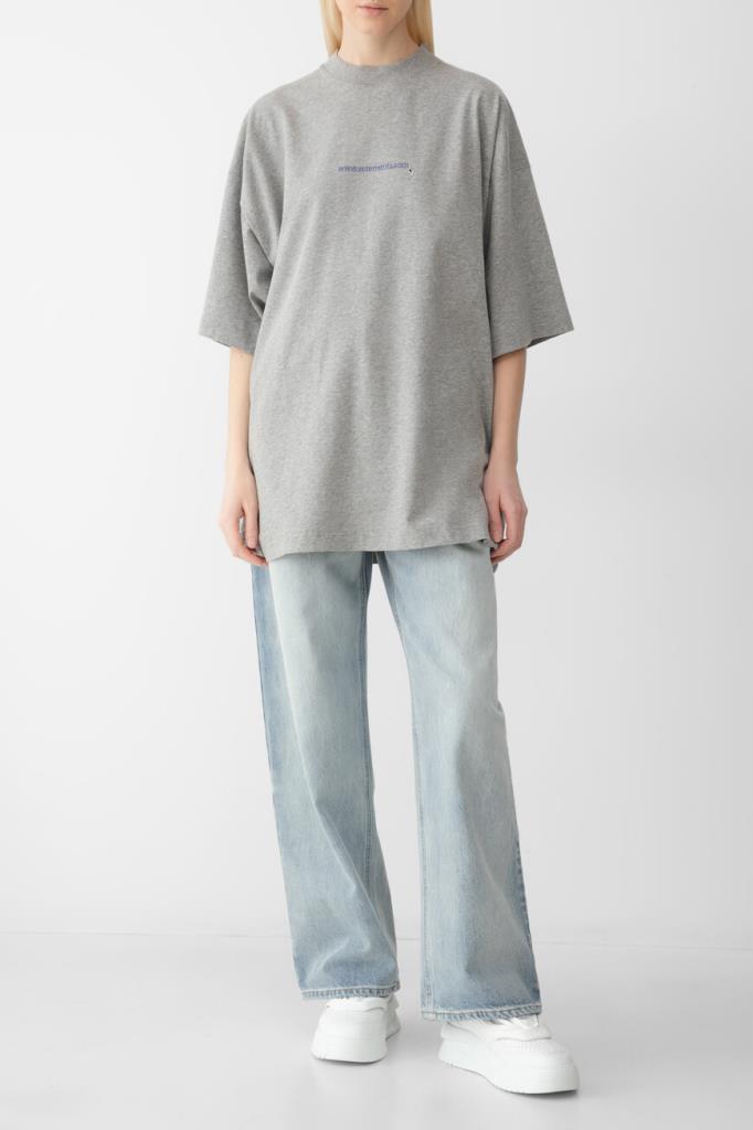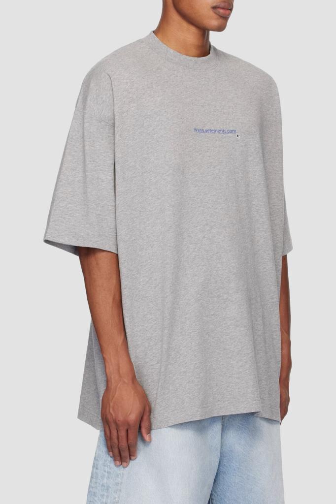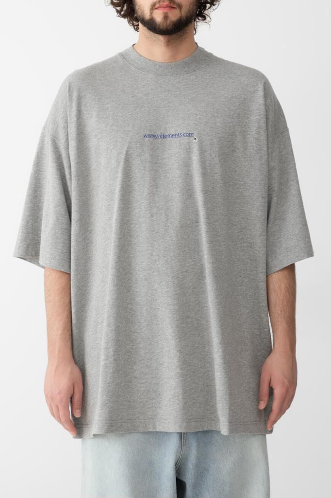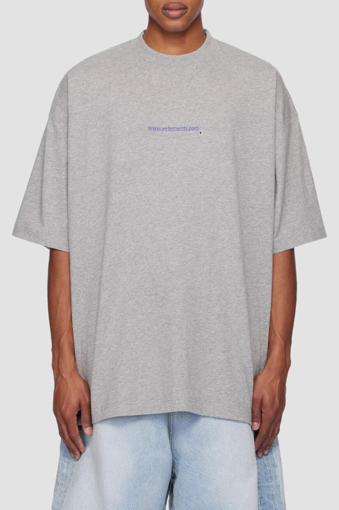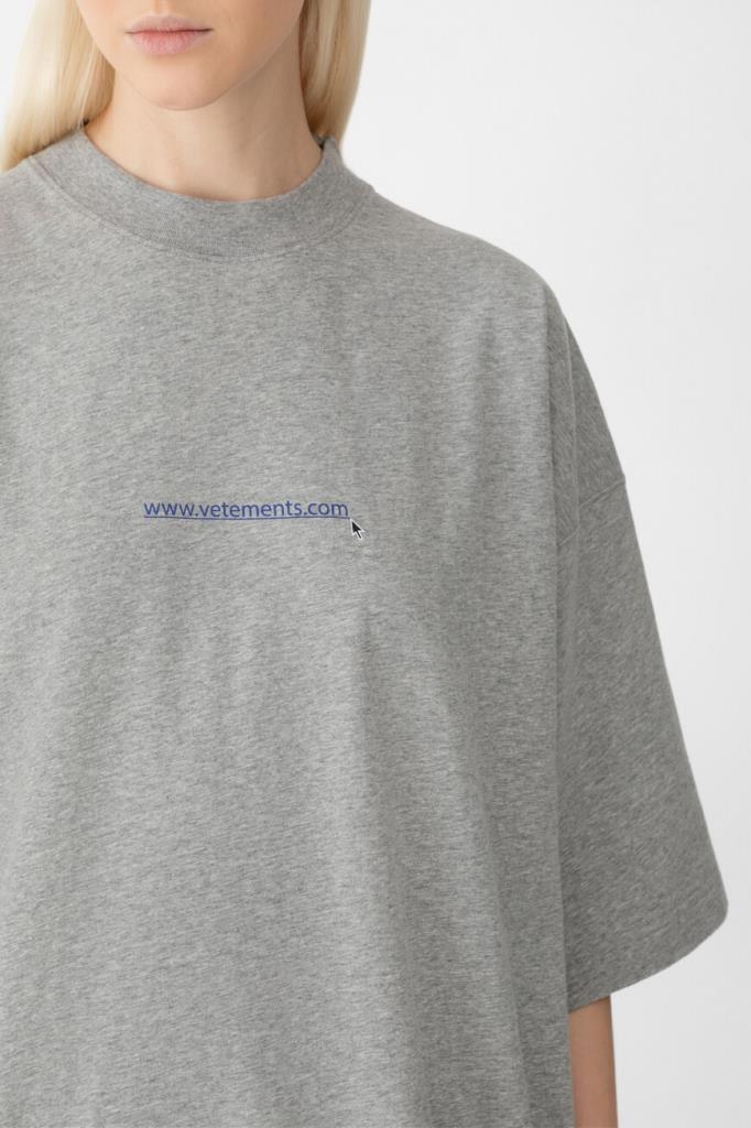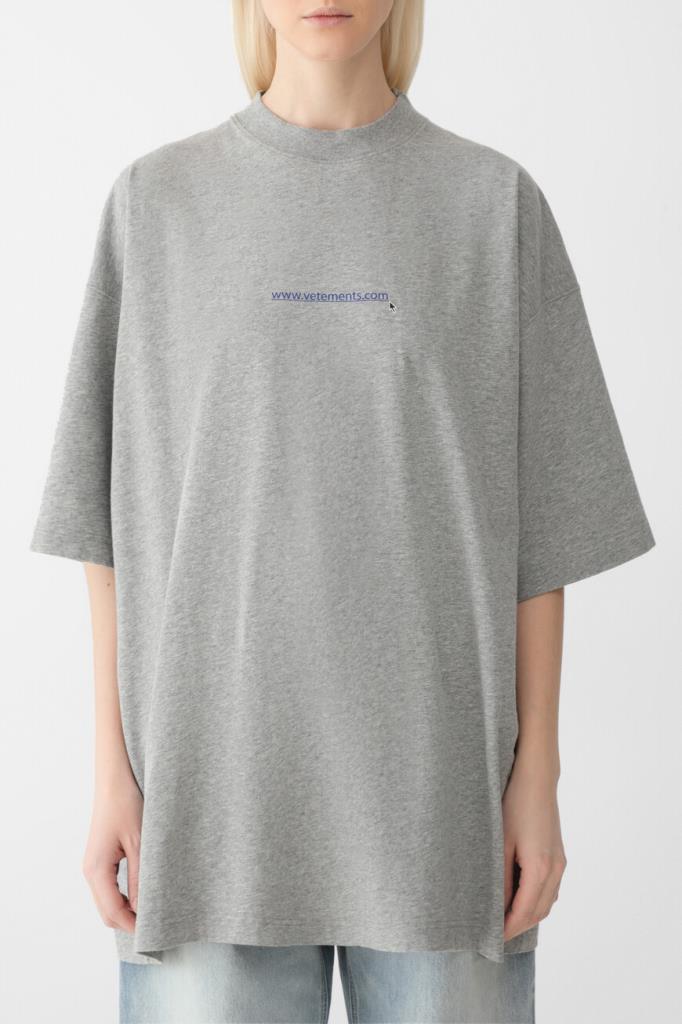 Меланжевая футболка с круглым вырезом горловины на резинке от VETEMENTS. Модель сшита из мягкого хлопкового джерси серого цвета и декорирована синим принтом в виде ссылки на официальный сайт магазина одежды со стрелкой на груди и вышитой тональной надписью-логотипом на спинке под воротником. Изделие отличается силуэтом оверсайз и заниженной линией плечевого шва.