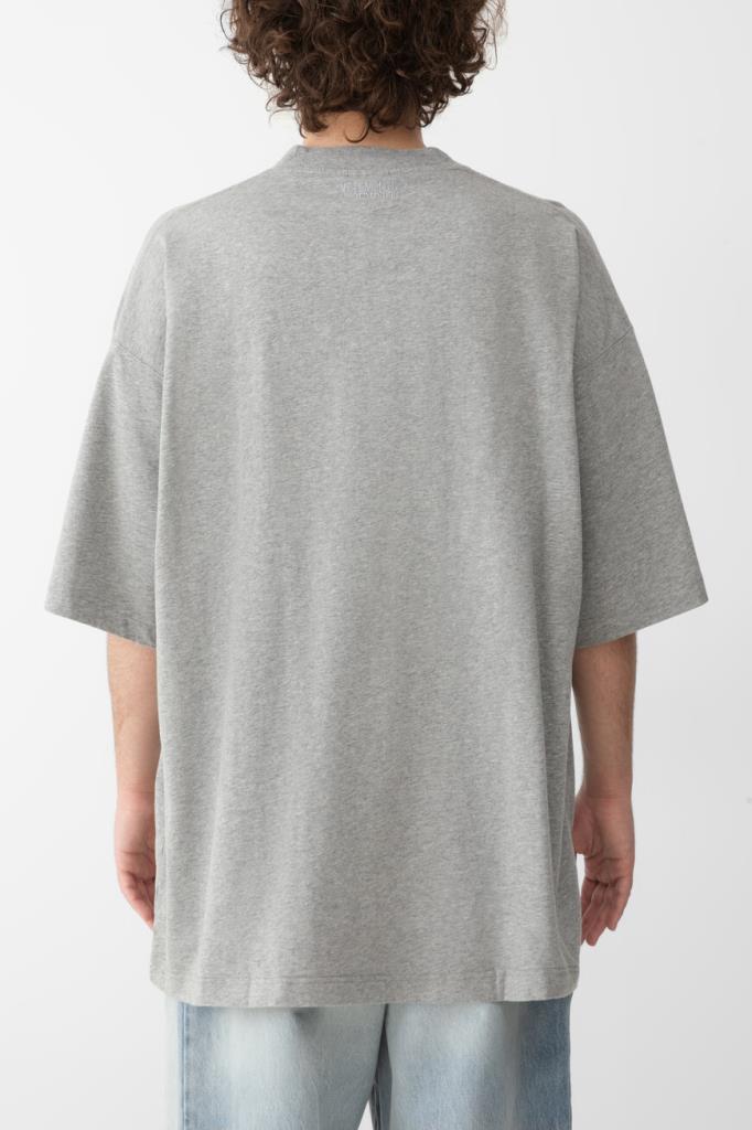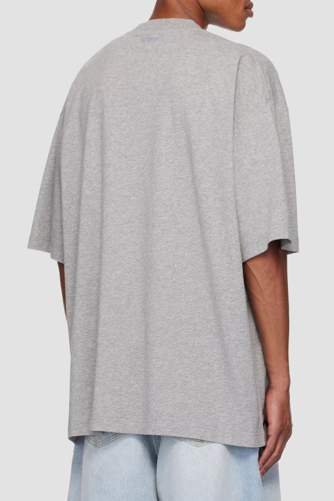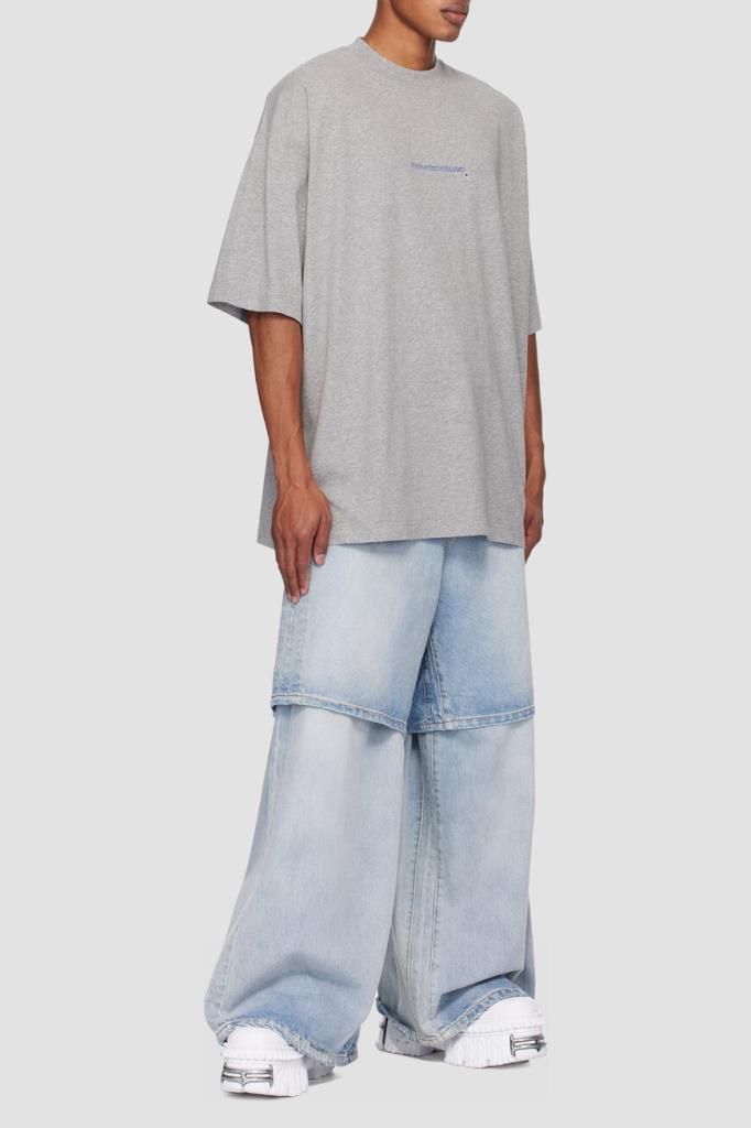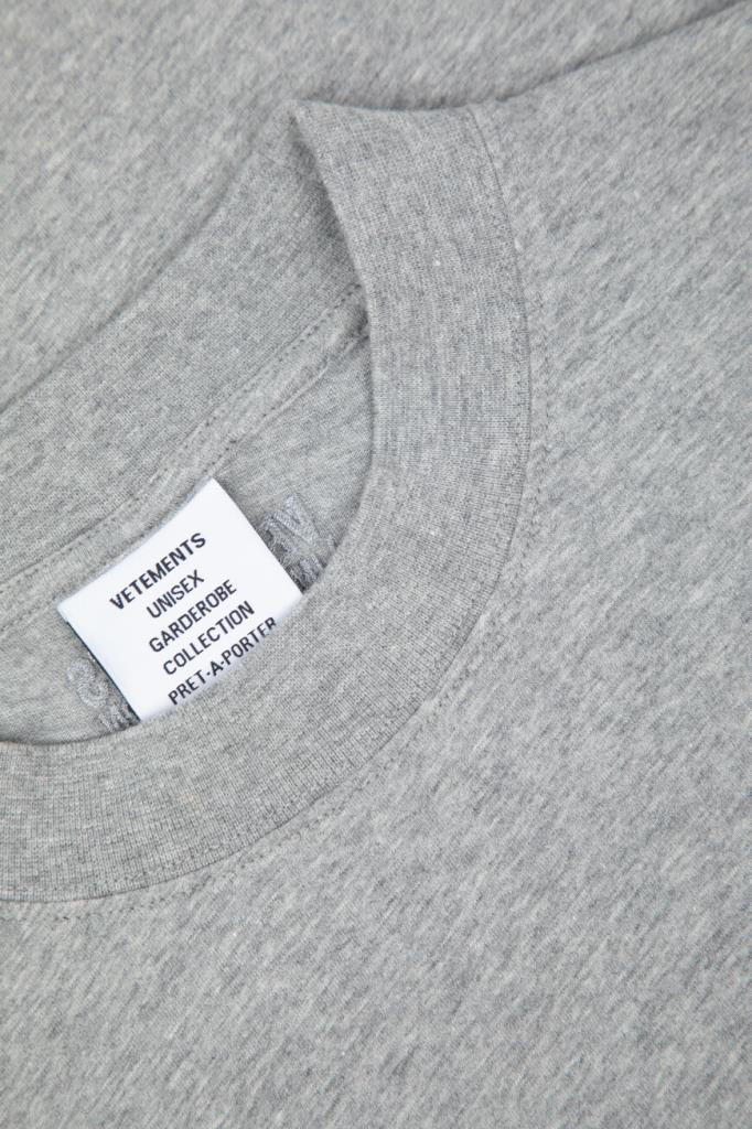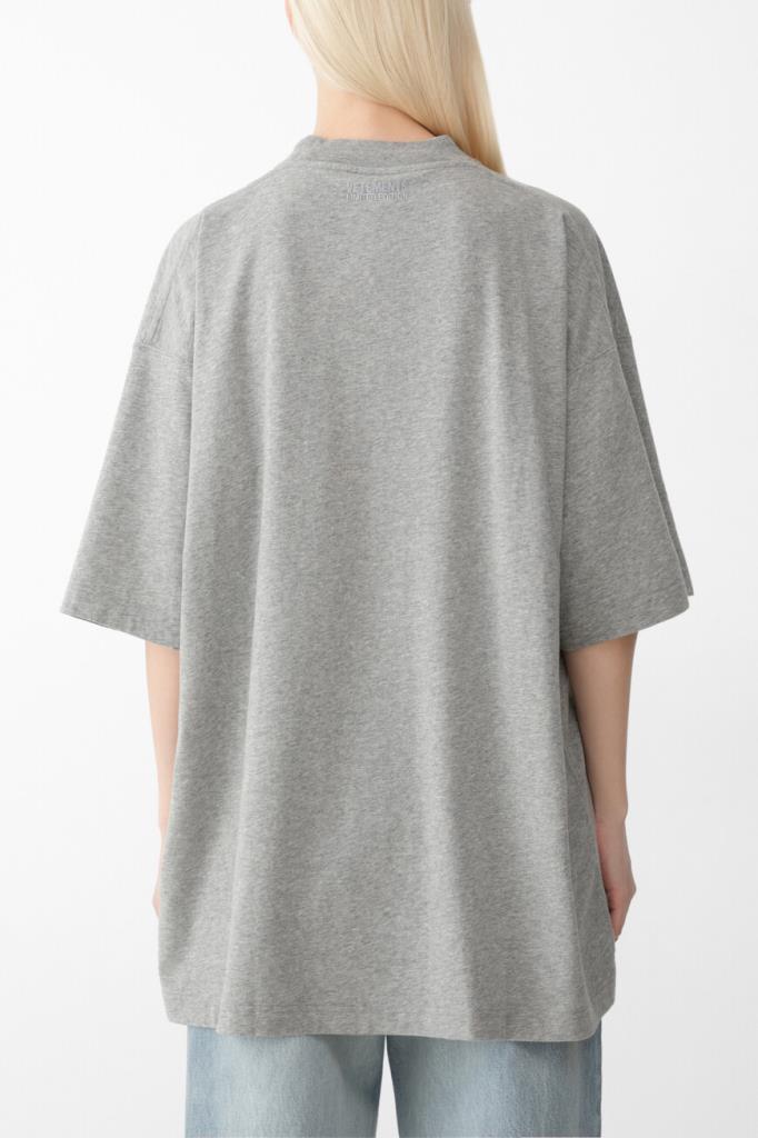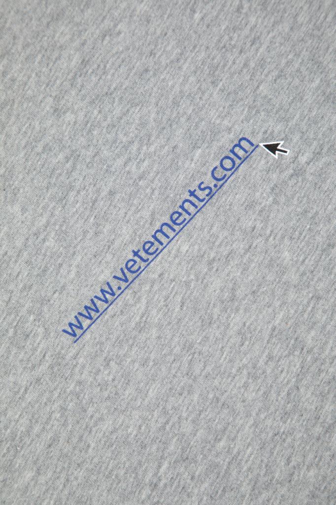 Меланжевая футболка с круглым вырезом горловины на резинке от VETEMENTS. Модель сшита из мягкого хлопкового джерси серого цвета и декорирована синим принтом в виде ссылки на официальный сайт магазина одежды со стрелкой на груди и вышитой тональной надписью-логотипом на спинке под воротником. Изделие отличается силуэтом оверсайз и заниженной линией плечевого шва.