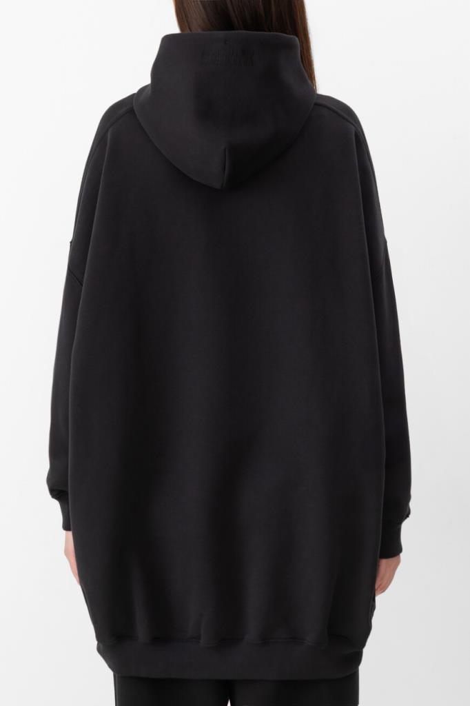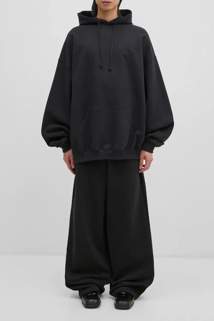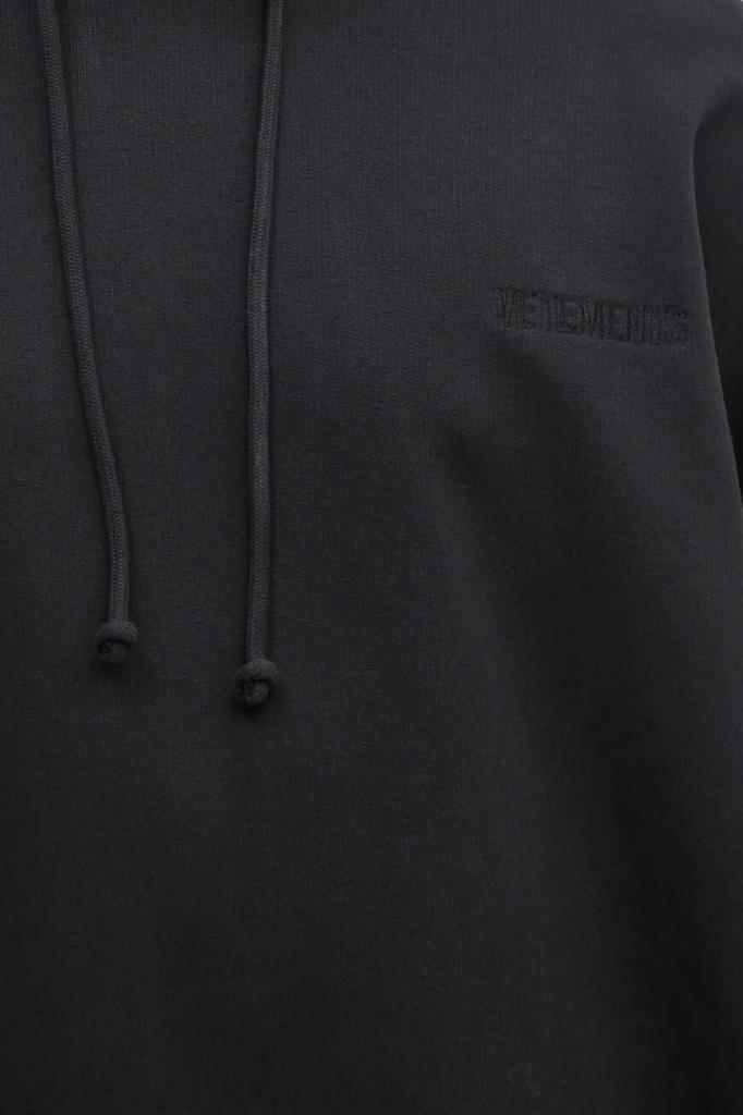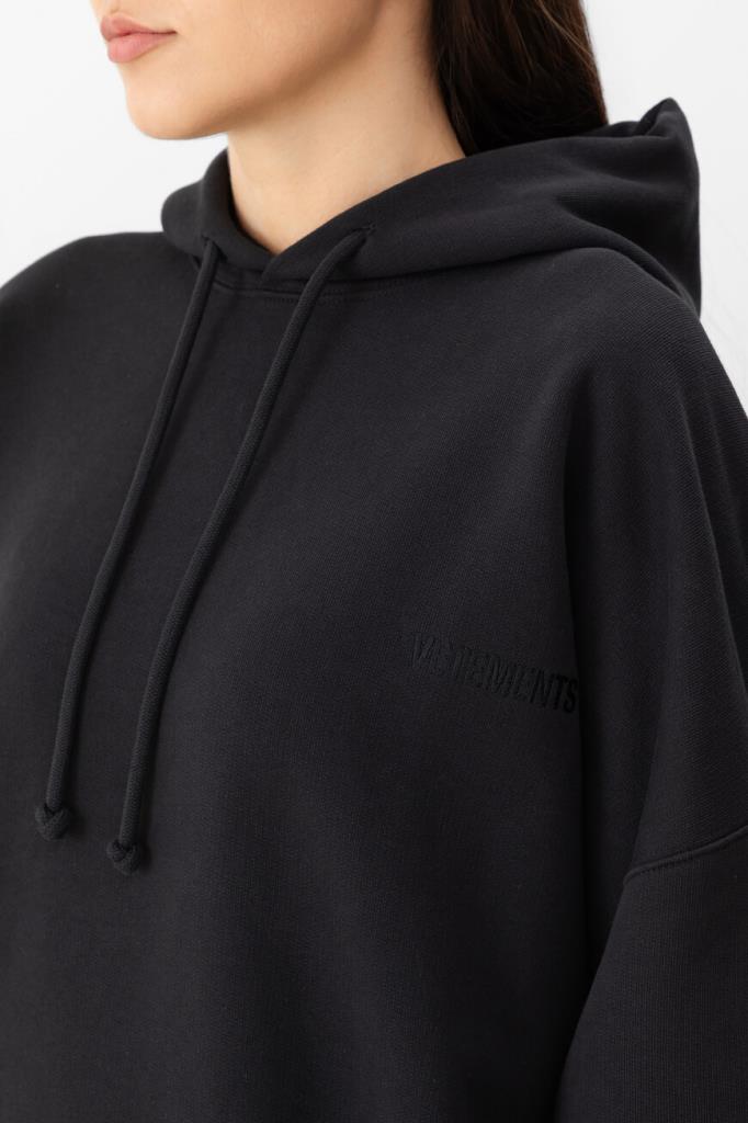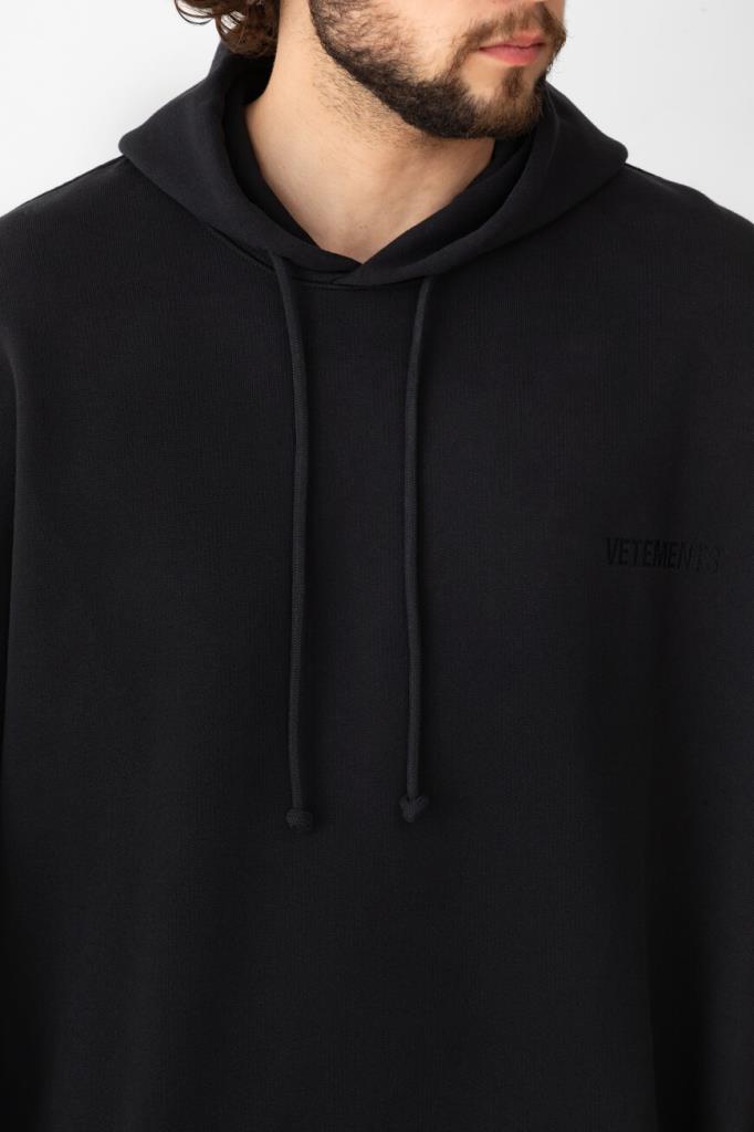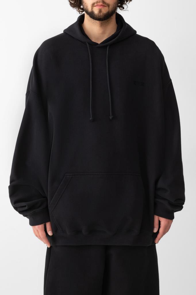 Худи чёрного цвета от VETEMENTS. Для создания изделия с приспущенной линией плечевого шва используется дышащий трикотаж на основе хлопка и полиэстера. Фасон модели характеризуется силуэтом oversize и наличием глубокого капюшона на завязках. Слева на груди вышит тональный логотип, а сзади на капюшоне размещена надпись «VETEMENTS Limited Edition». Дополнительный комфорт и удобство в носке обеспечивают широкий эластичный пояс и манжеты-резинки. Худи с практичным карманом-кенгуру станет основой Ваших повседневных ансамблей.
