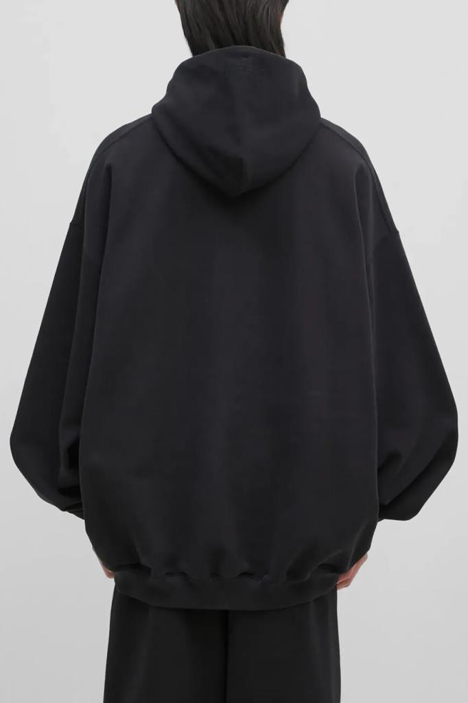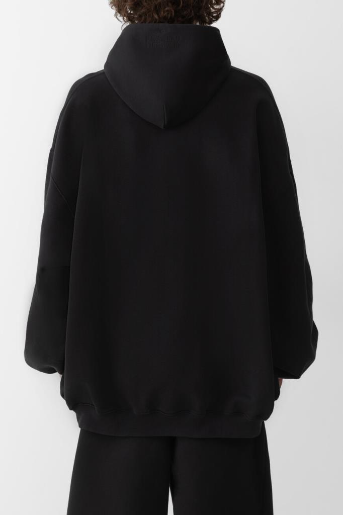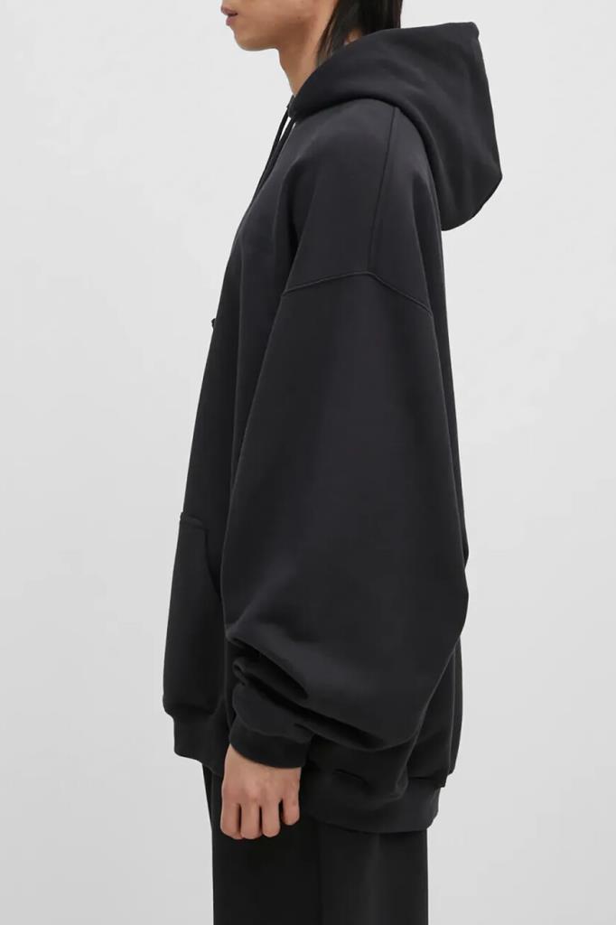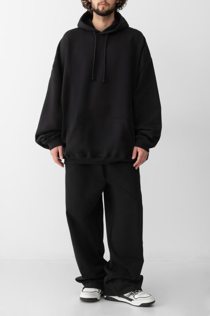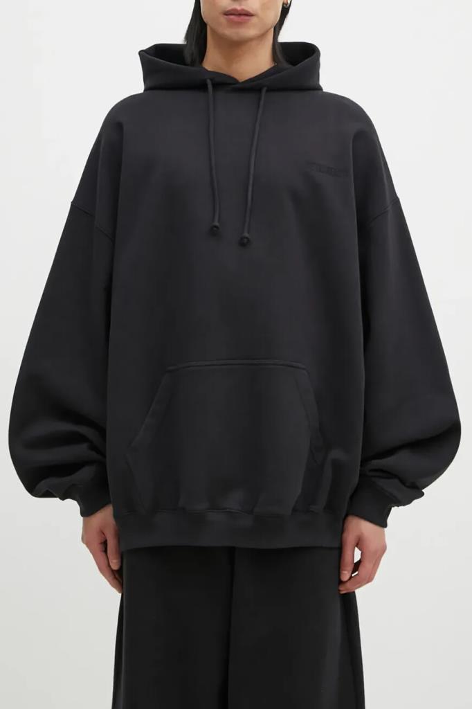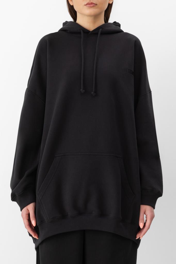 Худи чёрного цвета от VETEMENTS. Для создания изделия с приспущенной линией плечевого шва используется дышащий трикотаж на основе хлопка и полиэстера. Фасон модели характеризуется силуэтом oversize и наличием глубокого капюшона на завязках. Слева на груди вышит тональный логотип, а сзади на капюшоне размещена надпись «VETEMENTS Limited Edition». Дополнительный комфорт и удобство в носке обеспечивают широкий эластичный пояс и манжеты-резинки. Худи с практичным карманом-кенгуру станет основой Ваших повседневных ансамблей.