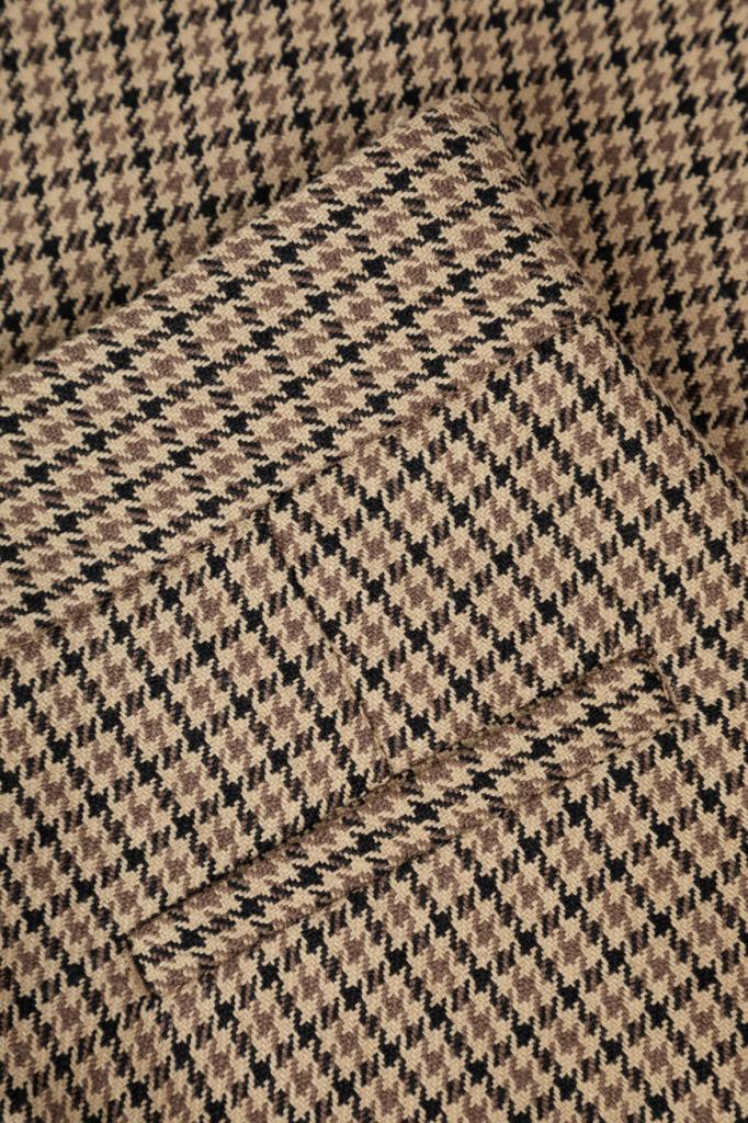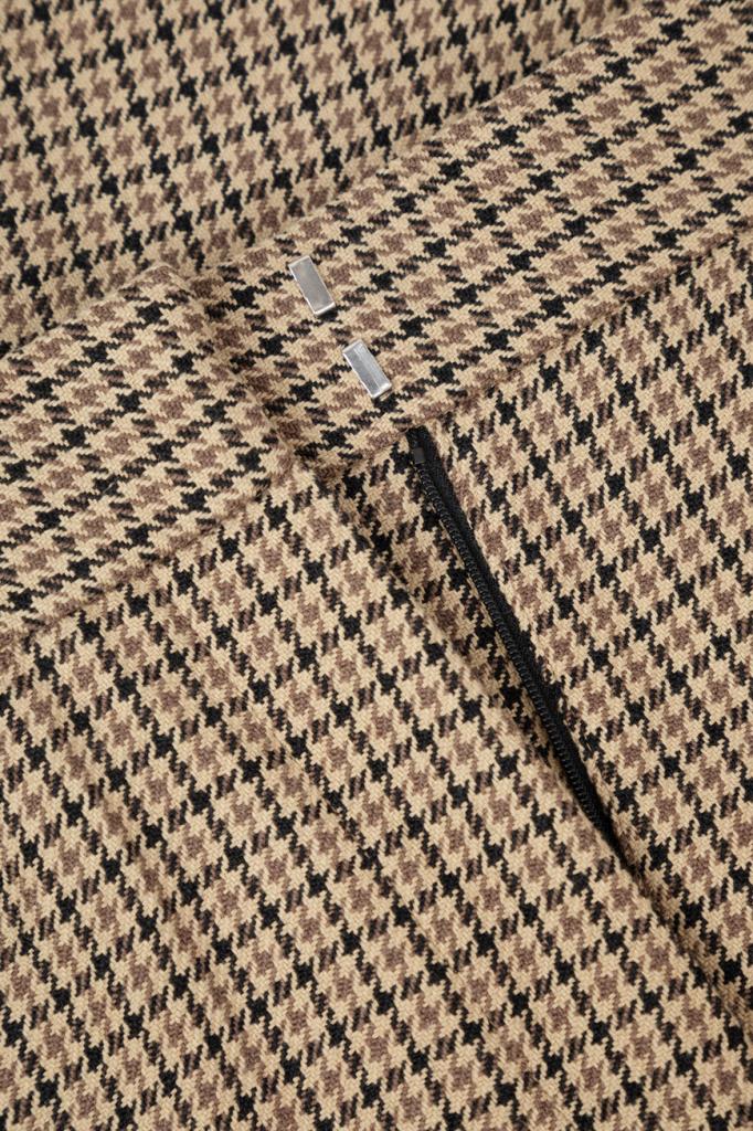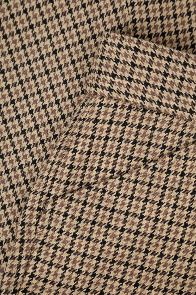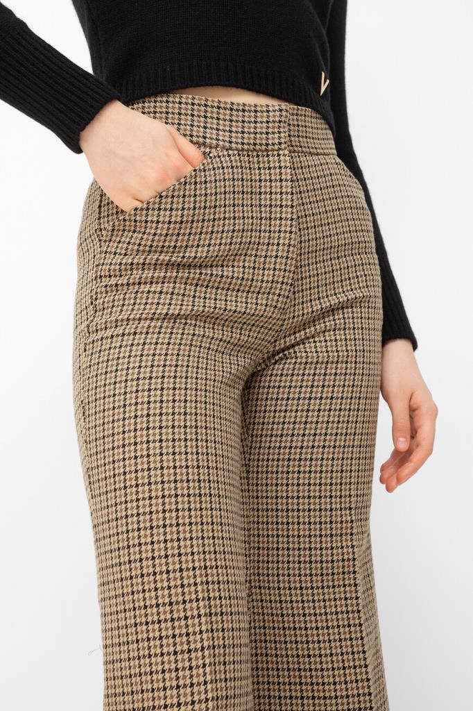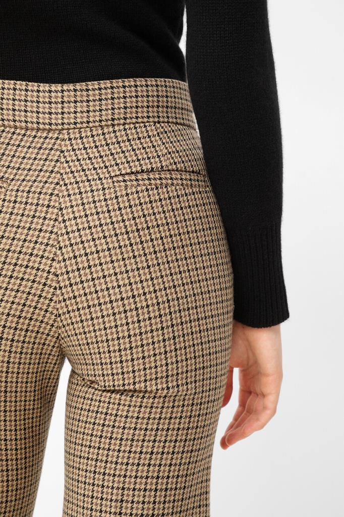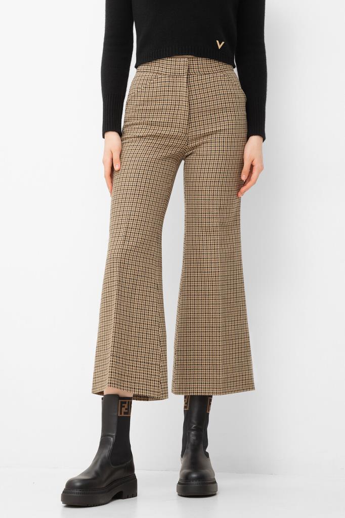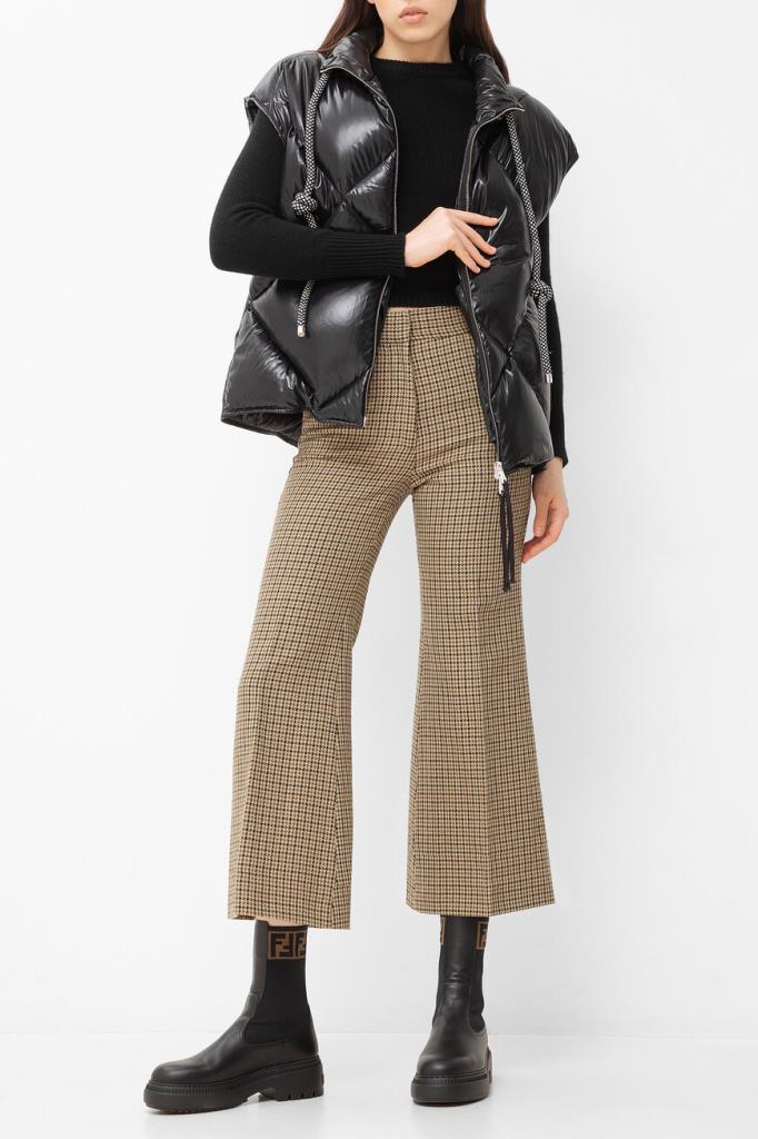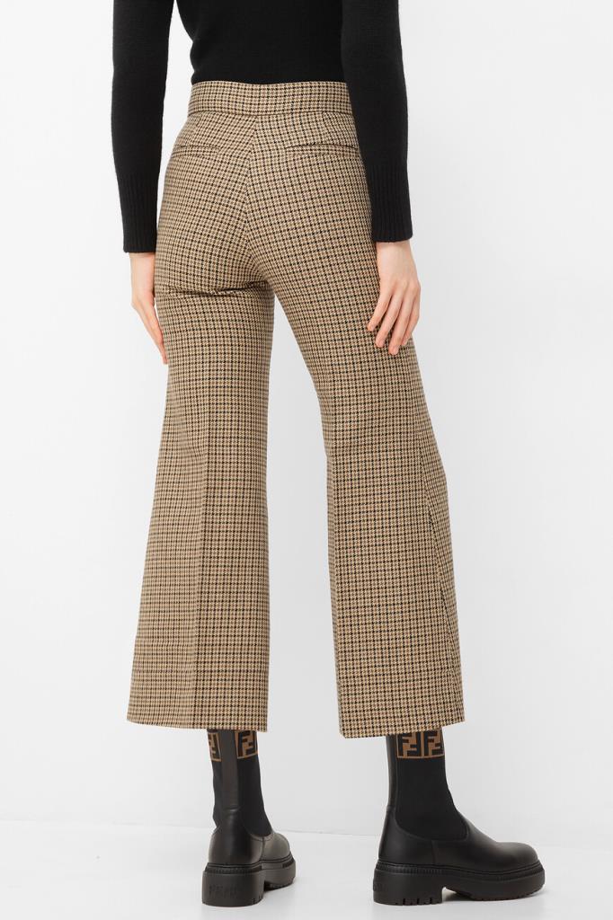 Женские брюки Moncler из мягкой шерсти virgin с добавлением хлопка. Тёплая ткань с узором в гусиную лапку. Укороченная расклешенная модель со стрелками, завышенной талией и четырьмя карманами.
