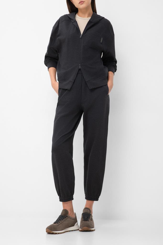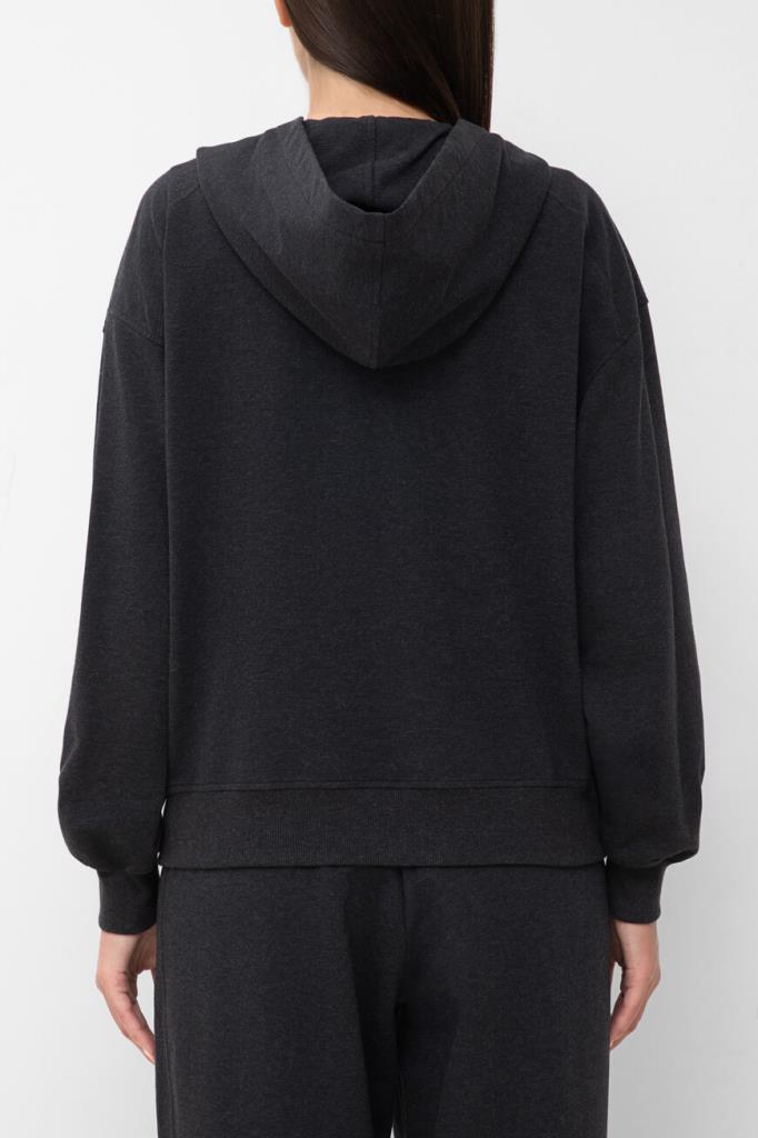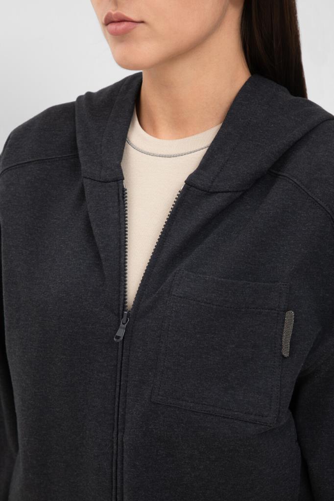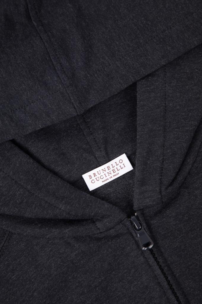 Толстовка BRUNELLO CUCINELLI с тремя карманами. Изделие из линейки Travelwear, предназначенной для отдыха и свободного времени, сшито из лёгкого хлопкового футера с добавлением эластичных волокон. Модель в стиле Active, выполненная в тёмно-сером оттенке, оснащена застёжкой на встречную молнию с двумя бегунками и дополнена объёмным капюшоном. Дизайн толстовки завершает изящная деталь-петля, вышитая из рядов тонких нитей блестящей цепочки Мониль и расположенная на нагрудном кармане. Образ можно дополнить джоггерами Track из той же коллекции.