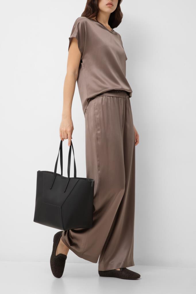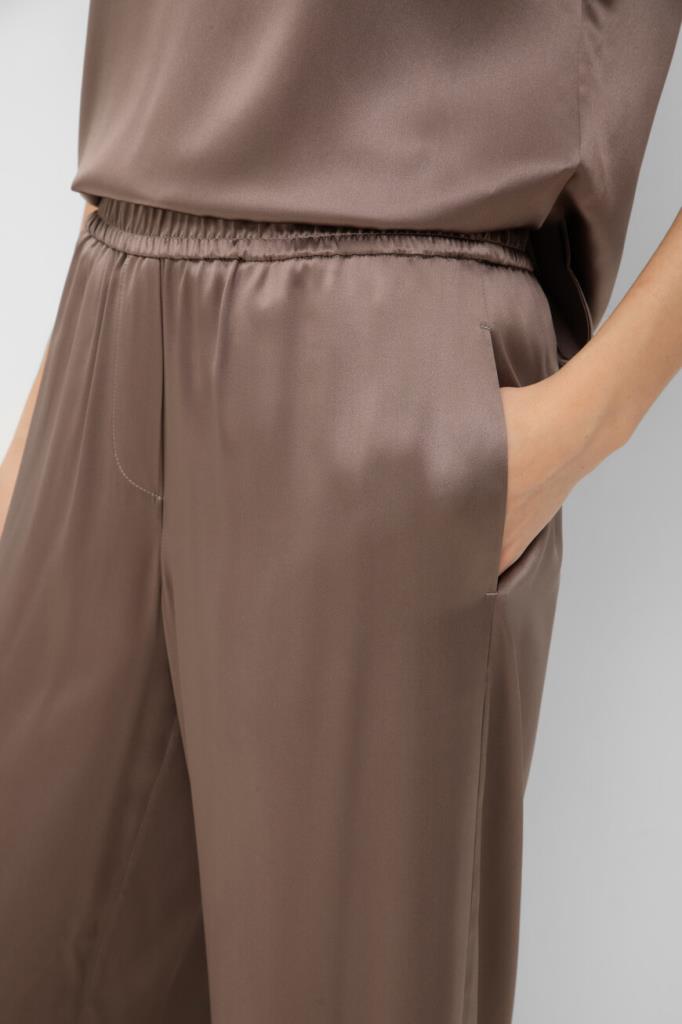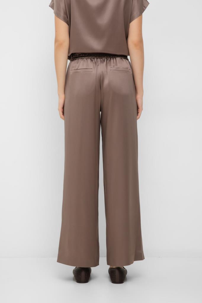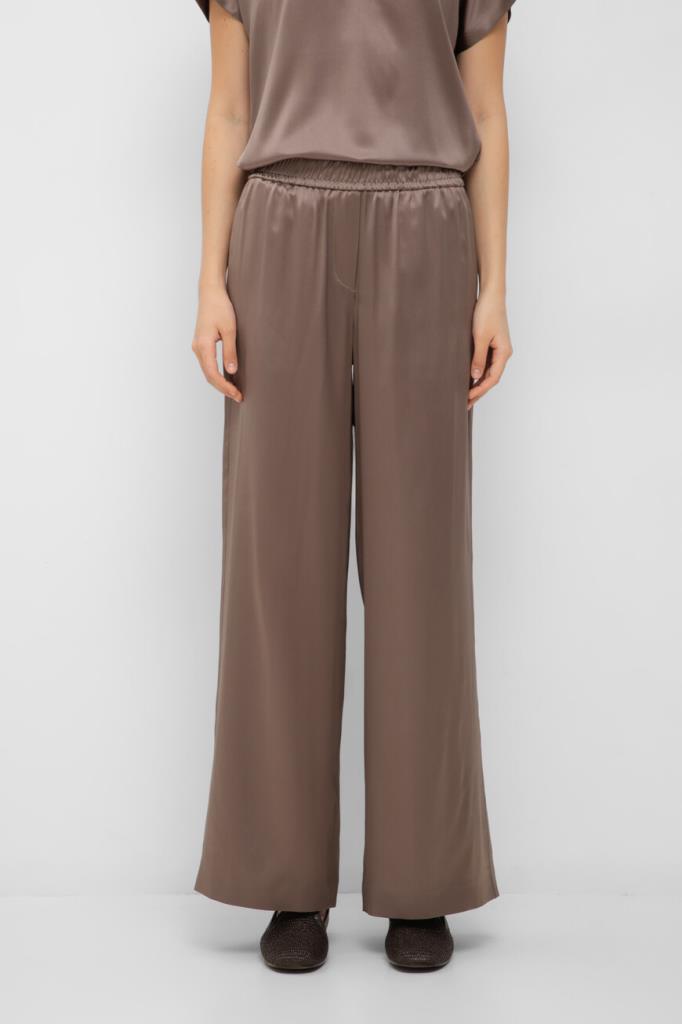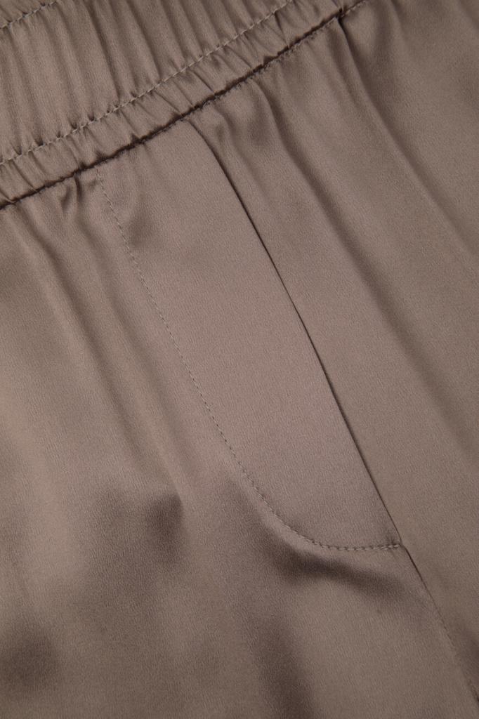 Брюки BRUNELLO CUCINELLI из эластичного шелкового атласа в оттенке какао. Модель Track объединяет женственную элегантность и свободные формы. Характерная струящаяся и переливчатая текстура ткани подчёркивает мягкий силуэт и обеспечивает особенно комфортную носку. Широкий эластичный пояс-резинка завершает дизайн изделия и придаёт ему неформальную ноту.