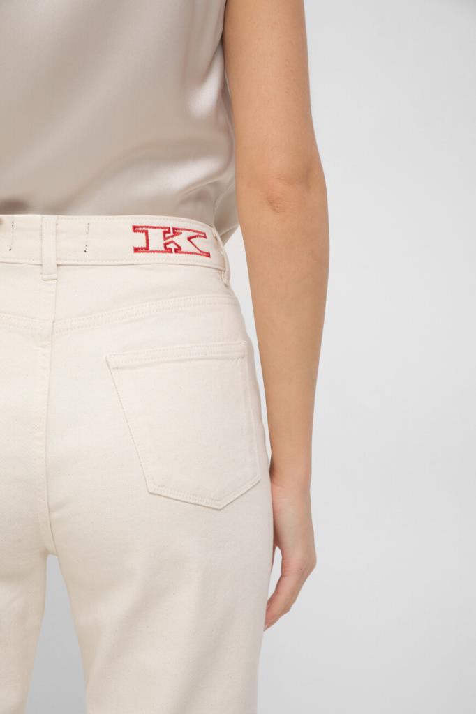 Укороченные джинсы из эластичного хлопкового денима от бренда Kiton. Повседневная модель цвета слоновой кости застёгивается на потайную молнию и брендированную эмалированную пуговицу и отличается культовым ярко-красным декором: вышитыми литерами «K» на маленьком кармане спереди и поясе сзади и стежками на шлевках спереди. Изделие с высокой посадкой по линии талии станет основой Ваших casual-комплектов.