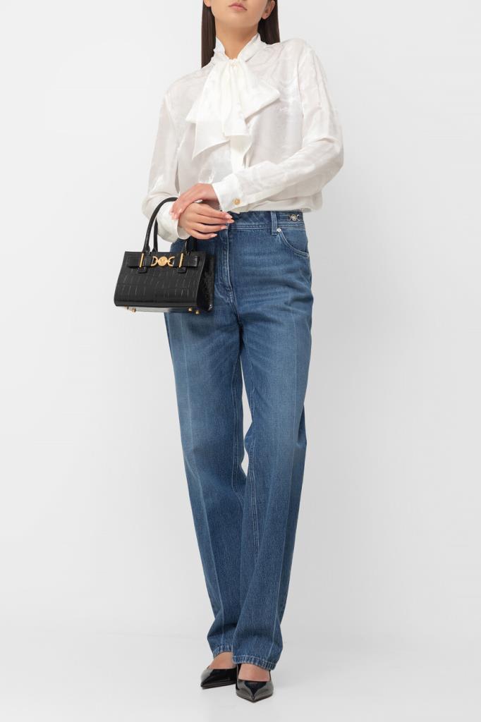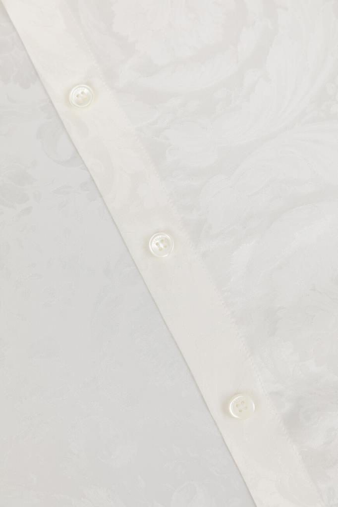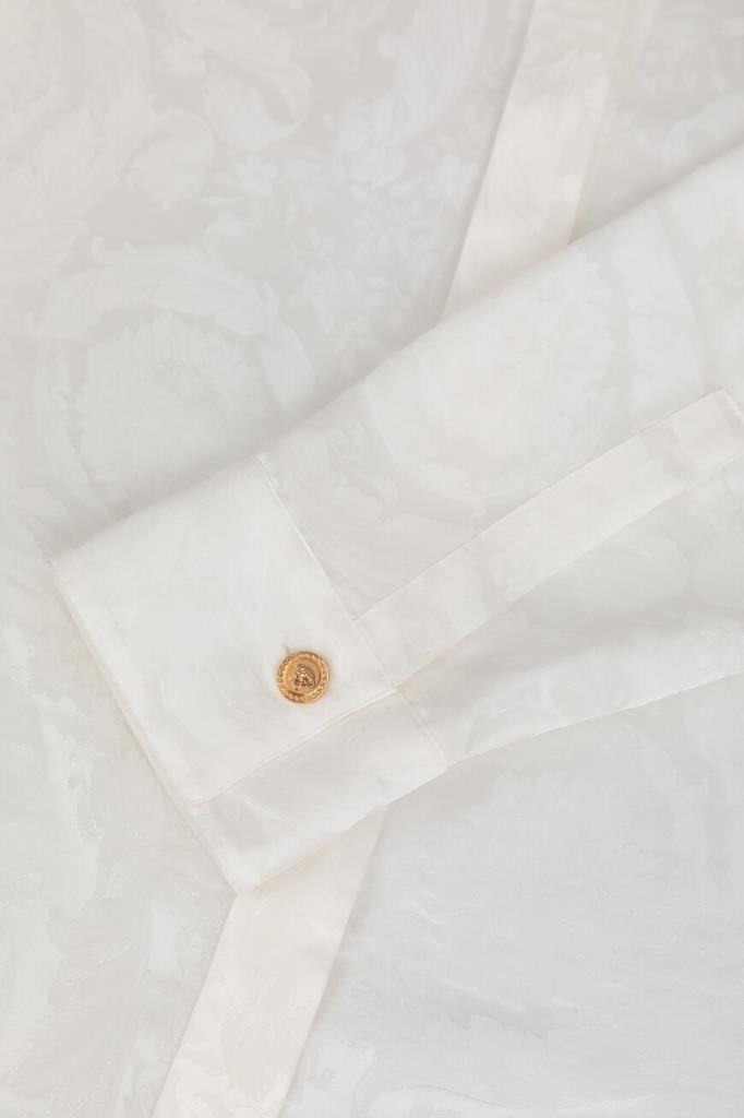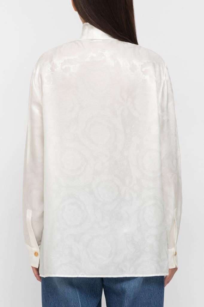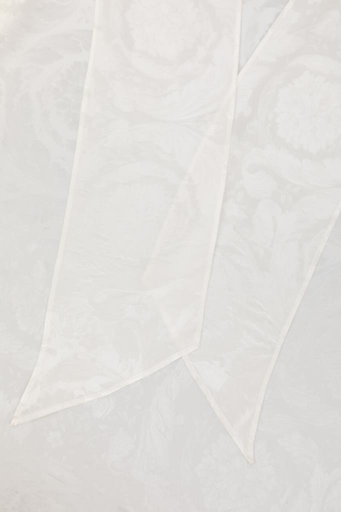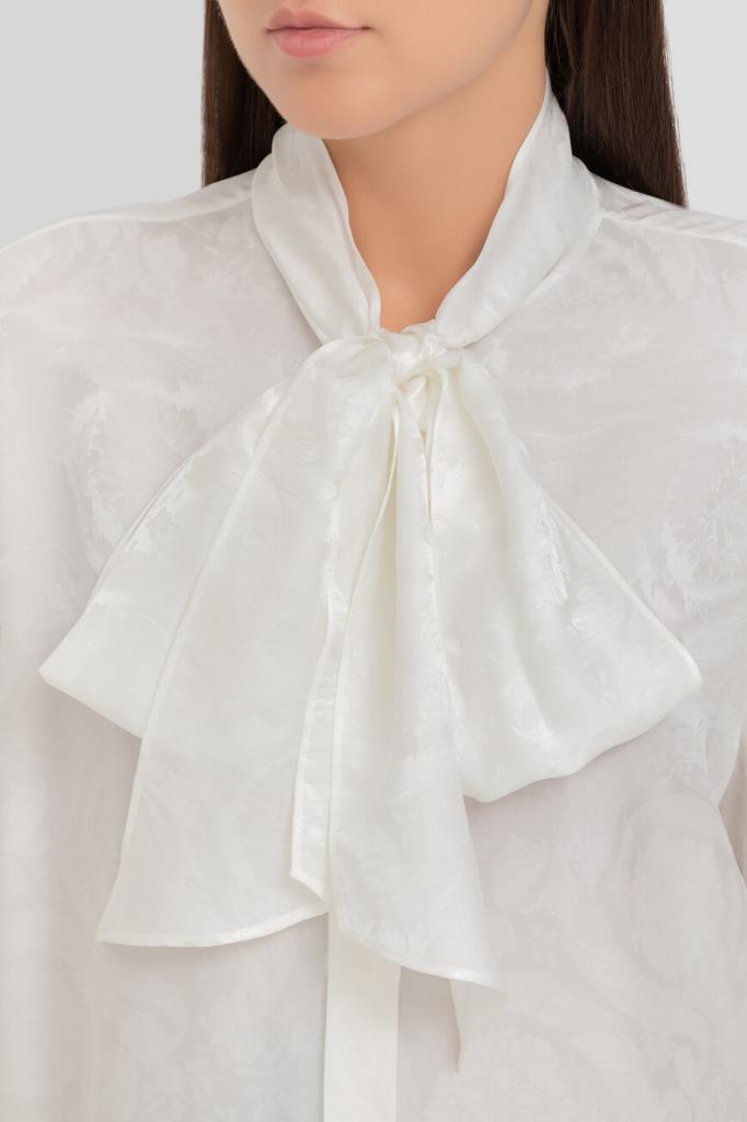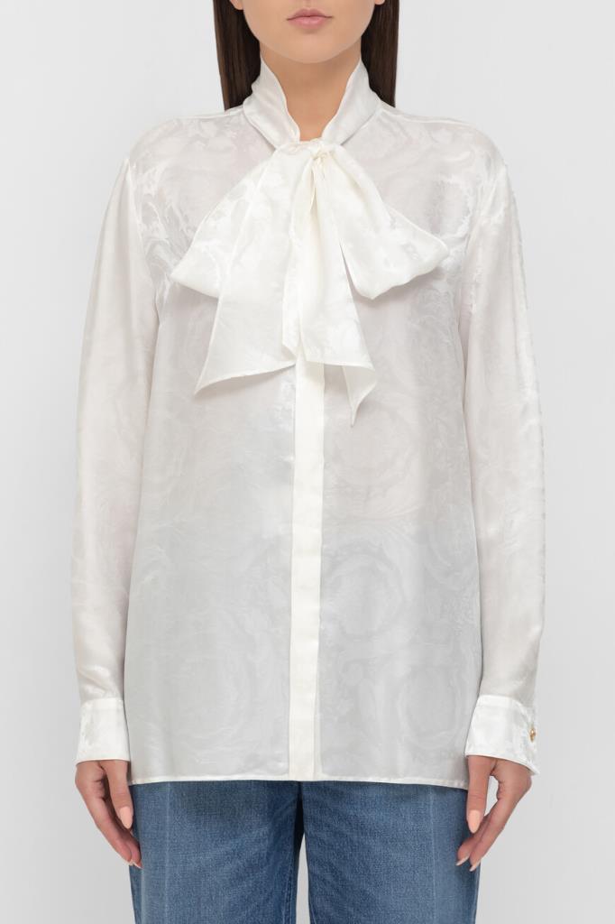 Струящаяся рубашка VERSACE белого цвета с жаккардовым мотивом Barocco. Изделие с длинными рукавами выполнено на основе шёлка и прочного вискозного волокна. Модель декорирована тональным принтом и оснащена невысоким воротником аскот с крупным бантом. Блуза прямого силуэта добавит любому образу романтичную ноту.