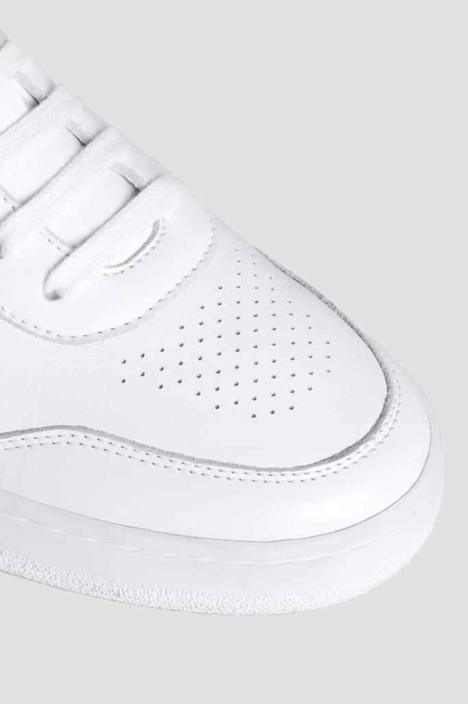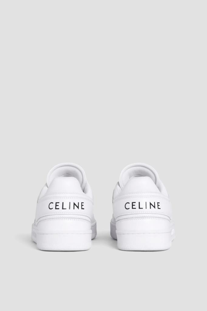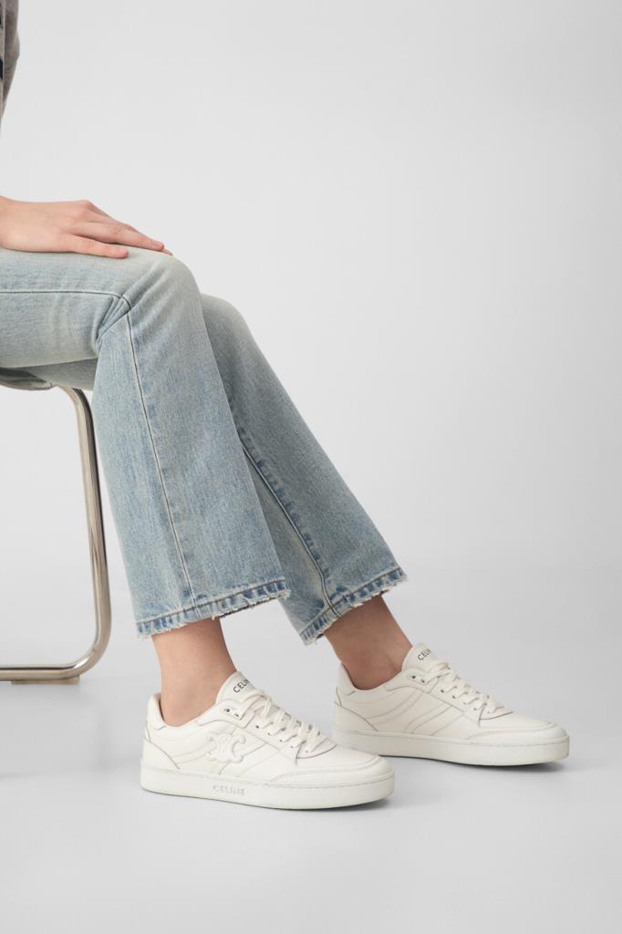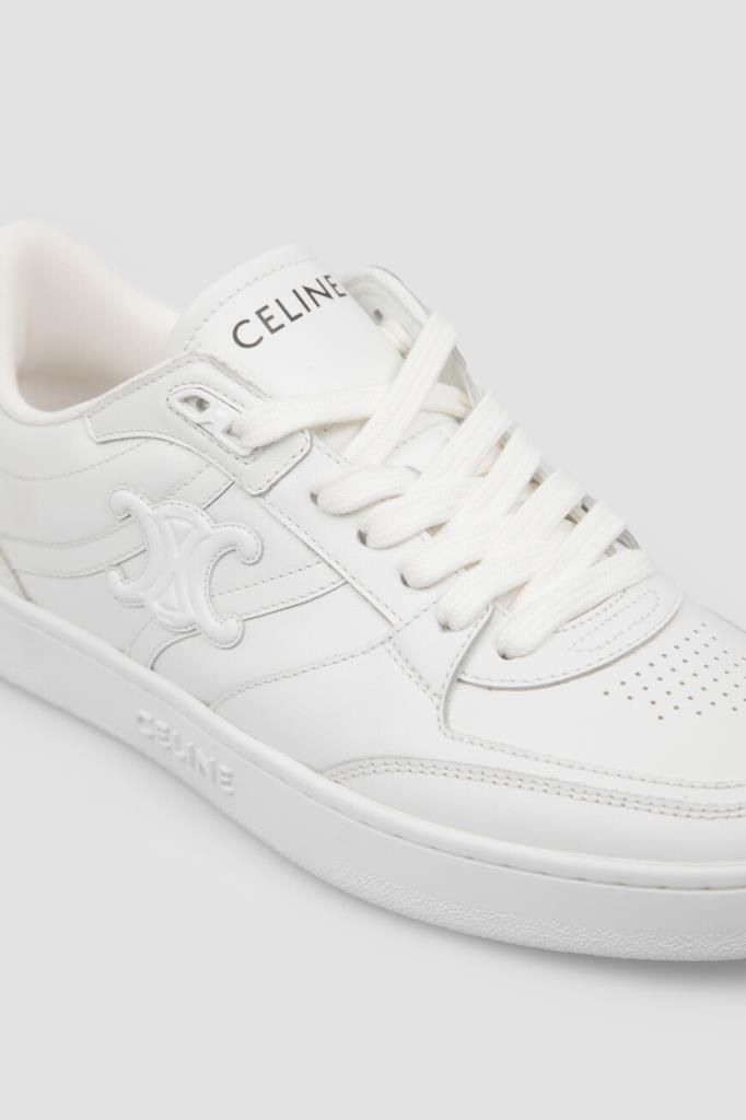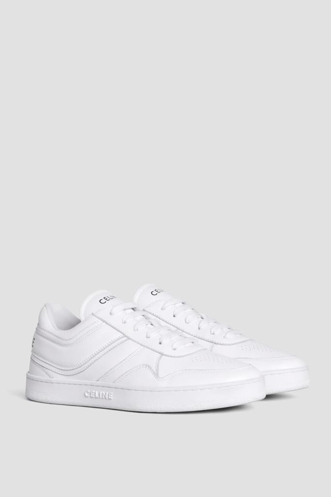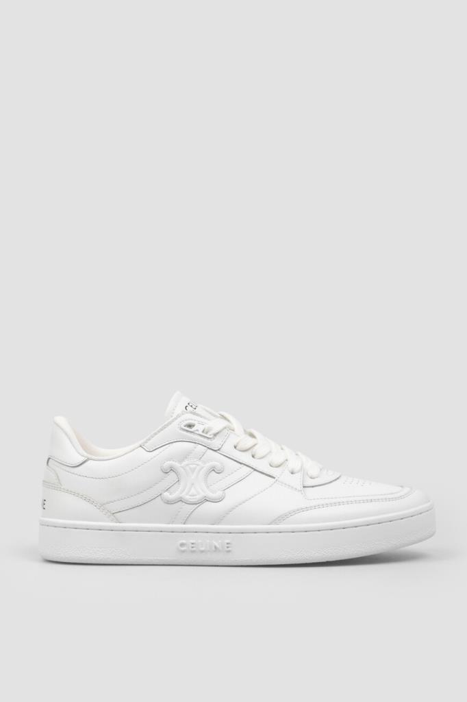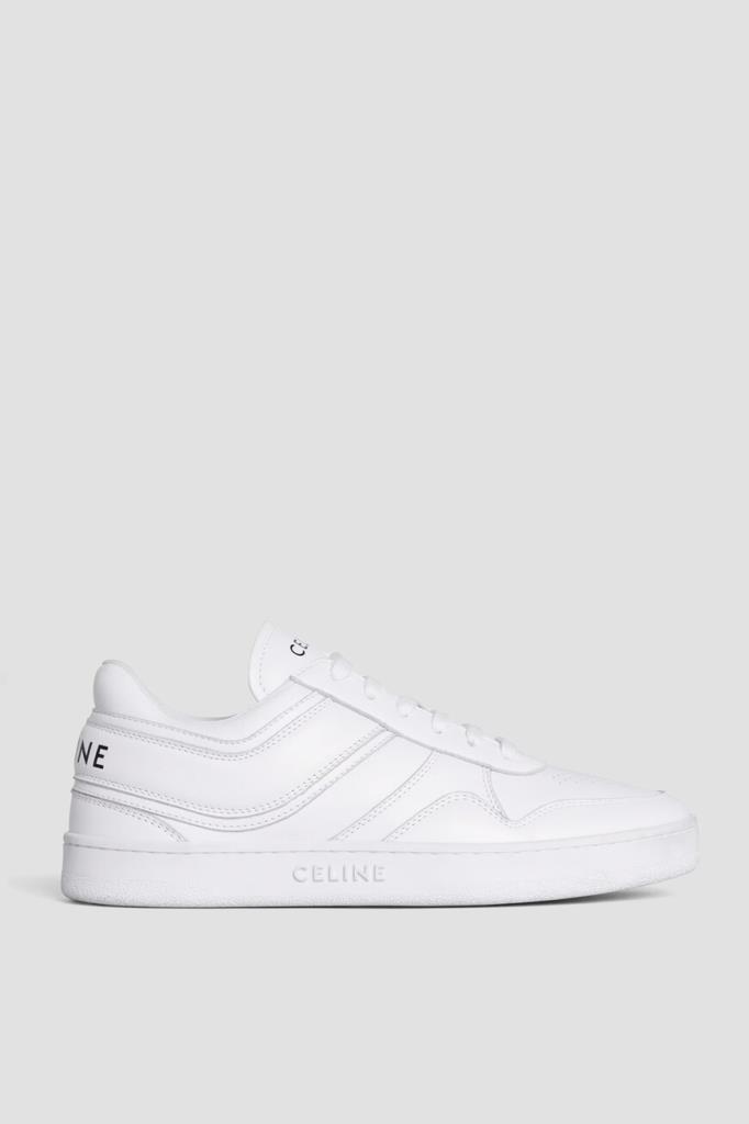 Белые сникеры Trainer из мягкой кожи телёнка от CELINE. Отличительными деталями являются рельефный узор в виде полос на боковинах и заднике, крупный контрастный лого Дома в задней части, перфорация на носке и рельефный логотип сбоку на подошве. Пара оснащена закрытой шнуровкой и дополнена внутренней отделкой из плотного текстиля в тон.