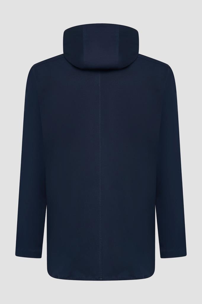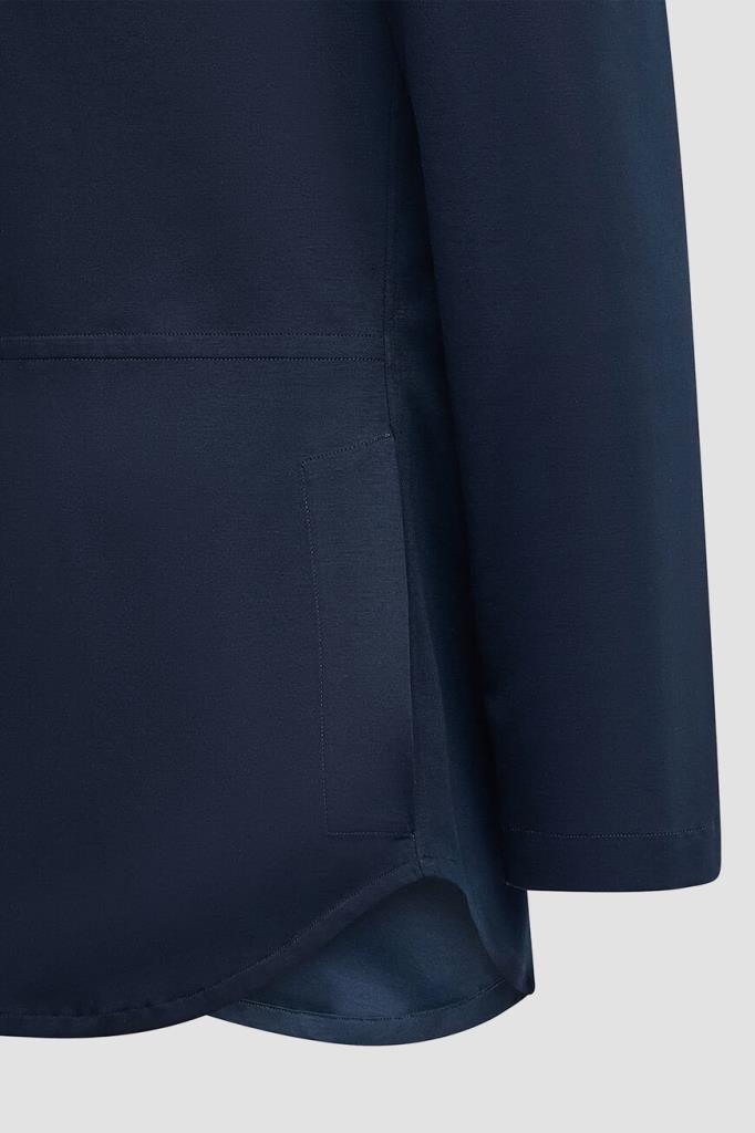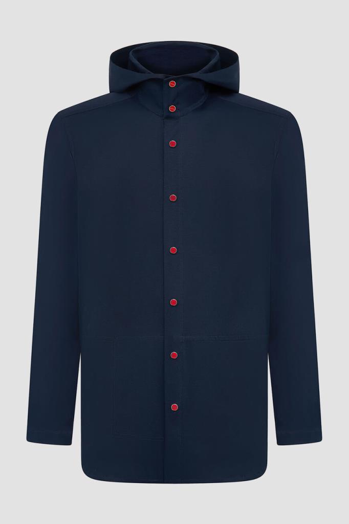 Тёмно-синяя рубашка Kiton с закруглёнными боковыми разрезами. Модель изготовлена из мягкого хлопкового трикотажа и оснащена двумя крупными боковыми карманами. Принадлежность повседневного изделия Дому деликатно обозначена выгравированным логотипом на металлических клёпках с ярко-красным эмалированным центром. Благодаря наличию глубокого капюшона рубашка станет хорошей альтернативой лёгкой куртке в образах на ветреную погоду.