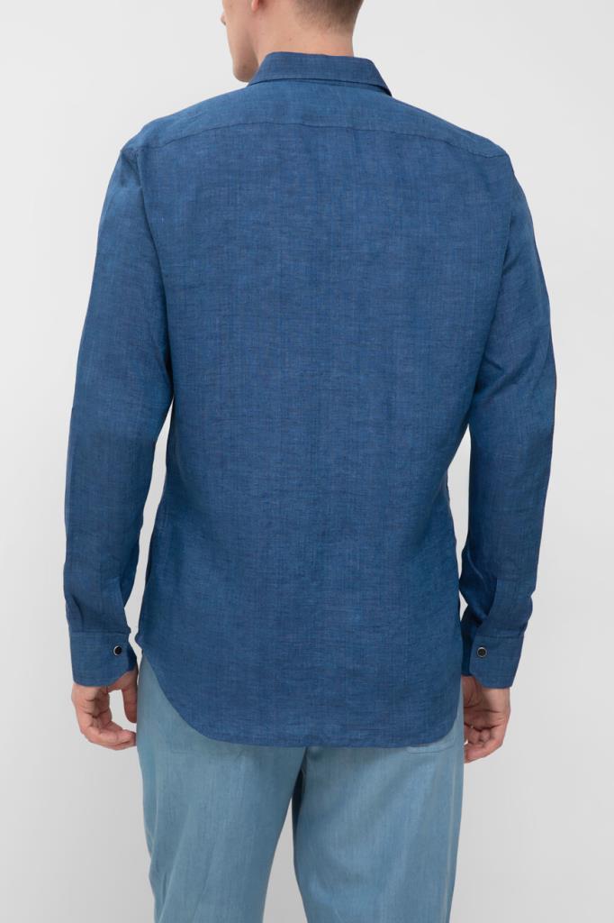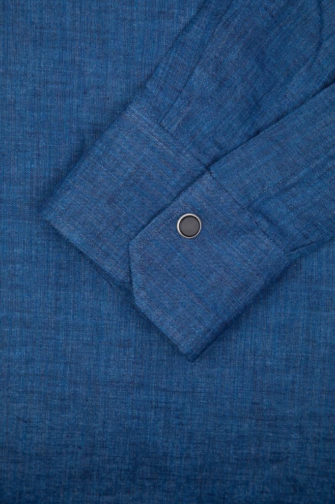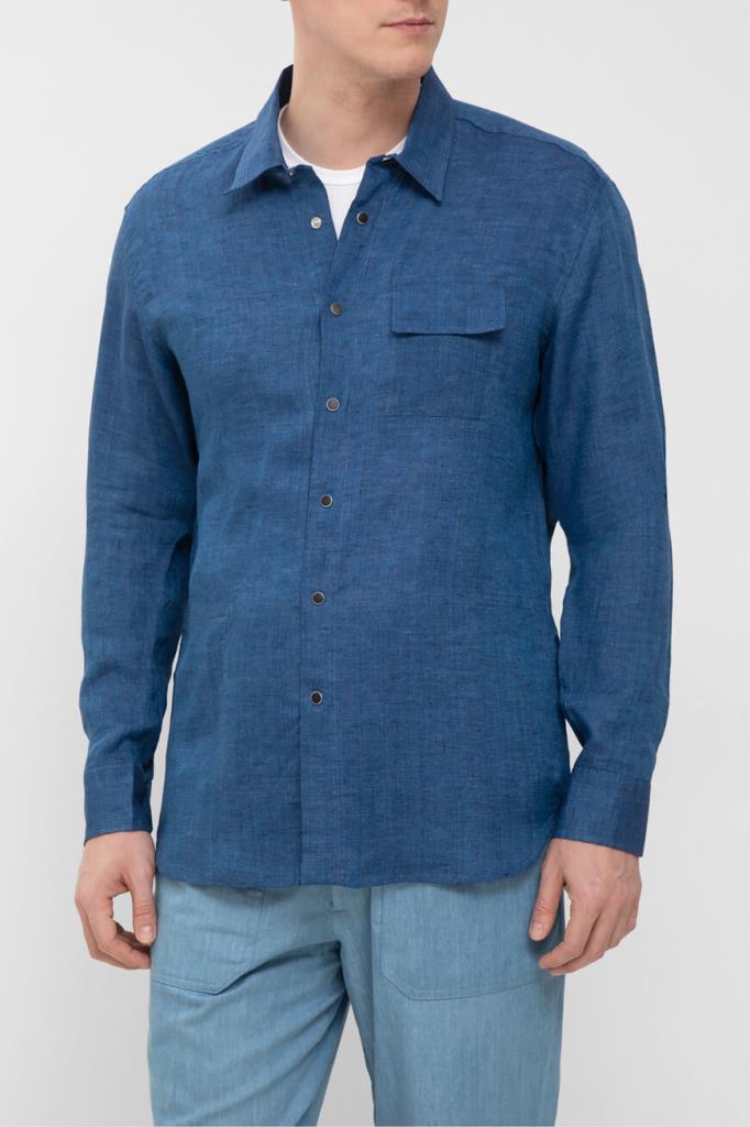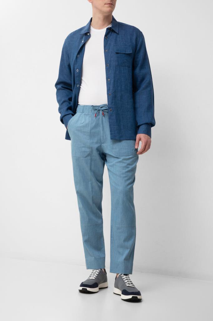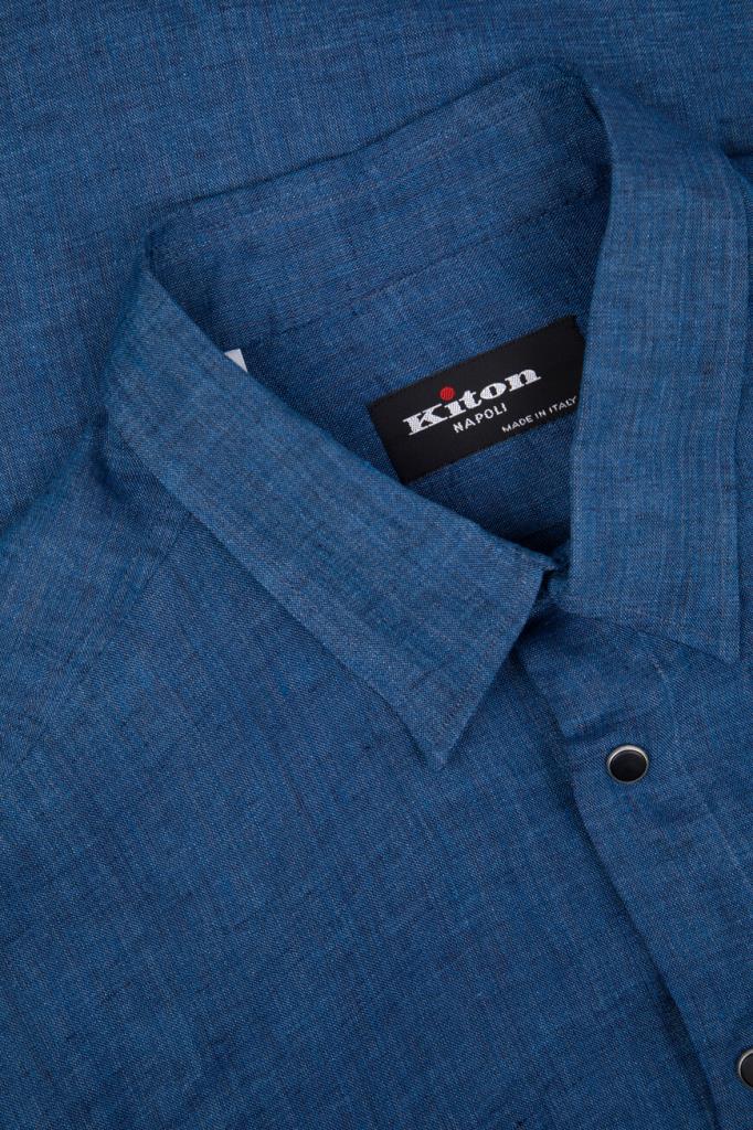 Льняная рубашка Kiton на клёпках с чёрным матовым центром. Изделие с длинными рукавами окрашено в синий оттенок и дополнено закруглённым низом, обеспечивающим дополнительный комфорт и удобство в носке. Отличительной деталью является небольшой накладной карман с клапаном слева на груди. Модель можно носить поверх белой футболки в образе с голубыми брюками на кулиске из той же коллекции.