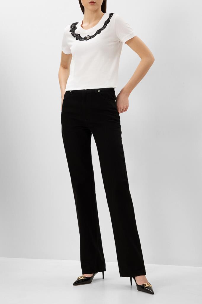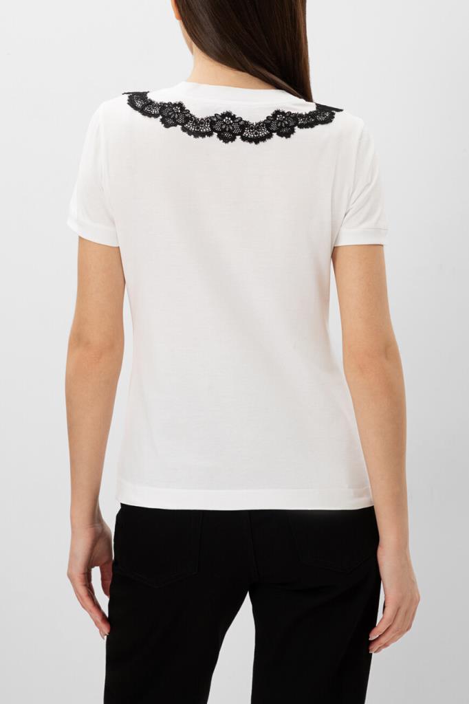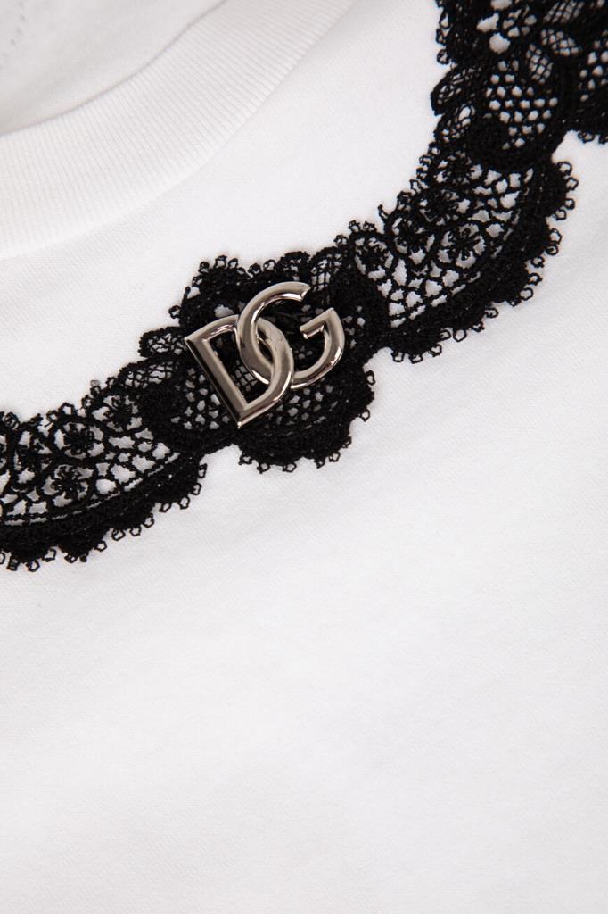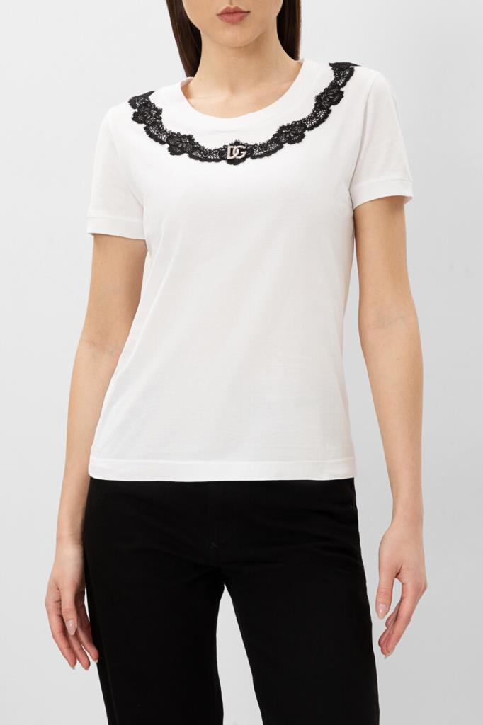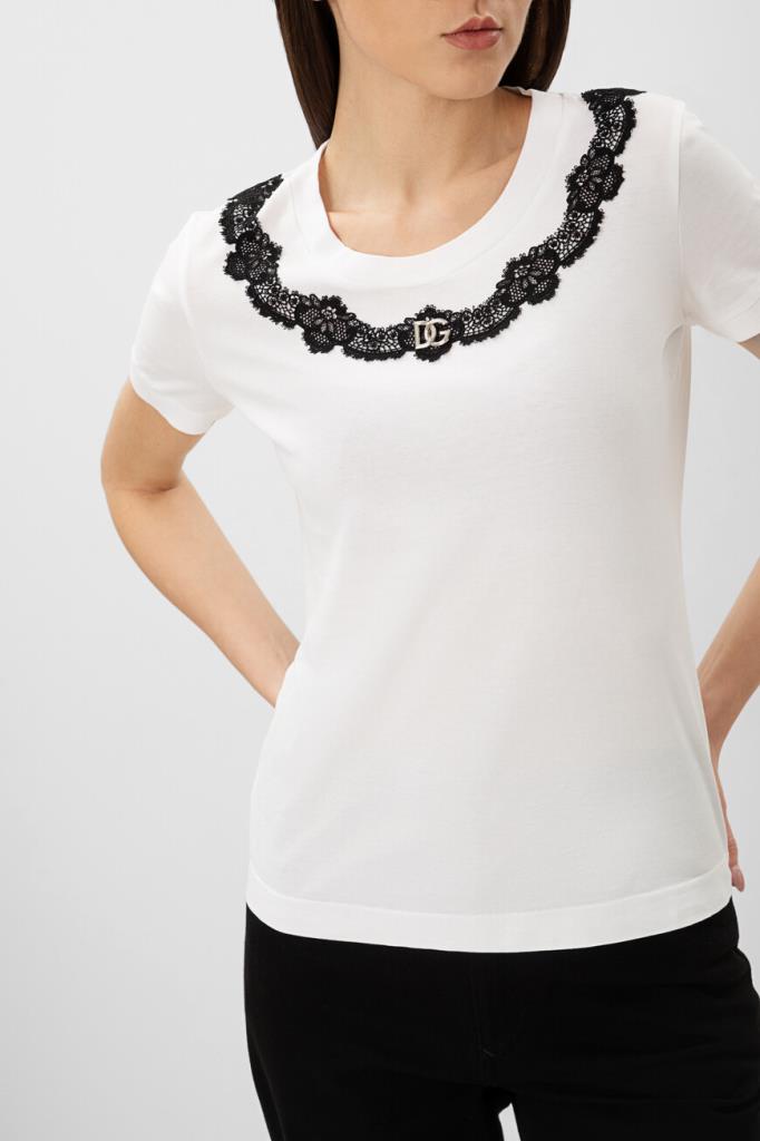 Хлопковая футболка белого цвета от Dolce & Gabbana. Декором выступает чёрная кружевная вставка-полоса спереди и сзади сверху выше уровня груди, повторяющая изгиб воротника (по кругу) и дополненная перекрёстным металлическим лого-монограммой бренда спереди. Модель прямого, слегка облегающего кроя станет основой Вашего повседневного образа.