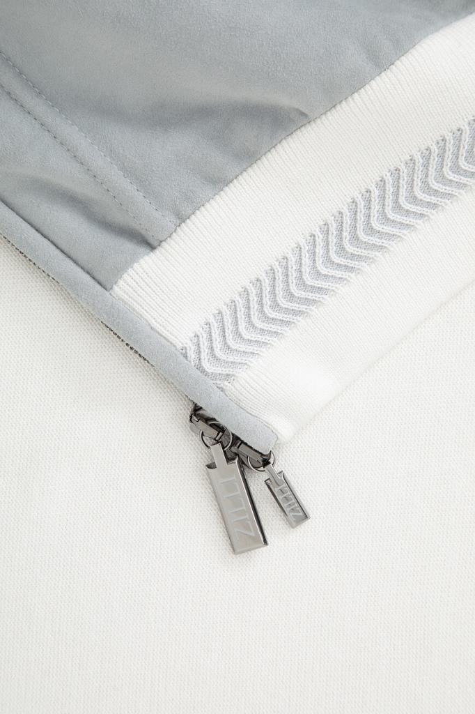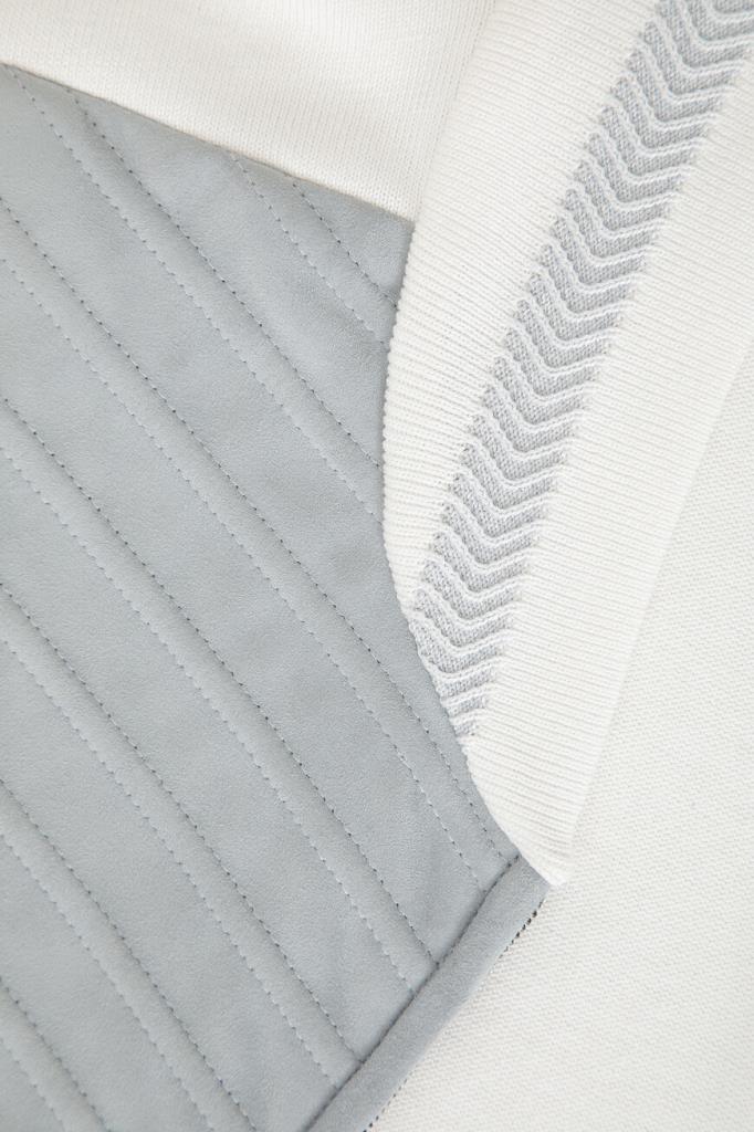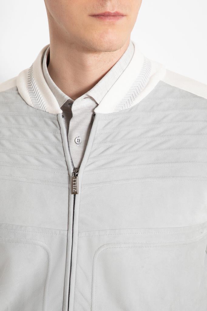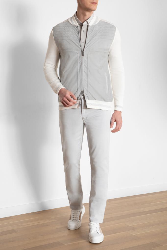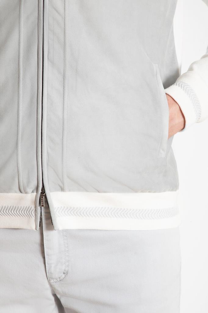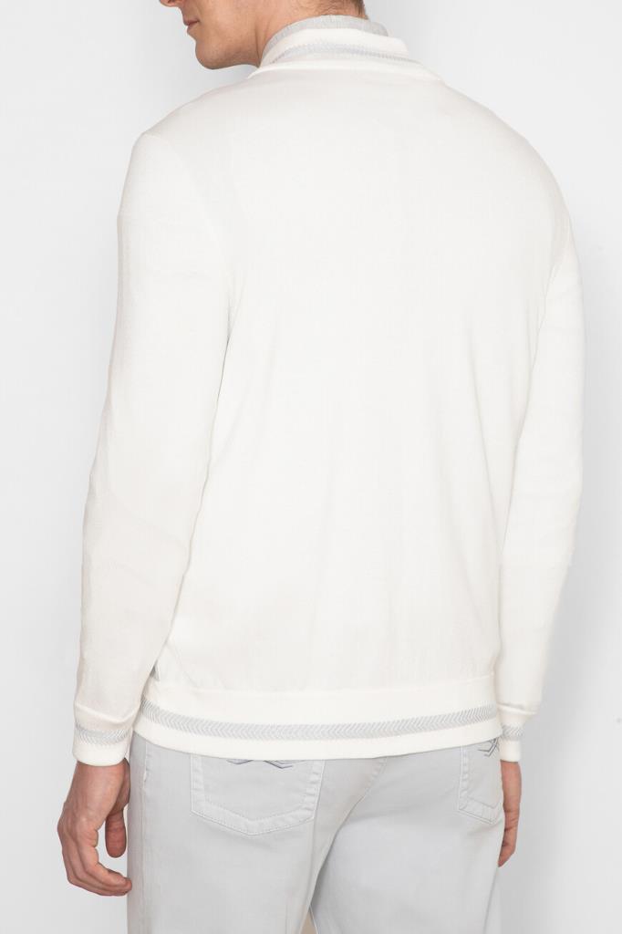 Кардиган ZILLI из хлопка и гладкого шёлка. Модель выполнена в оттенке экрю и дополнена светло-серой вставкой из мягкой бархатистой замши с рельефным узором в полоску спереди. Воротник, манжеты и пояс оформлены светло-серой полосой с рельефным геометрическим узором посередине.