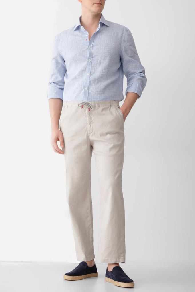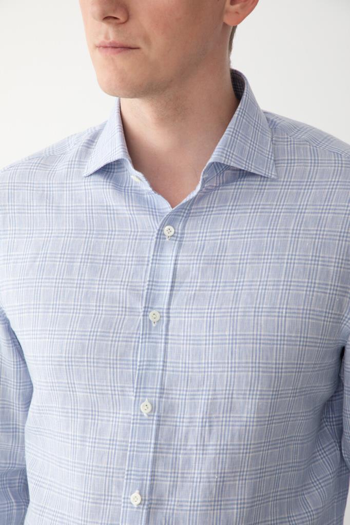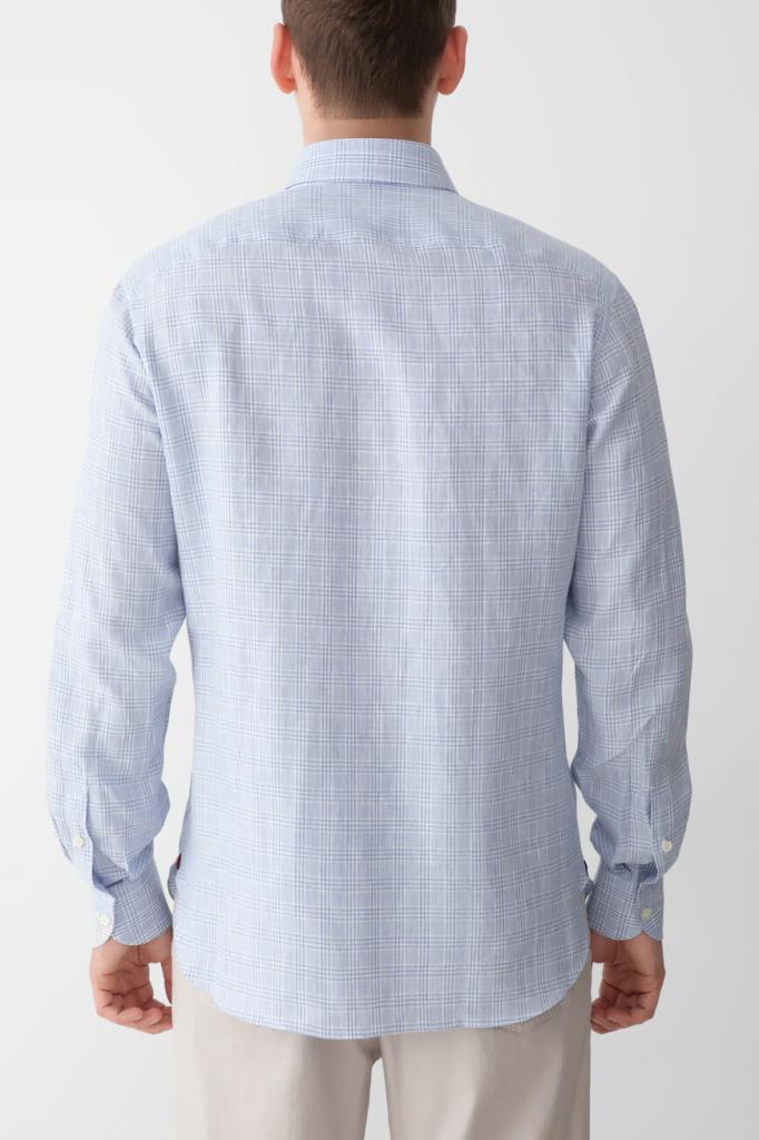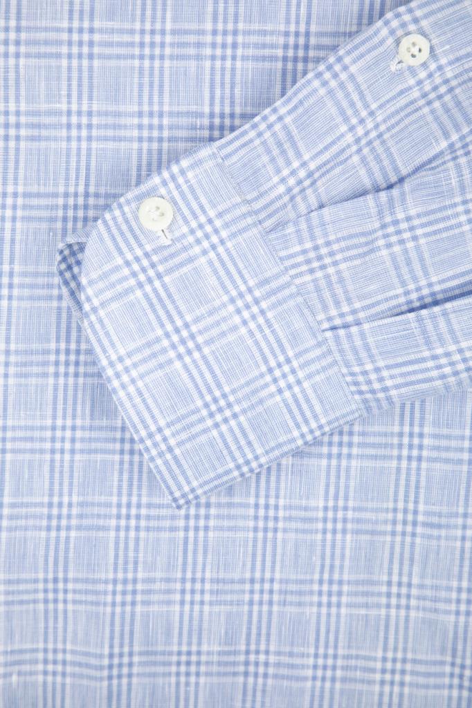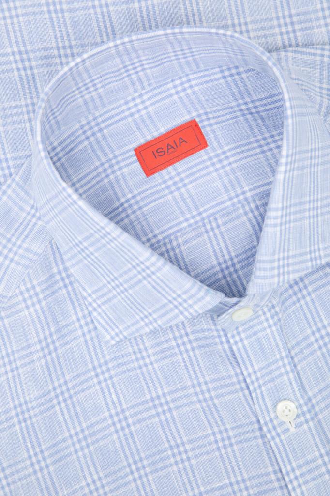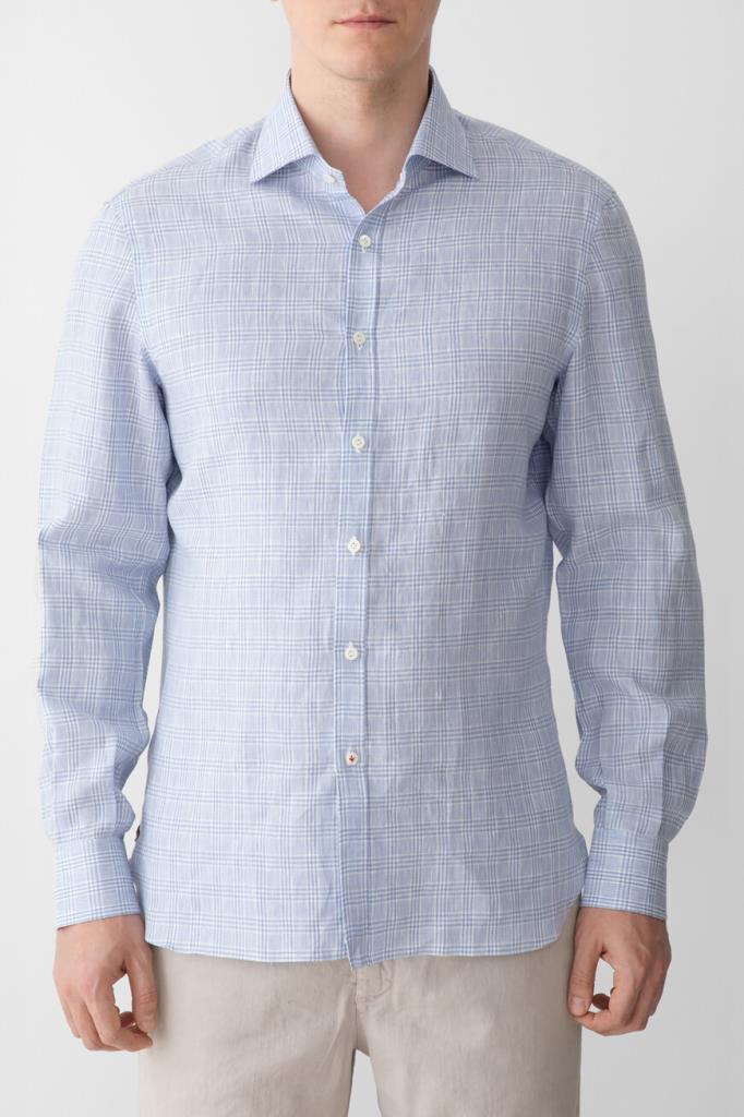 Клетчатая рубашка Isaia с длинными рукавами. Поверхность прилегающей модели, изготовленной из лёгкого мягкого льна, покрыта геометрическим мотивом в бело-синей гамме. Изделие застёгивается на брендированные перламутровые пуговицы с очерченной планкой и смотрится органично в комбинации с текстильными брюками Kiton.
