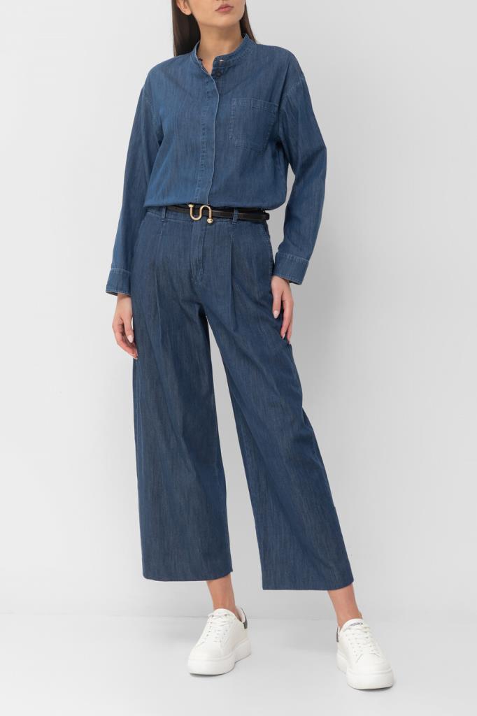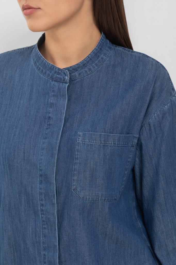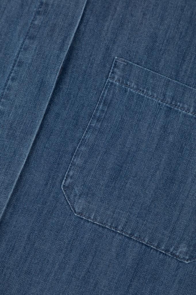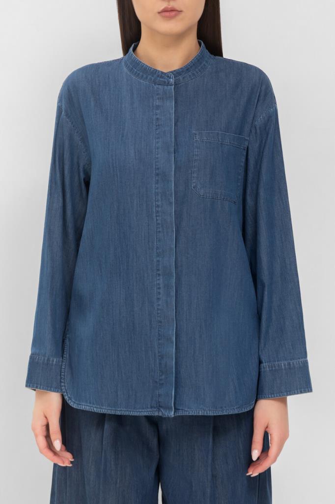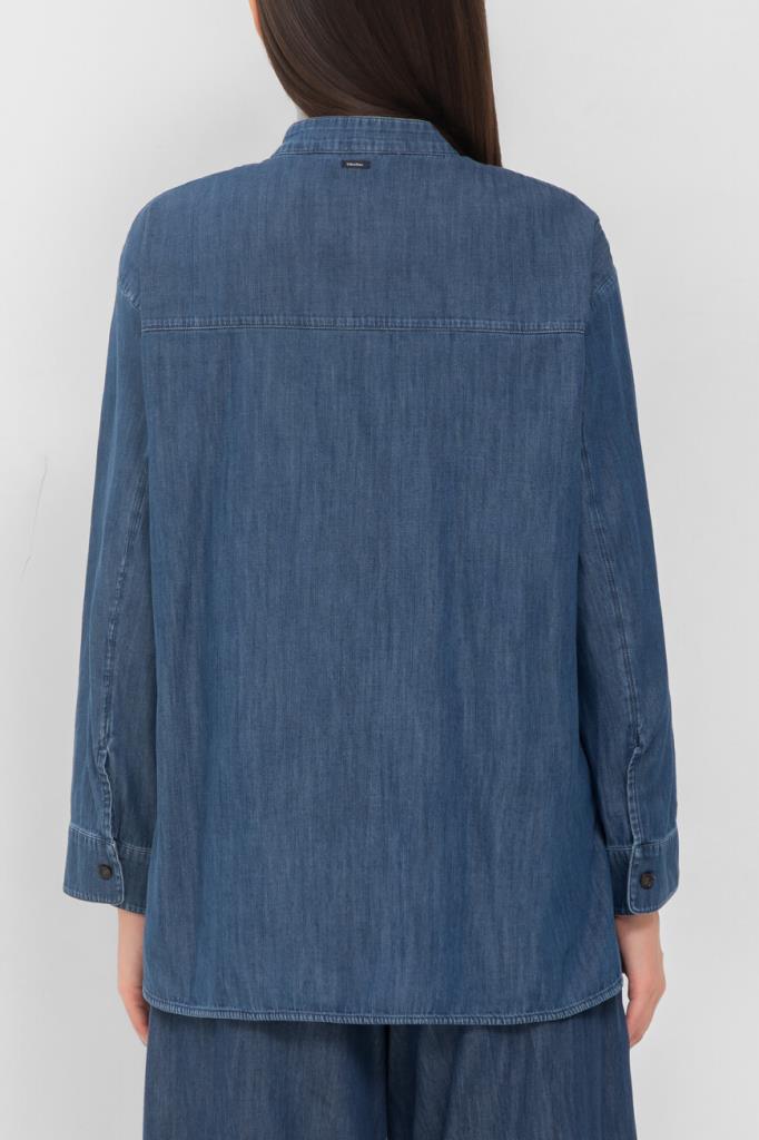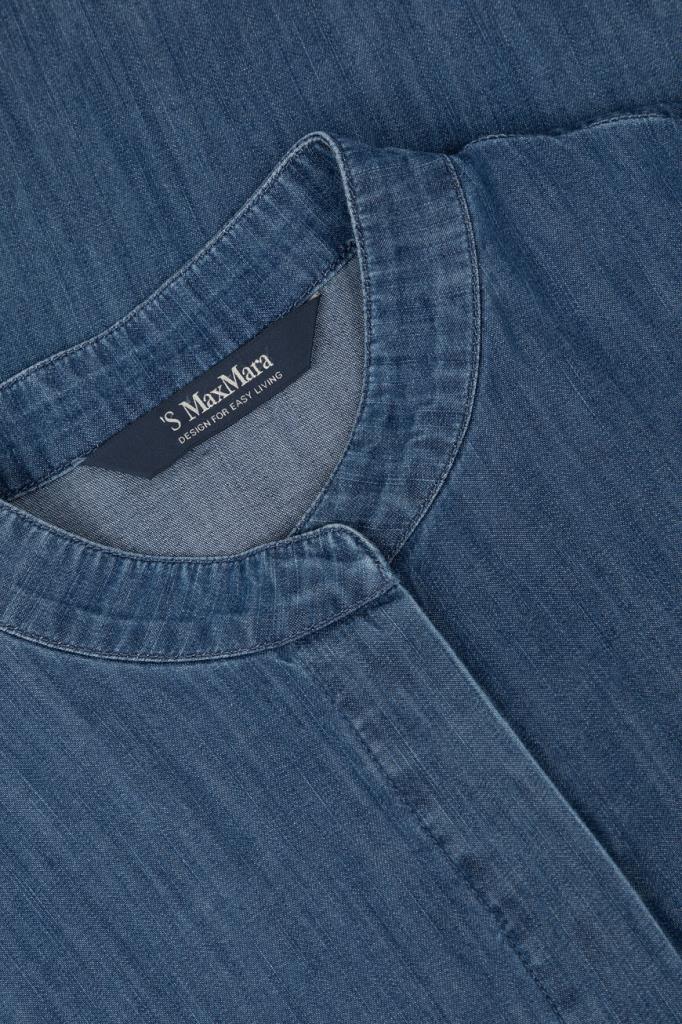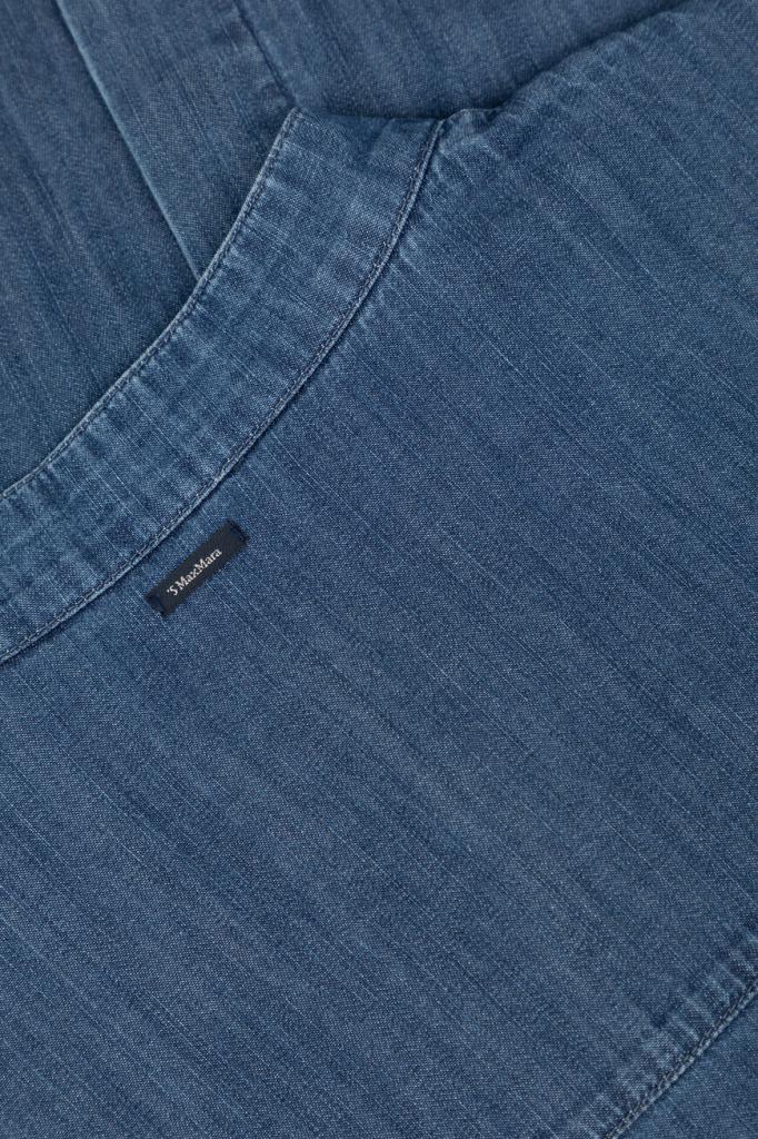 Рубашка Max Mara из хлопкового денима индиго, вдохновленная стилем сафари. Эта модель сочетает в себе классический стиль с современными деталями: воротник-стойка, спущенная линия плеча, накладной нагрудный карман и асимметричный подол. Потайная застежка на пуговицы создает лаконичный образ, а боковые разрезы добавляют свободы движений. Рубашка отлично дополняет брюки из той же коллекции.