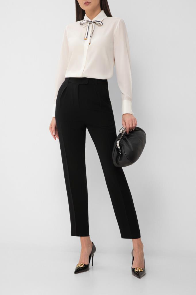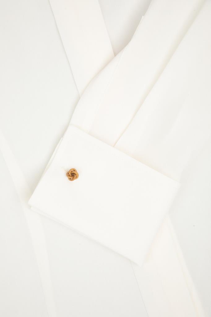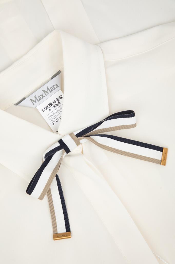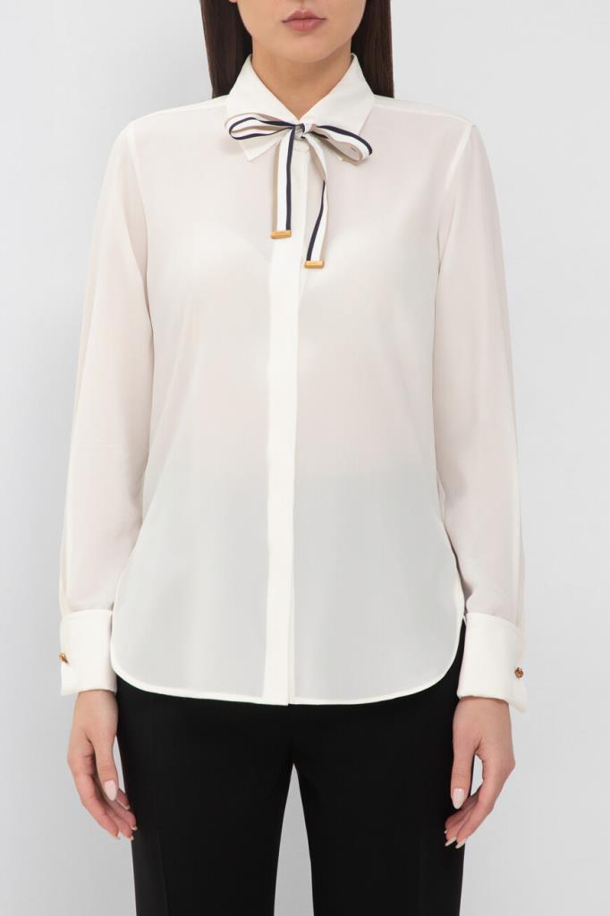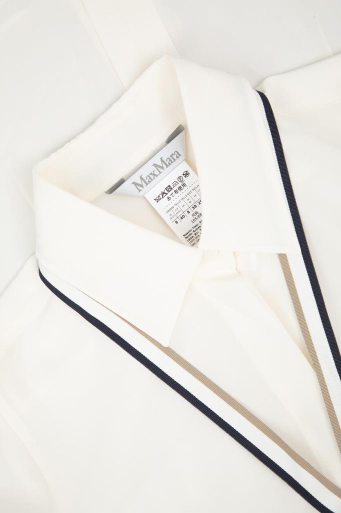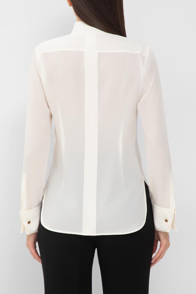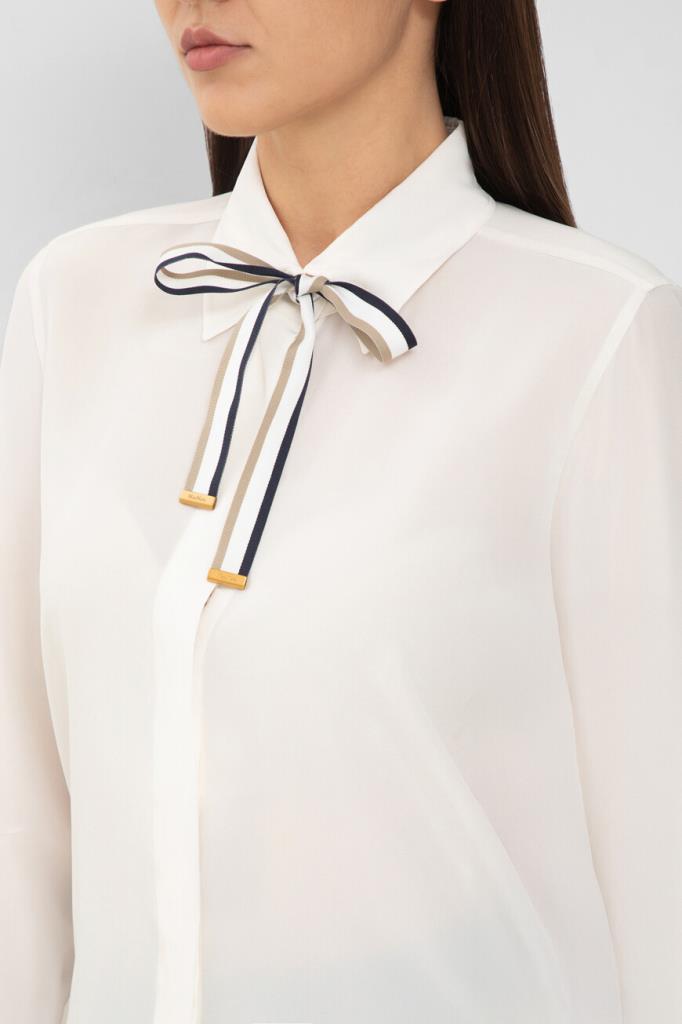 Рубашка Max Mara выполнена в мужском стиле. Изделие сшито из изысканного шелкового крепдешина, благодаря чему обеспечивает невероятную легкость и комфорт. Струящийся силуэт, классический воротник и французские манжеты создают элегантный образ. Съемный двухцветный галстук и скрытая застежка на пуговицы добавляют изысканности.