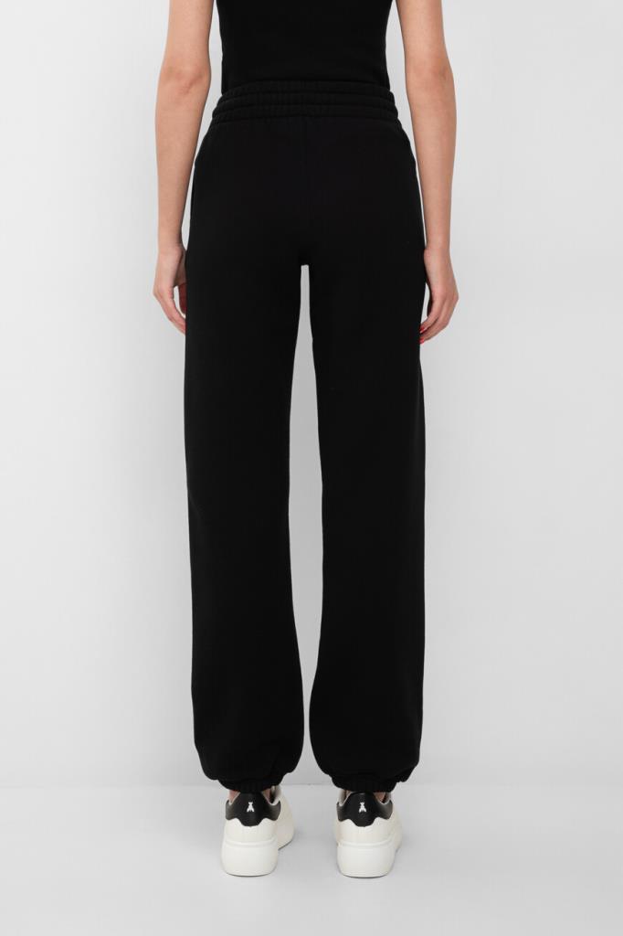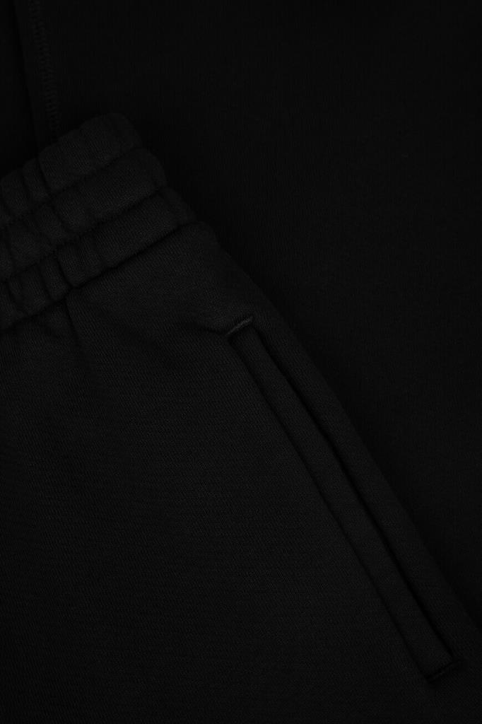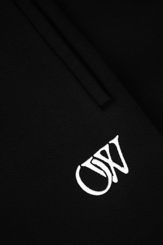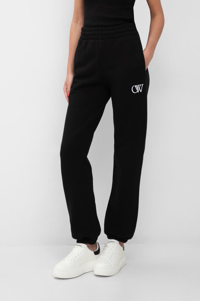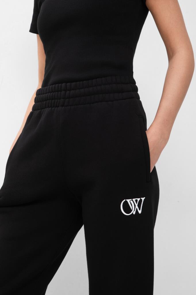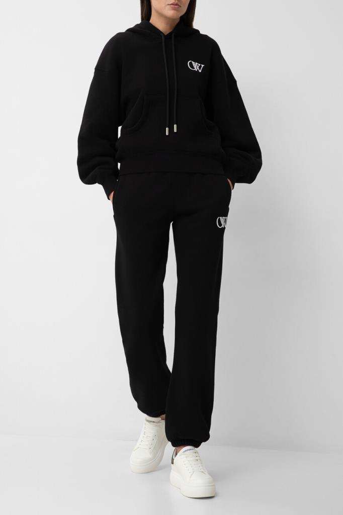 Спортивные брюки из плотного хлопкового футера от Off-White. Мягкий материал хорошо защищает от ветра и удерживает тепло, не препятствуя циркуляции воздуха. Изделие выполнено в чёрном цвете с двумя прорезными карманами. Увеличенный эластичный пояс и манжеты-резинки обеспечивают оптимальную посадку модели по фигуре. Спереди на левой стороне расположена рельефная вышивка в виде контрастной аббревиатуры названия бренда - монограммы OW. Модель составит органичный комплект с парным худи из той же коллекции.