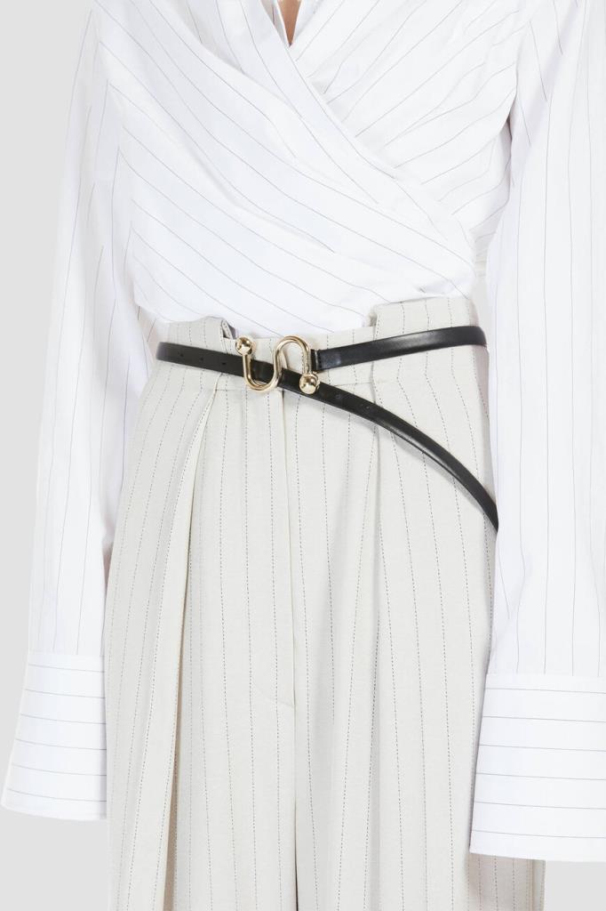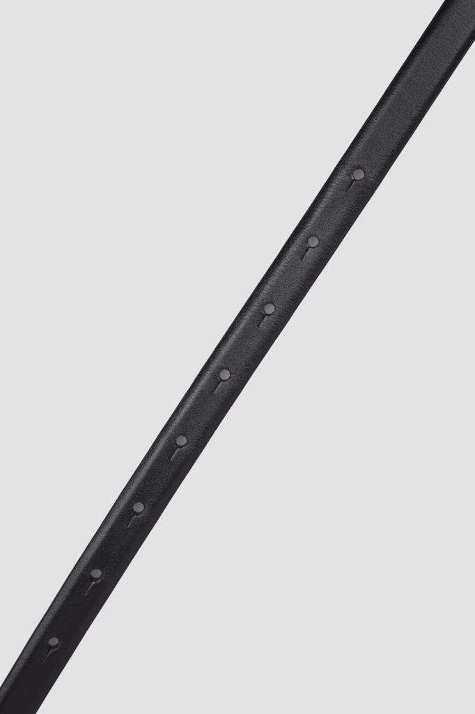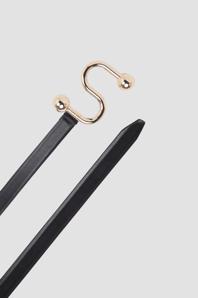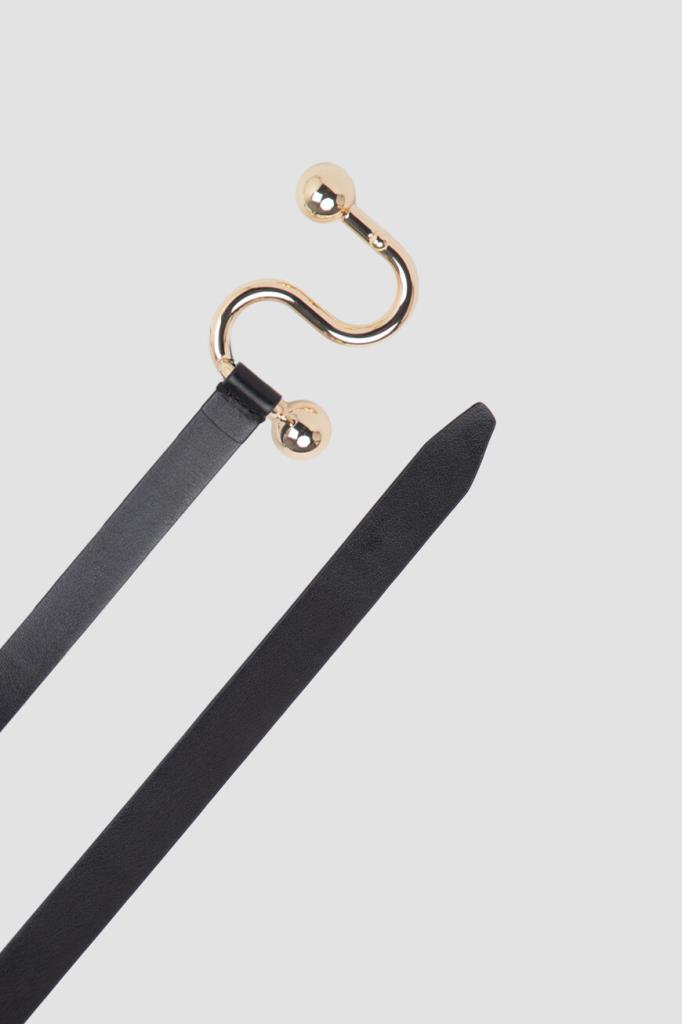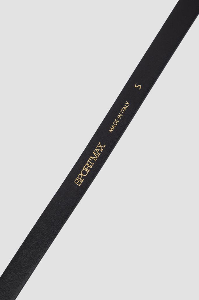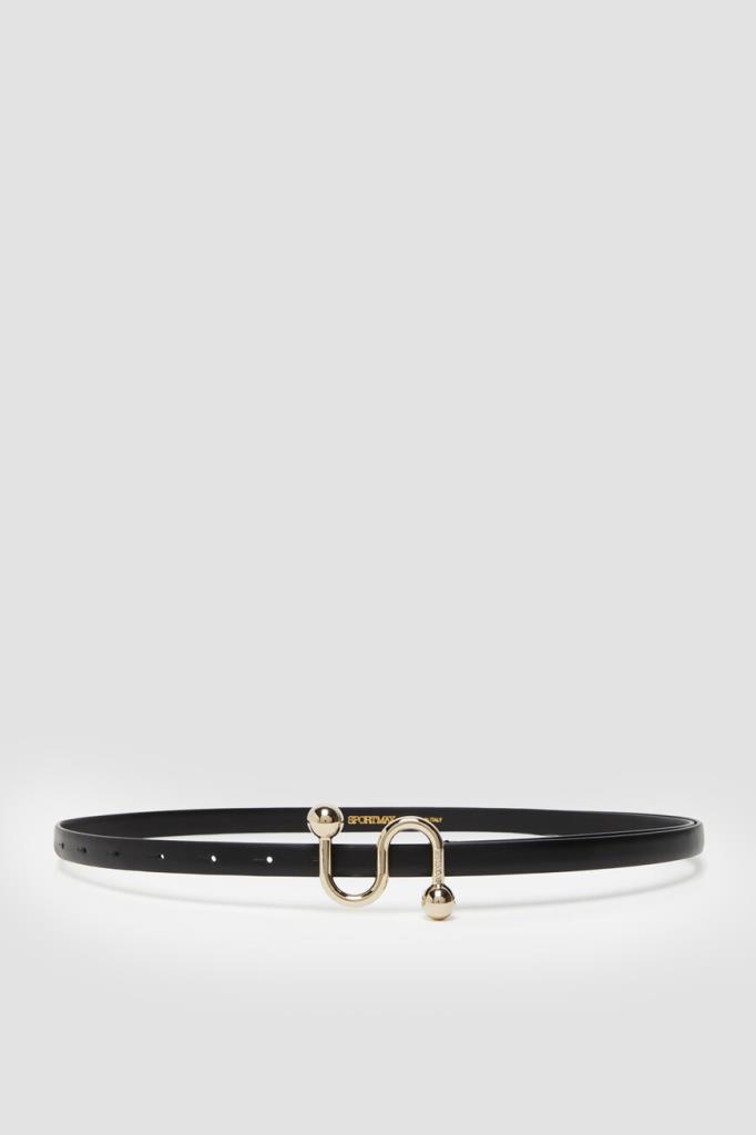 Тонкий ремень Max Mara из линейки Sportmax. Аксессуар изготовлен из гладкой кожи телёнка чёрного цвета и оснащён семью функциональными отверстиями для регулировки по длине как на талии, так и на бёдрах. Особенностью изделия стала крупная дизайнерская пряжка с S-образным дизайном, выполненная из серебристого металла.