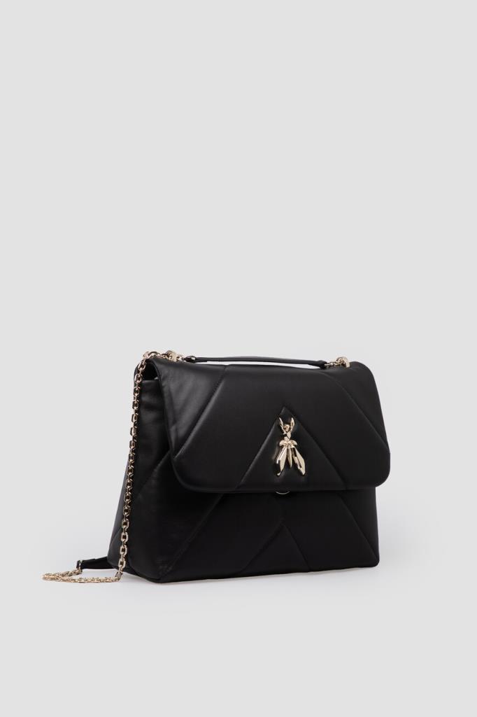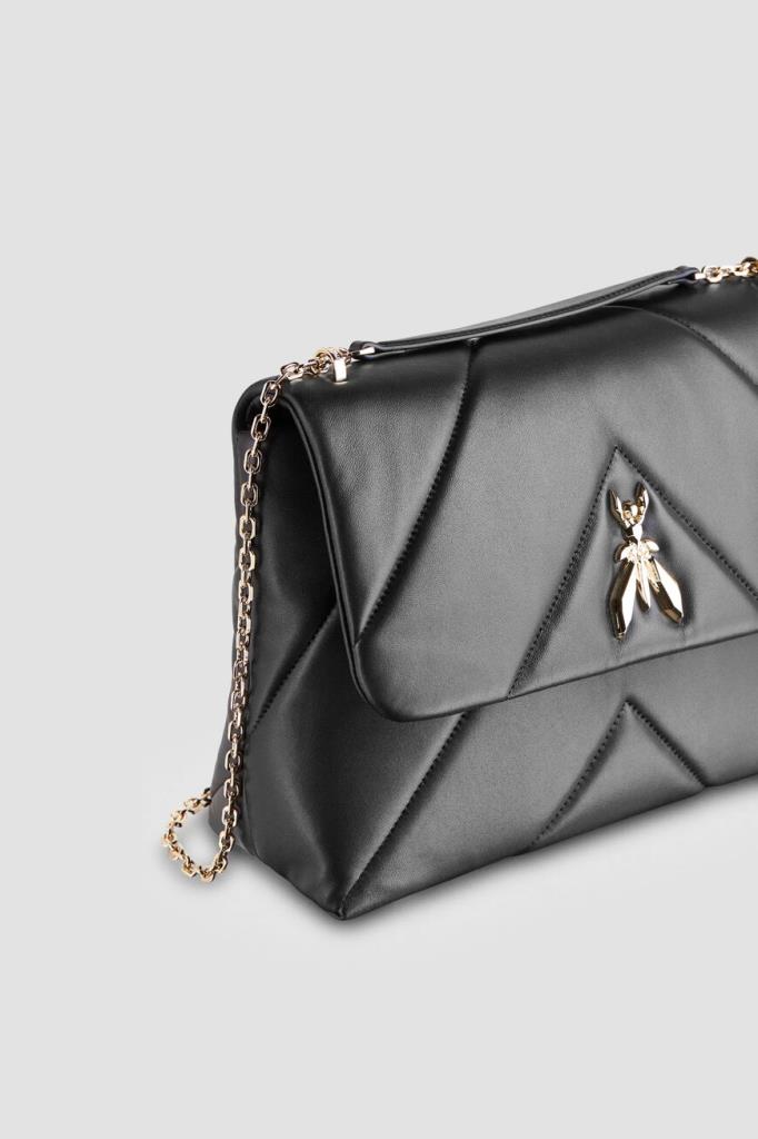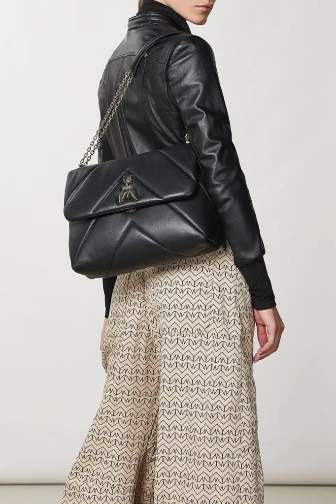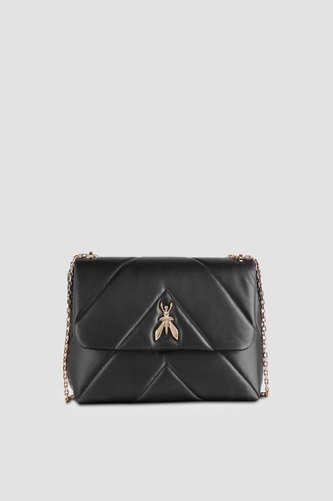 Уплотнённая сумка Fly чёрного цвета от Patrizia Pepe. Изделие является современной интерпретацией культовой модели на плечевом ремне. Для производства вместительного аксессуара с геометрическим силуэтом используется гладкая кожа козы. Сумка декорирована шевронным стёганым узором в тон и крупным знаковым символом в виде мухи, выполненным из металла светло-золотого оттенка.