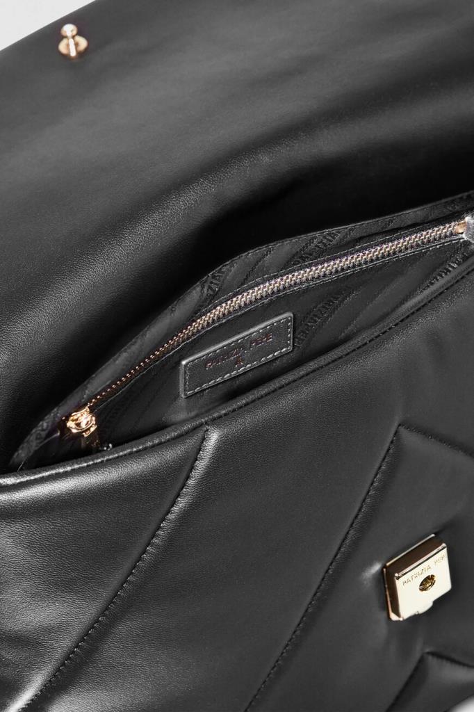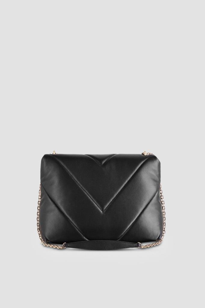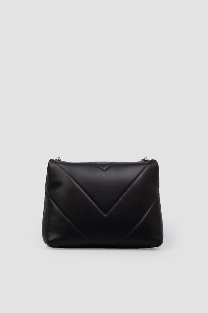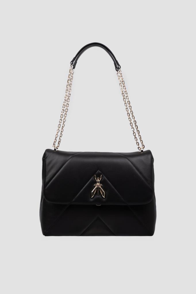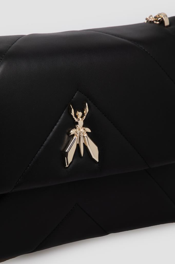 Уплотнённая сумка Fly чёрного цвета от Patrizia Pepe. Изделие является современной интерпретацией культовой модели на плечевом ремне. Для производства вместительного аксессуара с геометрическим силуэтом используется гладкая кожа козы. Сумка декорирована шевронным стёганым узором в тон и крупным знаковым символом в виде мухи, выполненным из металла светло-золотого оттенка.