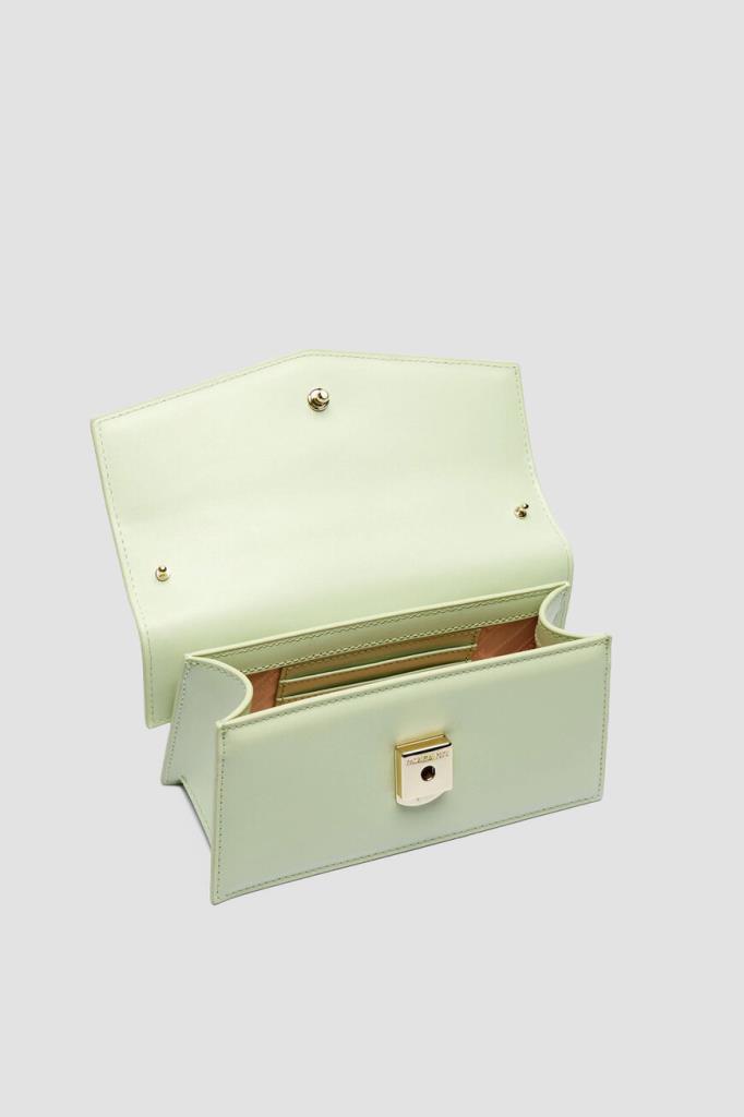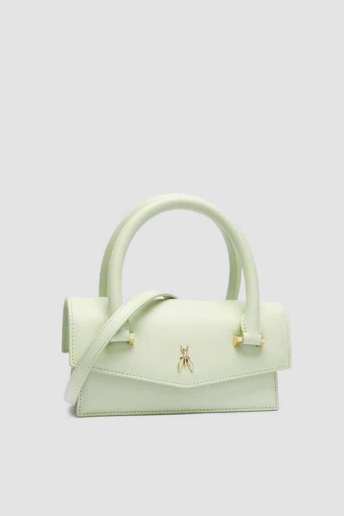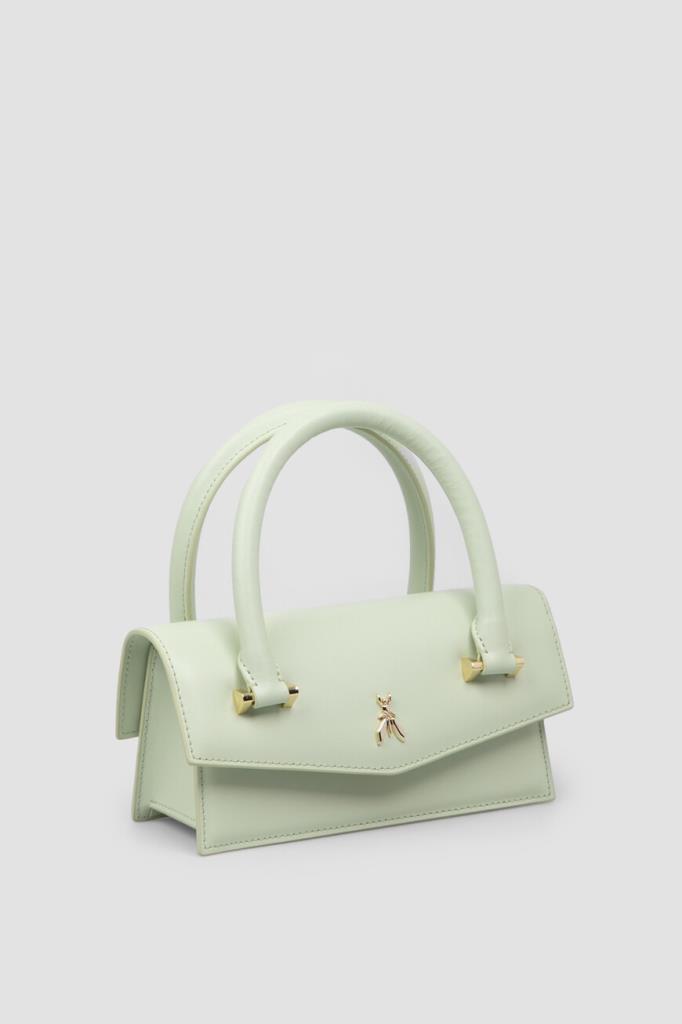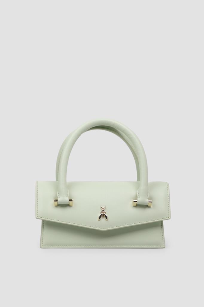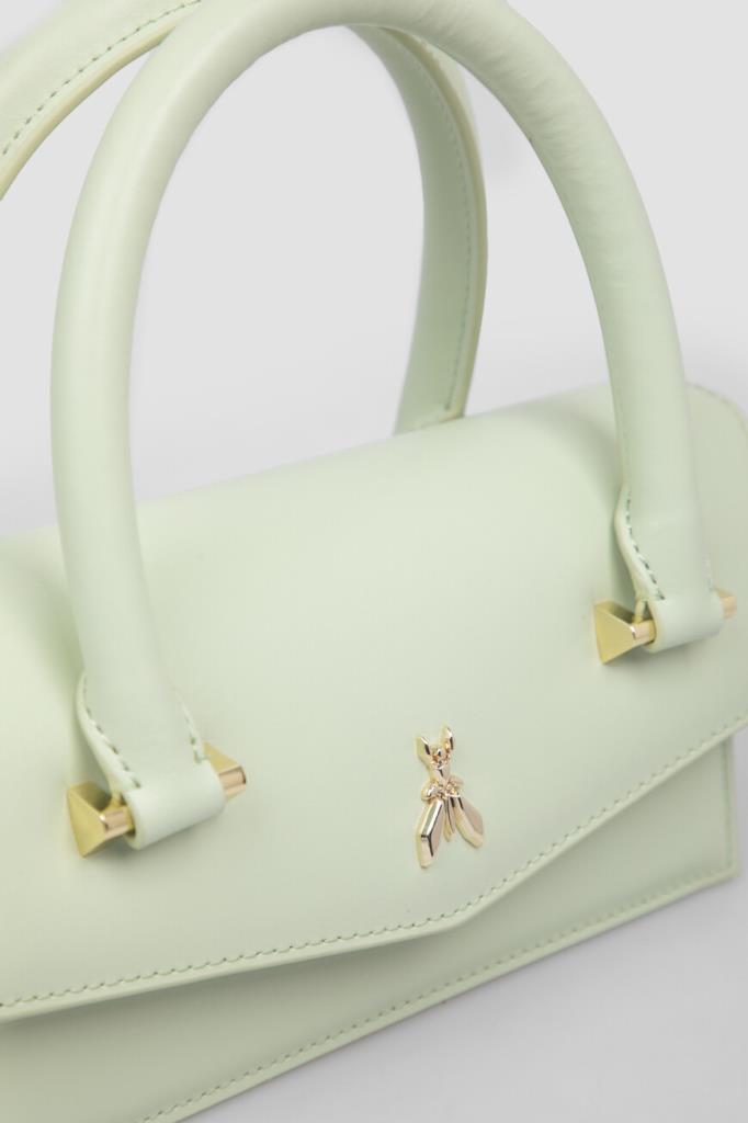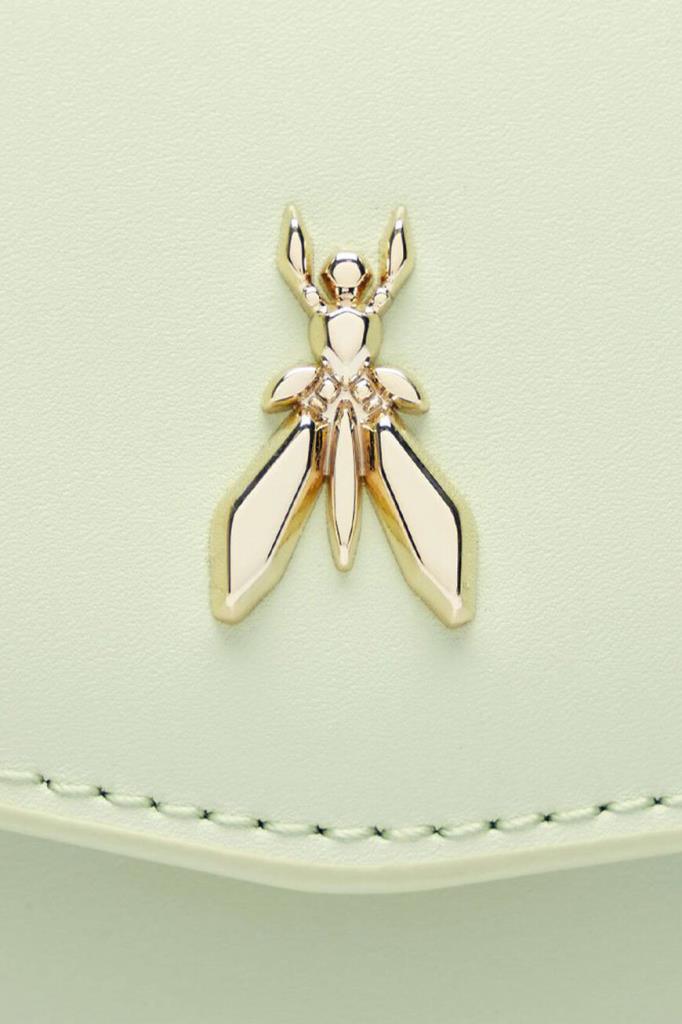Кожаная сумка Fly Bamby с символикой Patrizia Pepe. Для изготовления модели вытянутой прямоугольной формы выбран материал светло-зелёного цвета с гладкой текстурой. Крупный символ в виде мухи светло-золотого оттенка украшает фигурный клапан спереди. Изделие удобно носить в руке за две округлые ручки и на плече или через плечо, используя тонкий плечевой ремень.