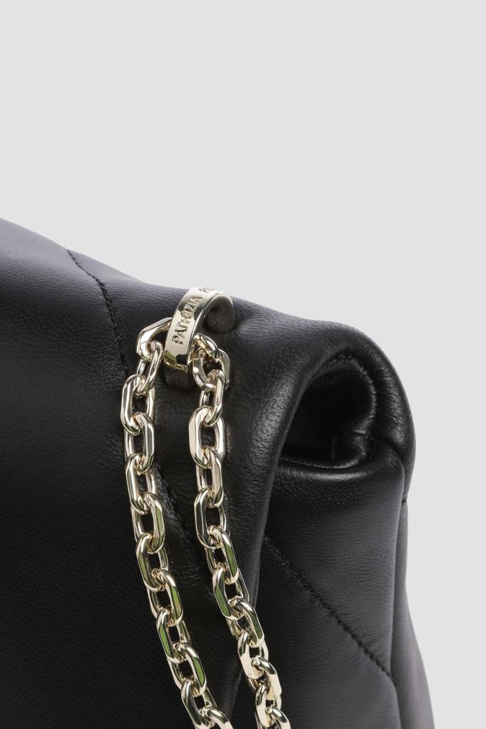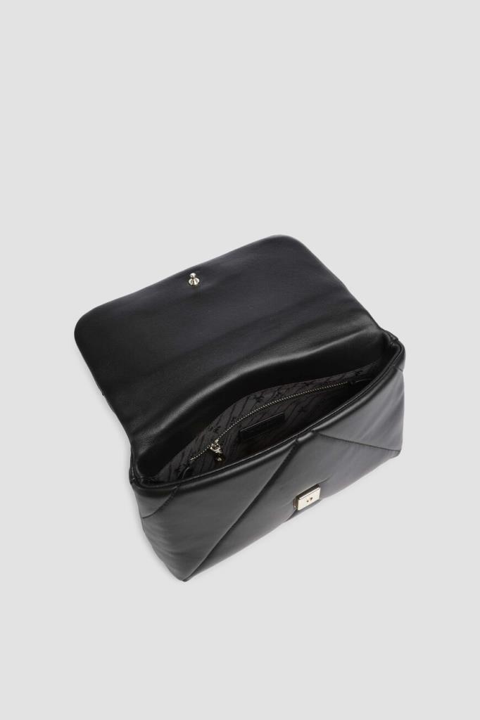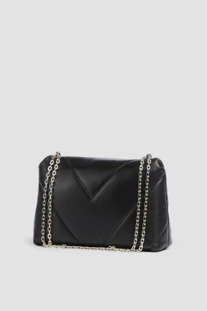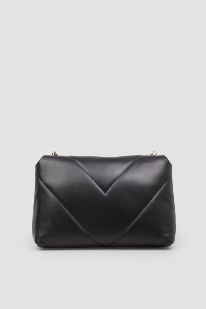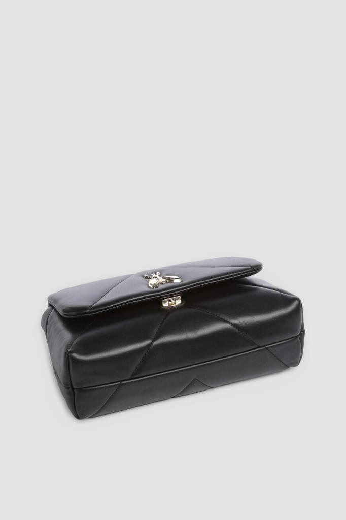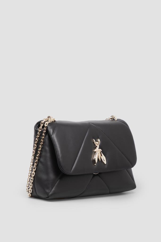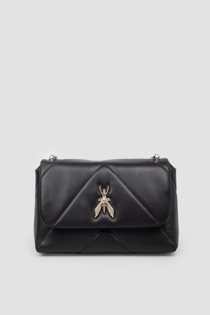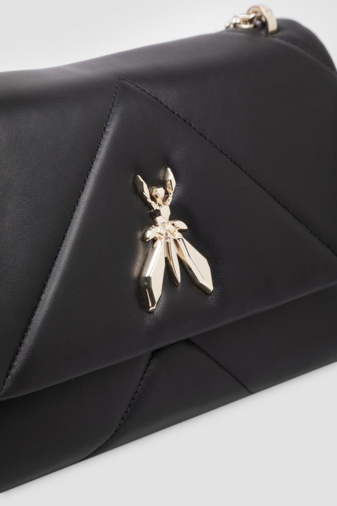 Стёганая сумка Fly от Patrizia Pepe из мелкозернистой кожи козы. Уплотнённая модель окрашена в чёрный базовый оттенок и украшена крупной знаковой символикой - деталью в виде мухи на откидном клапане спереди. Скользящий плечевой ремень из металлической цепочки завершается кожаной вставкой в тон, придающей изделию утончённый вид. Цепочку можно сложить вдвое и носить аксессуар с геометрическим силуэтом в руке, на плече или через плечо.