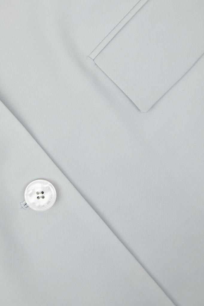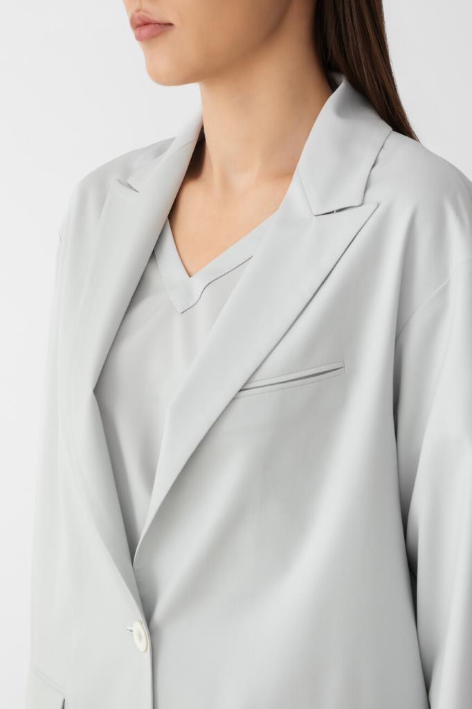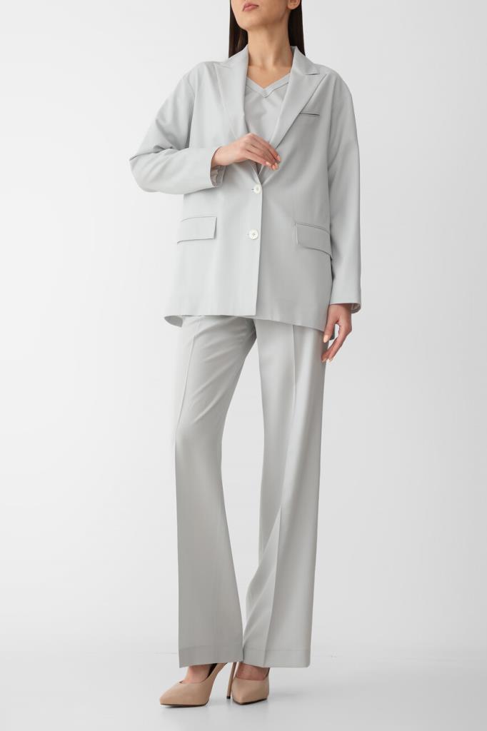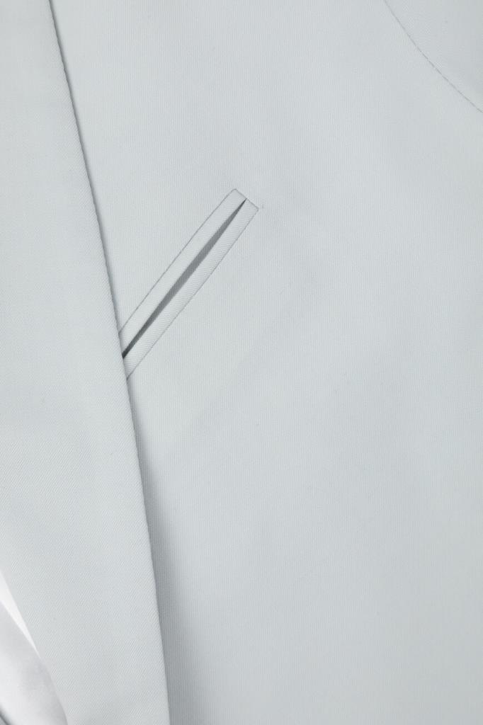 Свободный жакет Kiton с заострёнными лацканами. Для создания однобортной модели жемчужного оттенка используется мягкая костюмная шерсть. Изделие на белой подкладке из гладкого шелкового атласа застёгивается на две крупные перламутровые пуговицы и вписывается и в нестрогие офисные образы, и в casual-аутфиты.