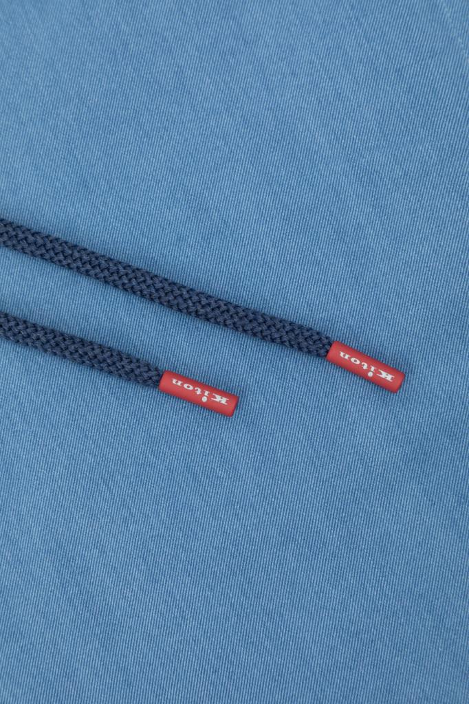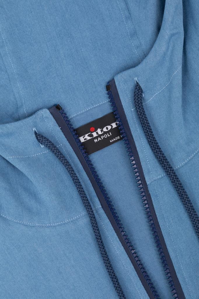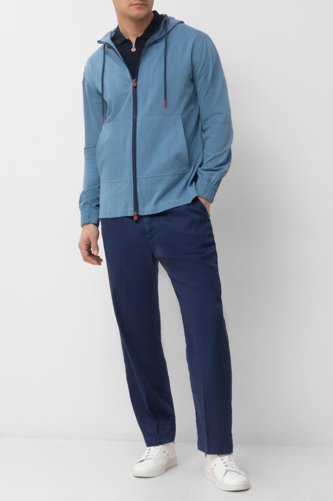 Олимпийка Kiton с глубоким капюшоном на тёмно-синих завязках. Для пошива изделия голубого оттенка используется мягкий хлопковый трикотаж. Модель прямого силуэта оснащена двумя крупными накладными карманами для хранения всего необходимого в повседневной жизни и застёжкой на встречную молнию с брендированными эмалированными пуллерами, делающими отсылку к Дому.