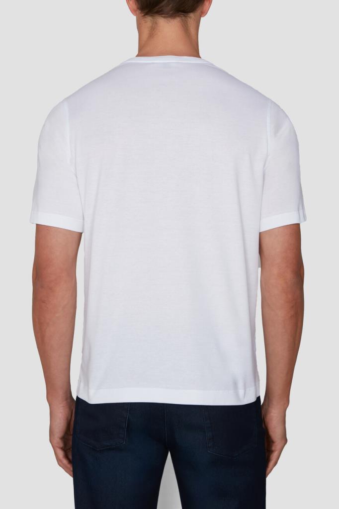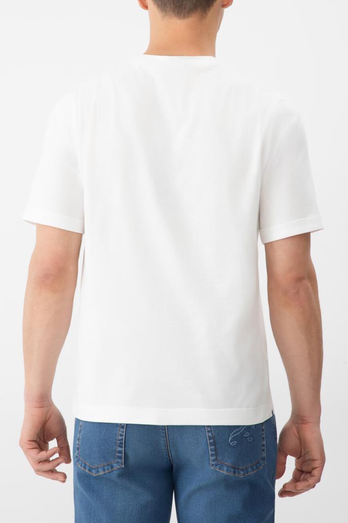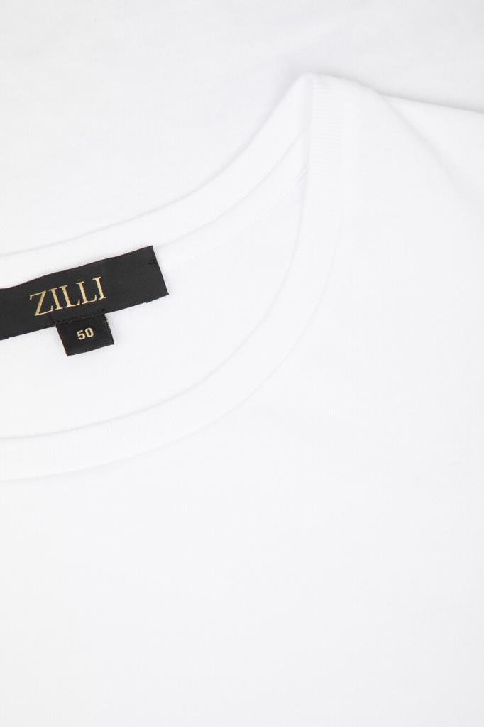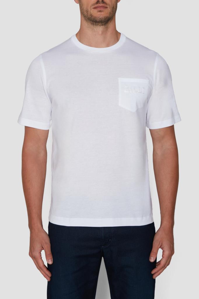 Хлопковая футболка с символикой бренда Zilli. Модель прямого силуэта выполнена в белом базовом цвете и дополнена нагрудным накладным карманом слева. Атрибутами Дома являются вышитые крупная надпись-логотип и год основания в тон. Изделие с круглым вырезом горловины на резинке органично впишется в повседневный мужской гардероб.