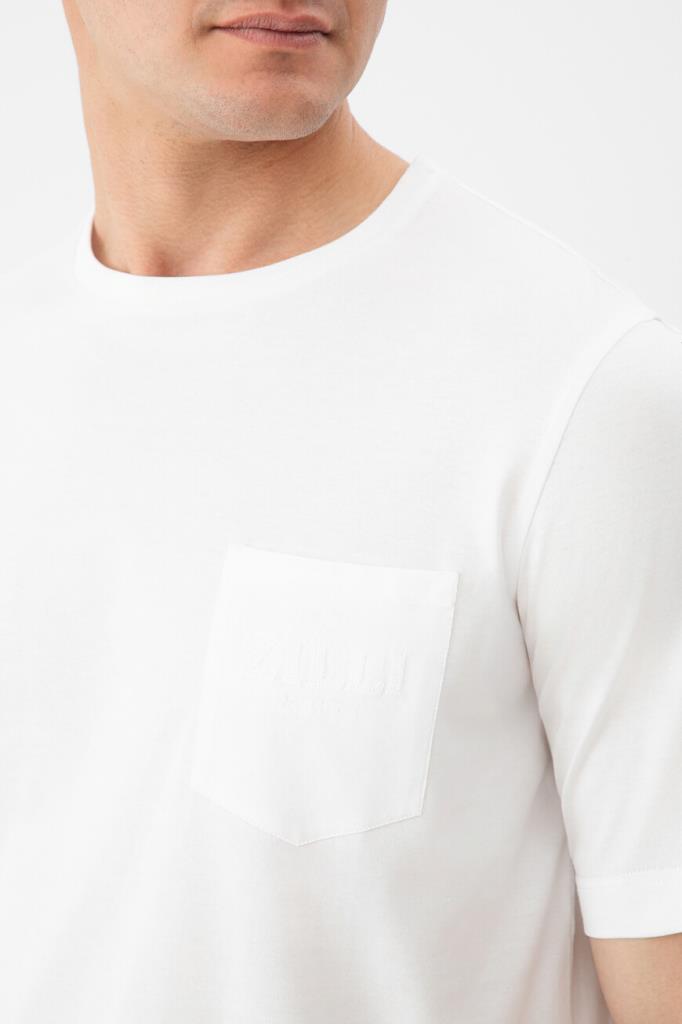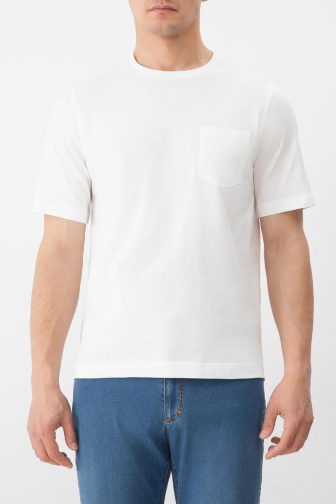 Хлопковая футболка с символикой бренда Zilli. Модель прямого силуэта выполнена в белом базовом цвете и дополнена нагрудным накладным карманом слева. Атрибутами Дома являются вышитые крупная надпись-логотип и год основания в тон. Изделие с круглым вырезом горловины на резинке органично впишется в повседневный мужской гардероб.