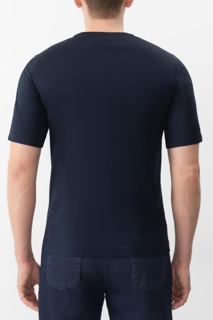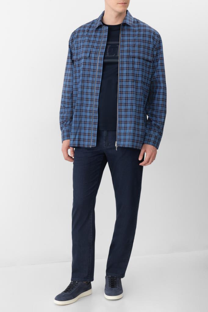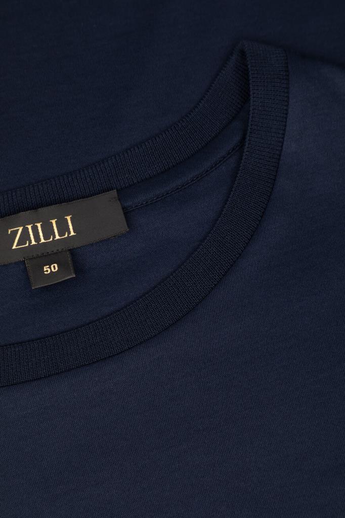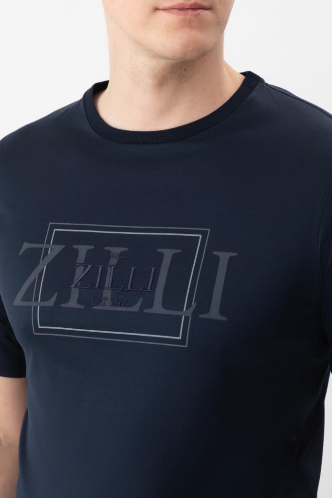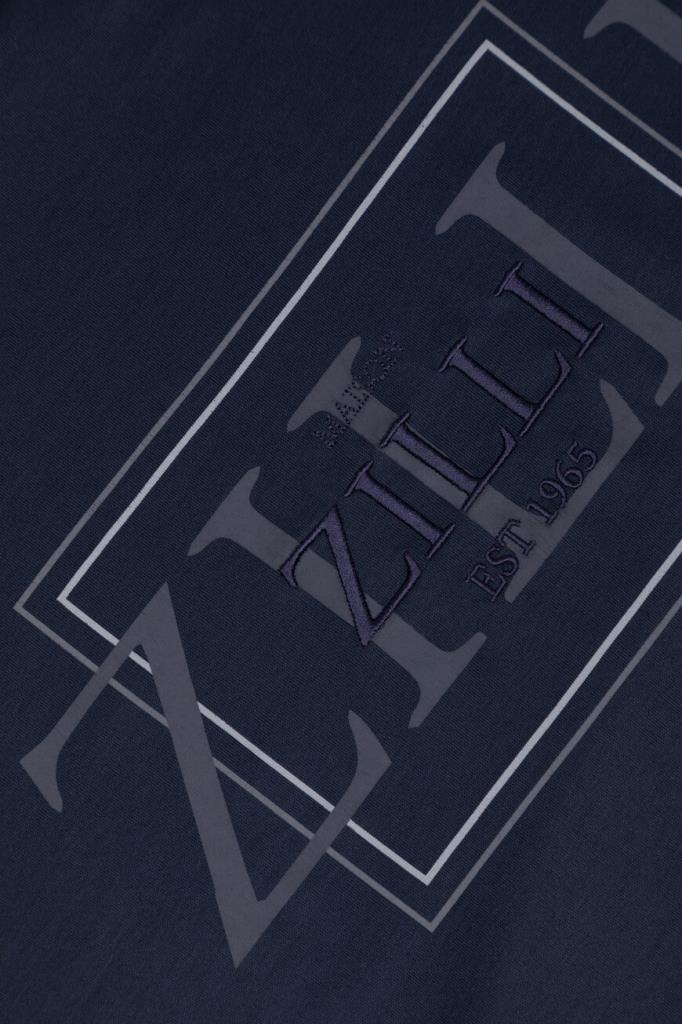 Тёмно-синяя футболка Zilli с брендированием на груди. Для пошива модели с круглым вырезом горловины на резинке используется хлопковое джерси, обработанное в технике мерсеризации. Изделие декорировано надписью «Maison est 1965» и логотипом, вышитыми нитью в тон поверх принта в виде прямоугольников и крупного лого спереди.