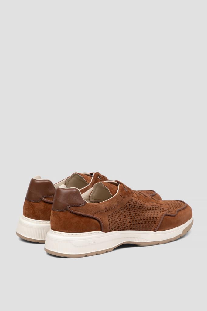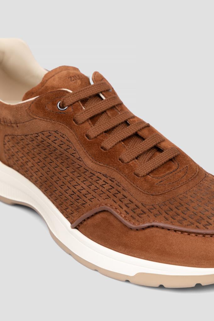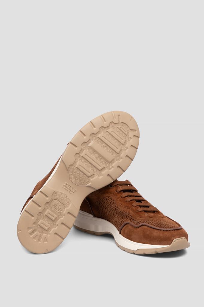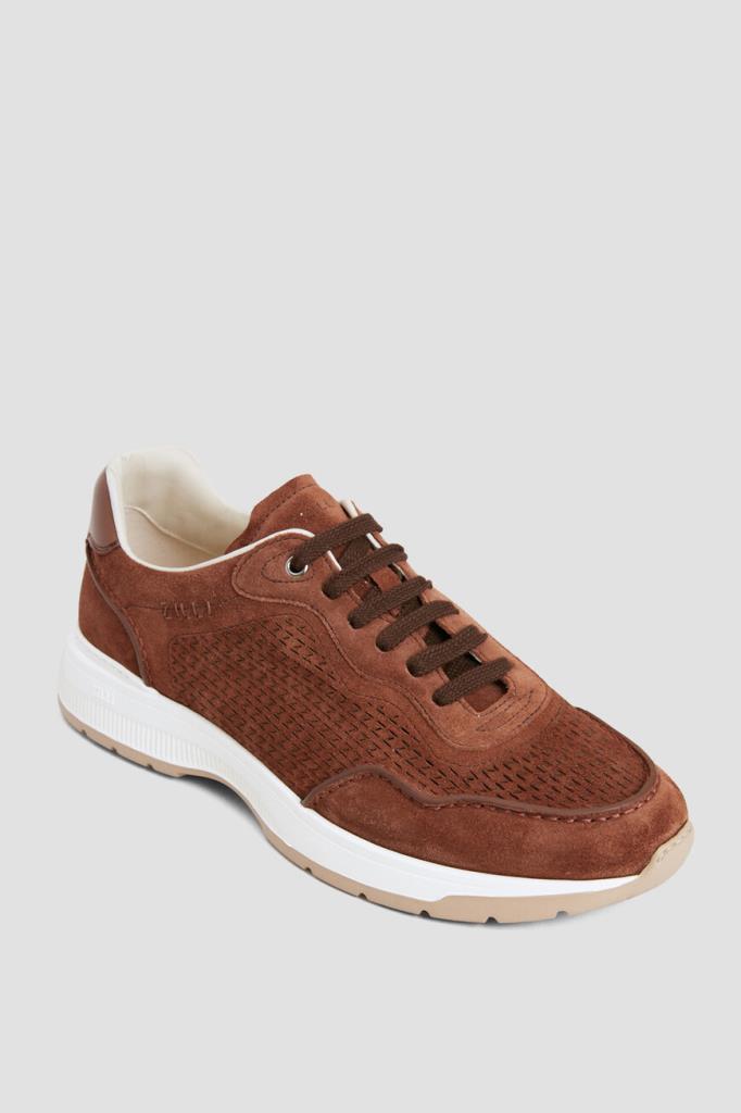 Коричневые кроссовки Laser Z Running от Zilli. Изделие выполнено из бархатистой замши и украшено геометрическим мотивом в виде перфорированной литеры «Z» на носке и боковинах в тон. Отличительными деталями являются белый кант сверху, рельефные полосы, тиснёная надпись-лого Дома на язычке, вставка из гладкой кожи телёнка с логотипом в задней части и вышитый лого сбоку.