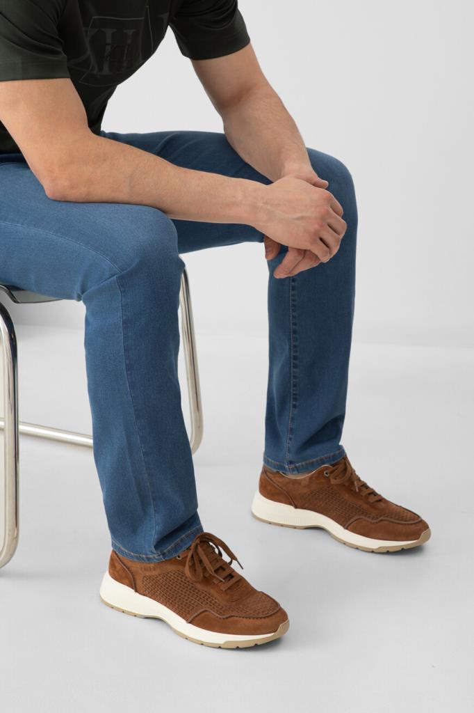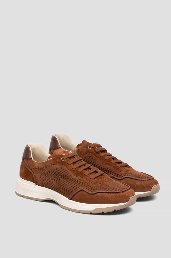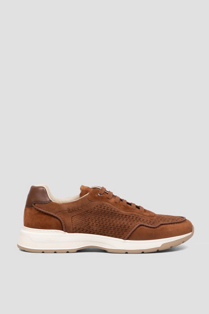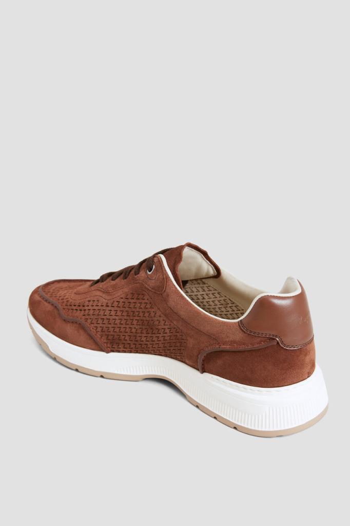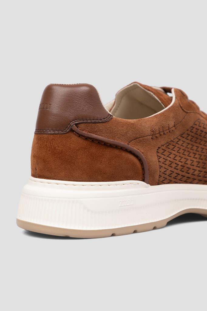 Коричневые кроссовки Laser Z Running от Zilli. Изделие выполнено из бархатистой замши и украшено геометрическим мотивом в виде перфорированной литеры «Z» на носке и боковинах в тон. Отличительными деталями являются белый кант сверху, рельефные полосы, тиснёная надпись-лого Дома на язычке, вставка из гладкой кожи телёнка с логотипом в задней части и вышитый лого сбоку.