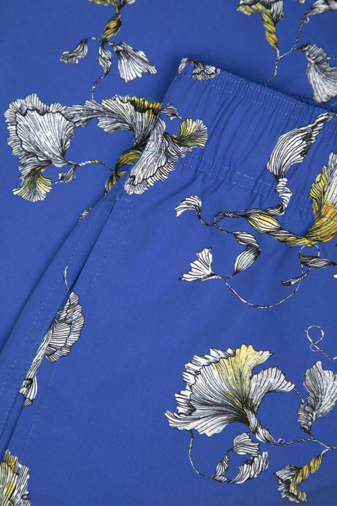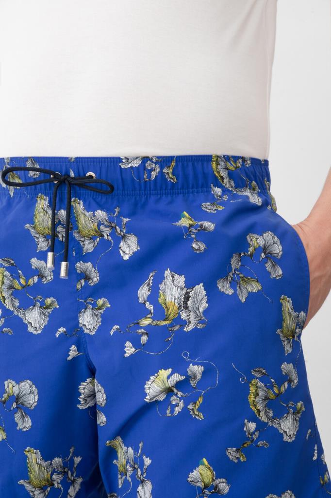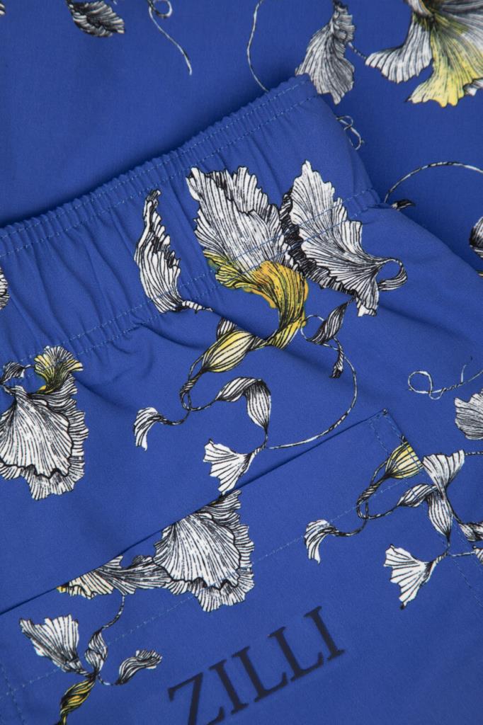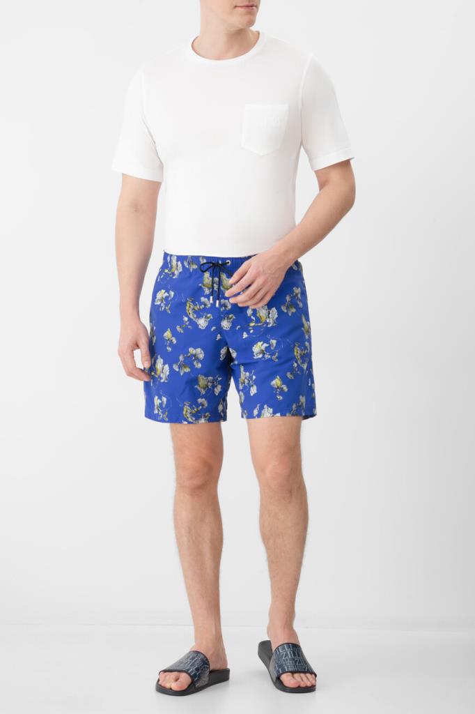 Плавки-шорты от Zilli с тремя карманами. Для изготовления модели прямого силуэта выбран прочный износостойкий нейлон. Поверхность изделия глубокого синего оттенка покрыта разноцветным цветочным мотивом. Конструкция плавок предполагает наличие широкого эластичного пояса на чёрной кулиске для регулировки посадки. Декором выступает крупная надпись-логотип на правом заднем кармане.