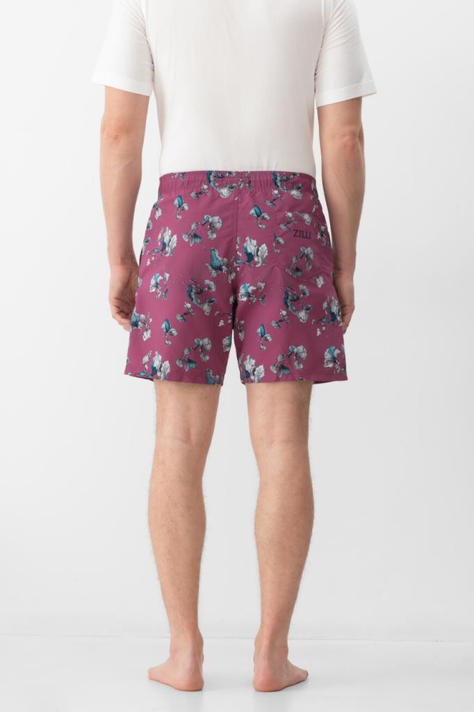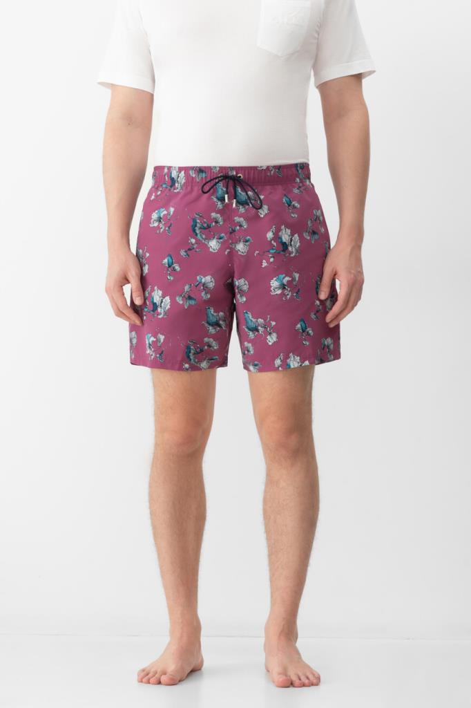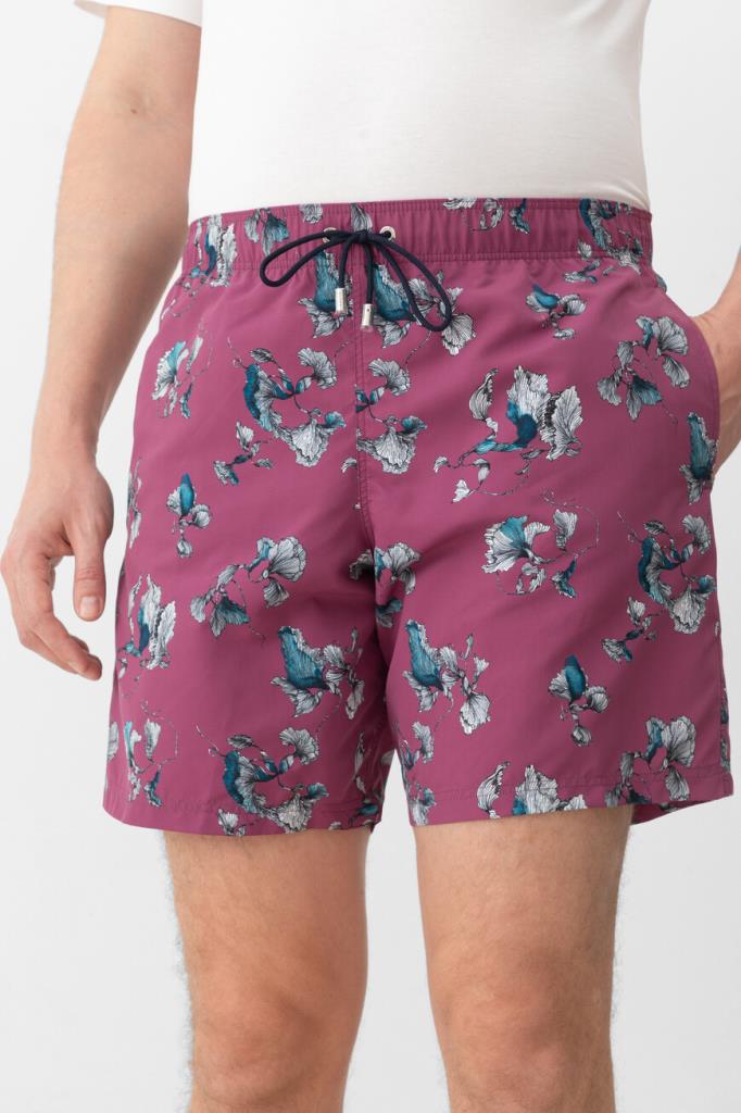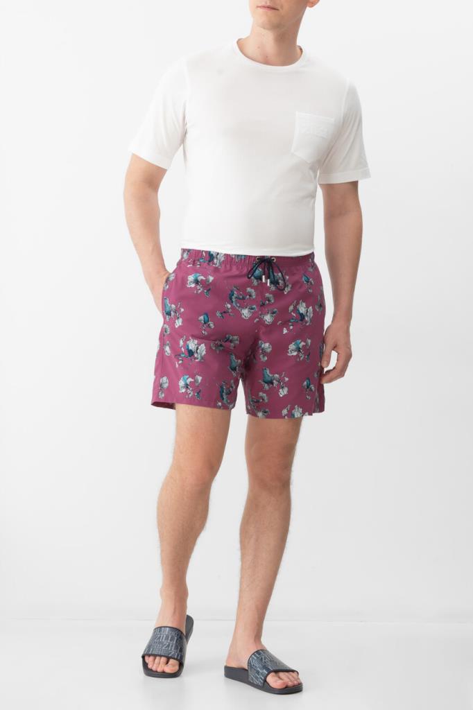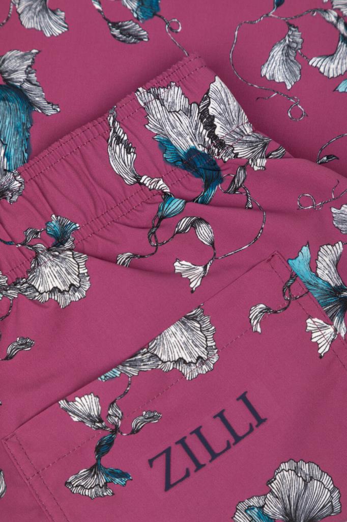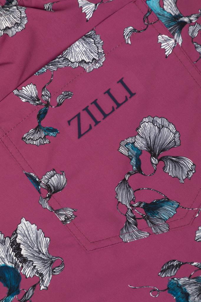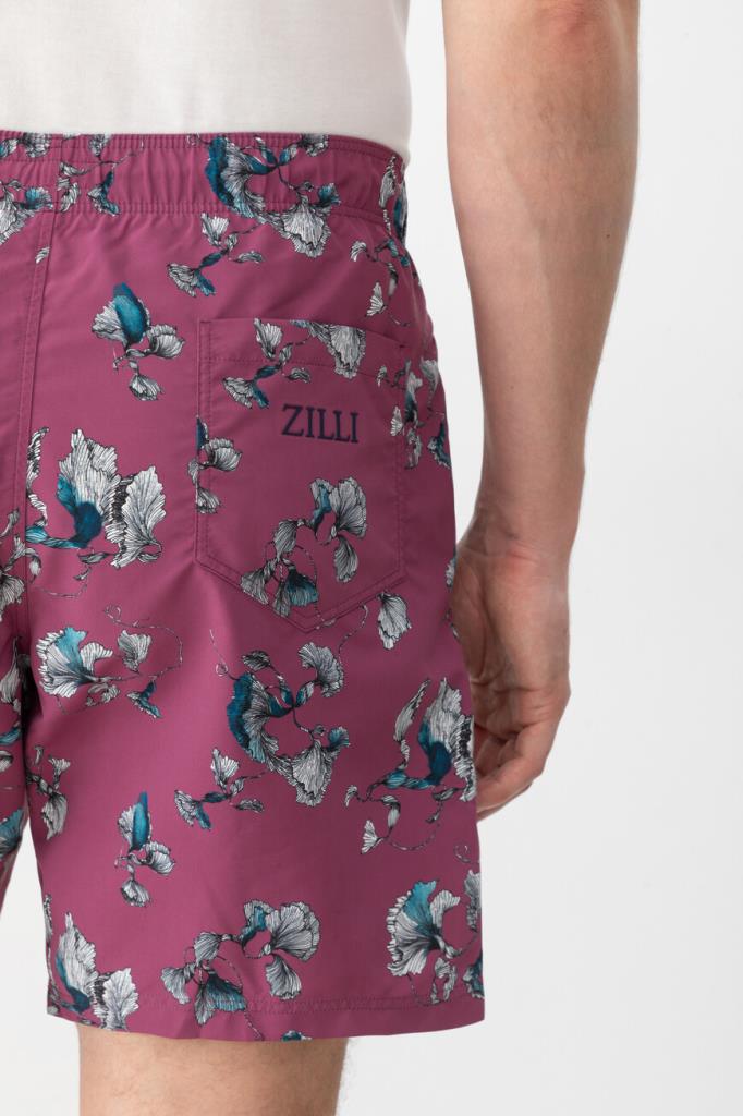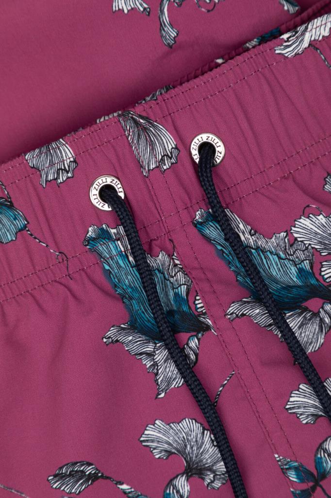 Принтованные плавки-шорты прямого силуэта от Zilli. Изделие из прочного быстросохнущего нейлона украшает разноцветный цветочный мотив на сливовом фоне. Для оптимальной посадки модели по фигуре предусмотрен широкий эластичный пояс на завязках с серебристыми металлическими эглетами. Плавки с логотипом на заднем кармане станут незаменимом атрибутом для отдыха на пляже или у бассейна.