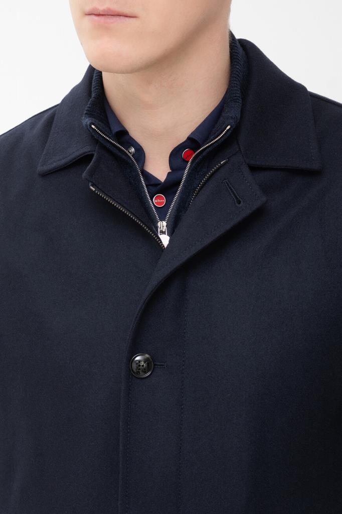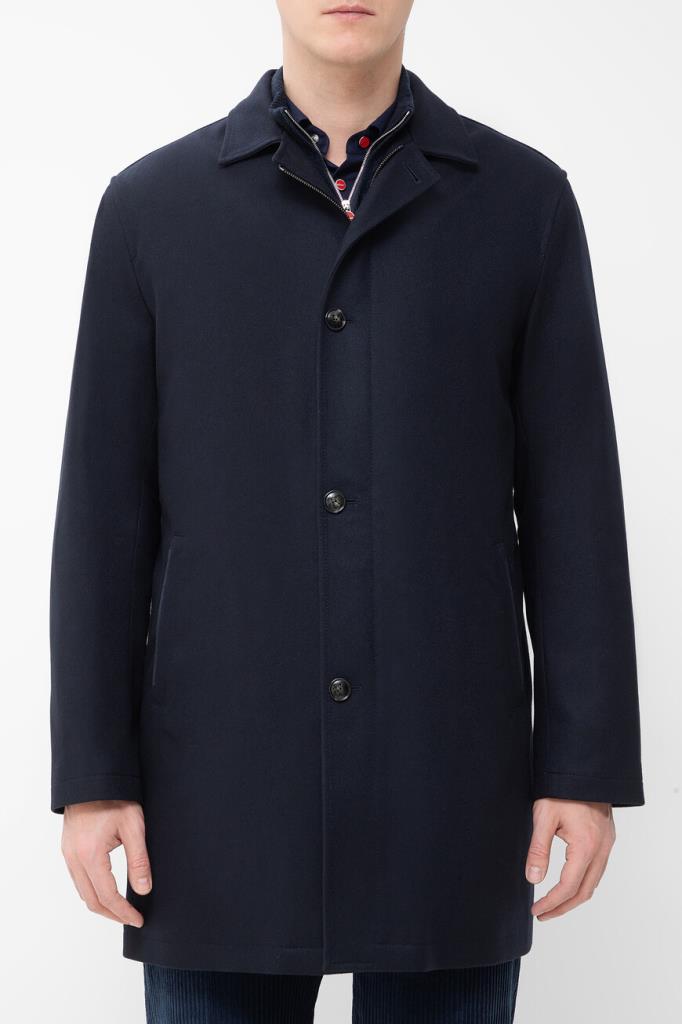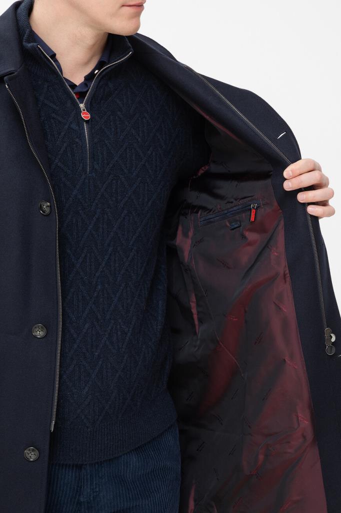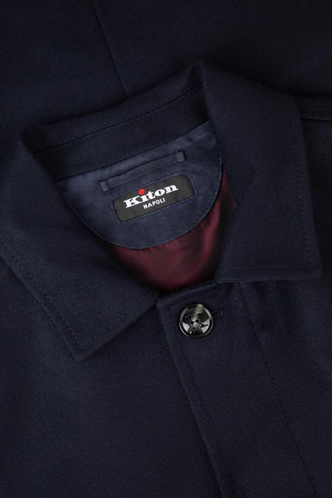 Кашемировое пальто тёмно-синего цвета от бренда Kiton. Ткань, полученная из самых тонких и нежных волокон, согревает лучше шерсти, а весит намного меньше, поэтому одежда из неё не утяжеляет силуэт. Фасон изделия предполагает наличие отложного воротника и застёжку на потайную молнию и брендированные роговые пуговицы с очерченной планкой. Принадлежность модели Дому деликатно обозначена замшевой вставкой с белым логотипом сзади на воротнике (видна при подъёме воротника) и брендированием на бордовой подкладке. Однобортное пальто классического кроя впишется и в строгий офисный образ, и в менее формальный ансамбль в стиле smart casual.