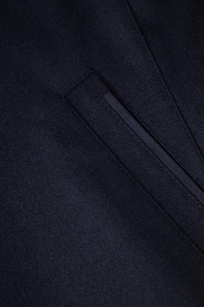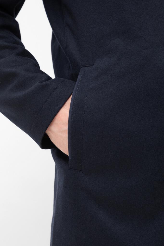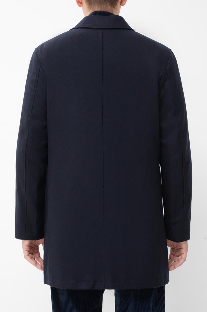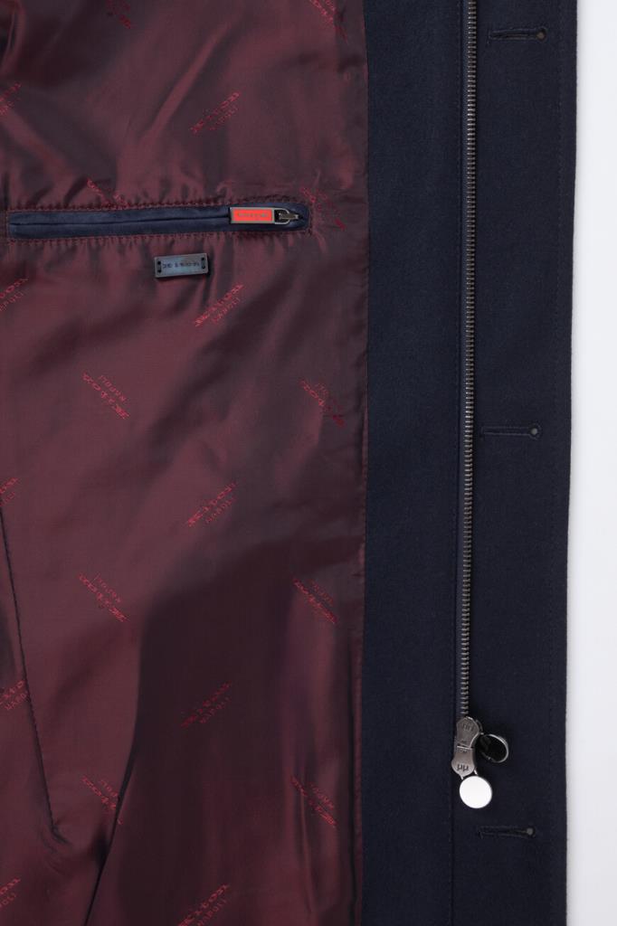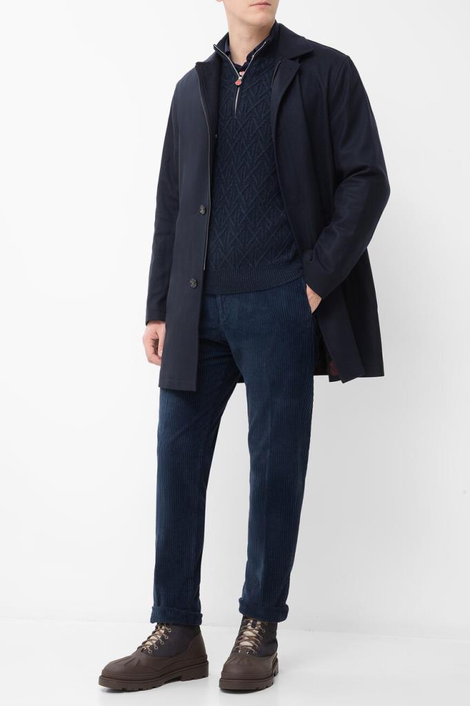 Кашемировое пальто тёмно-синего цвета от бренда Kiton. Ткань, полученная из самых тонких и нежных волокон, согревает лучше шерсти, а весит намного меньше, поэтому одежда из неё не утяжеляет силуэт. Фасон изделия предполагает наличие отложного воротника и застёжку на потайную молнию и брендированные роговые пуговицы с очерченной планкой. Принадлежность модели Дому деликатно обозначена замшевой вставкой с белым логотипом сзади на воротнике (видна при подъёме воротника) и брендированием на бордовой подкладке. Однобортное пальто классического кроя впишется и в строгий офисный образ, и в менее формальный ансамбль в стиле smart casual.