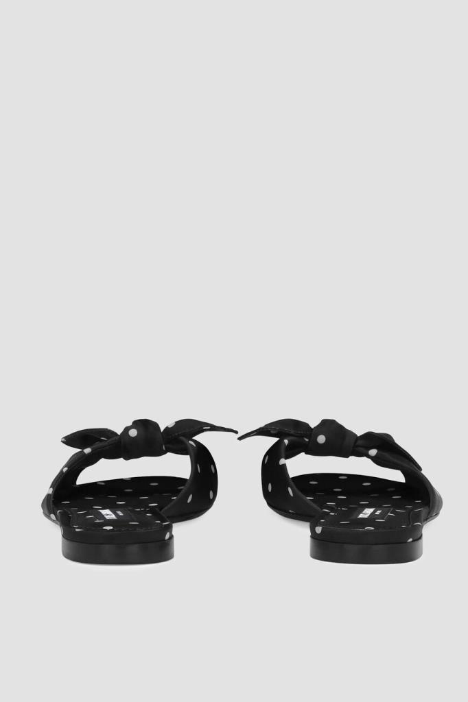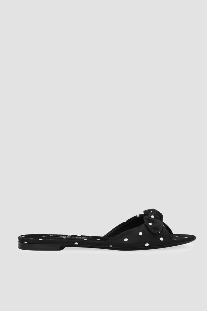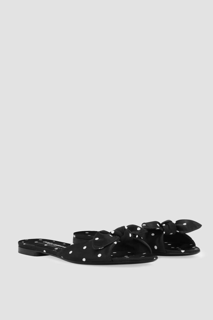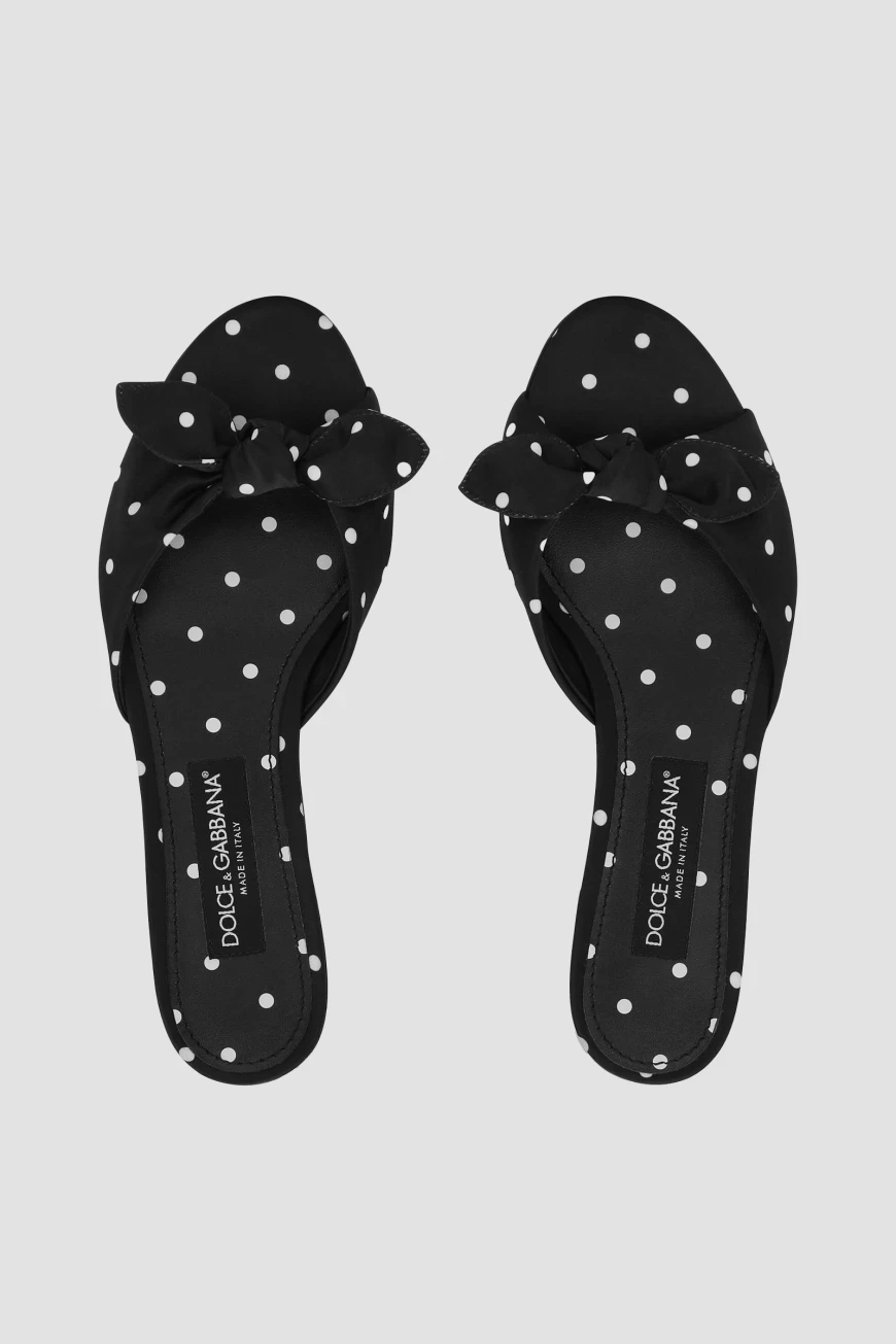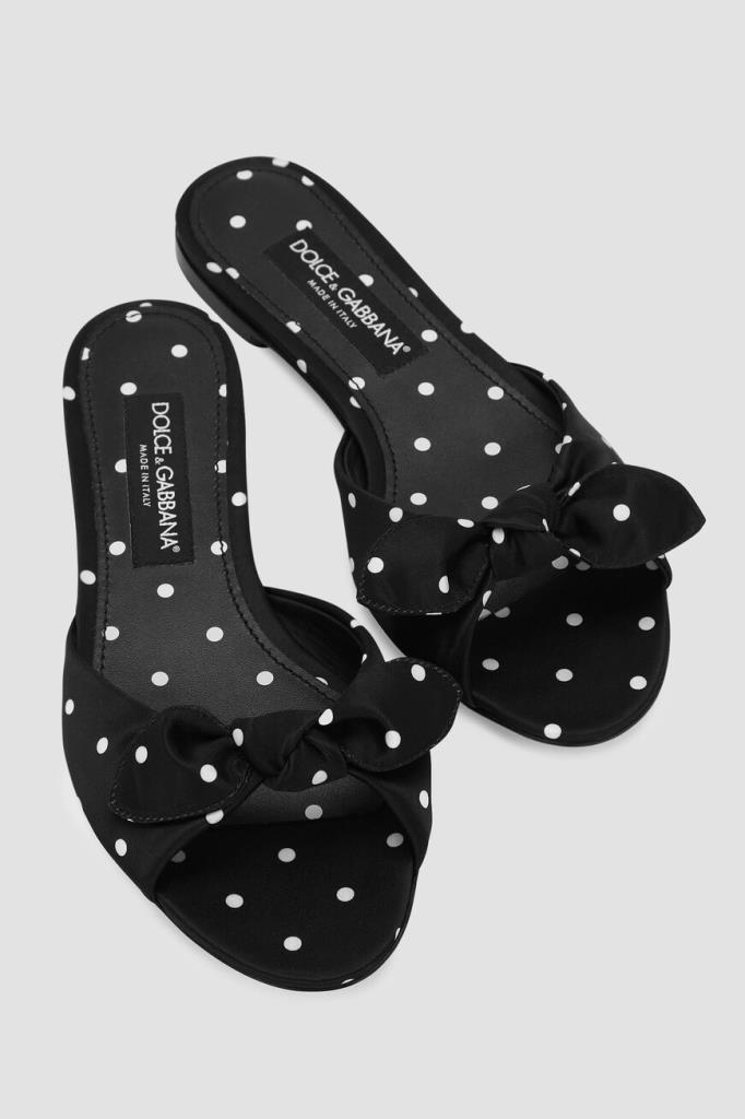 Атласные шлепанцы линии Bianca от DOLCE & GABBANA. Культовая деталь коллекции Mambo Italiano – принт в горошек – получила современную интерпретации, вдохнув в ДНК бренда новую жизнь. Удобная пара выполнена из прочного полиэфира в чёрно-белой гамме. Декором выступают завязки-бант на широком мыске.