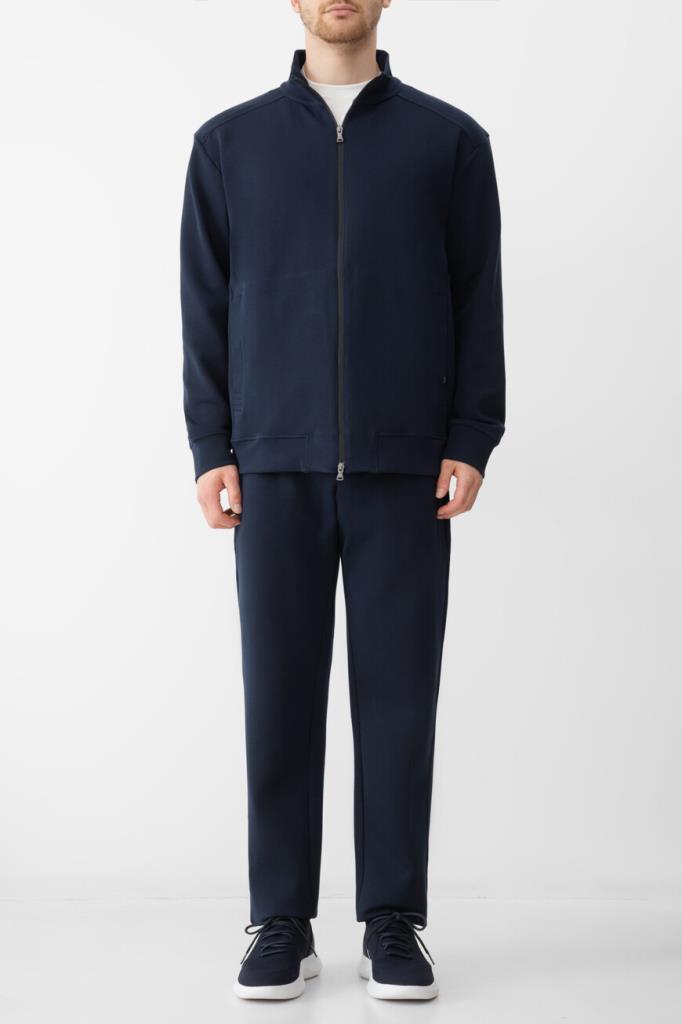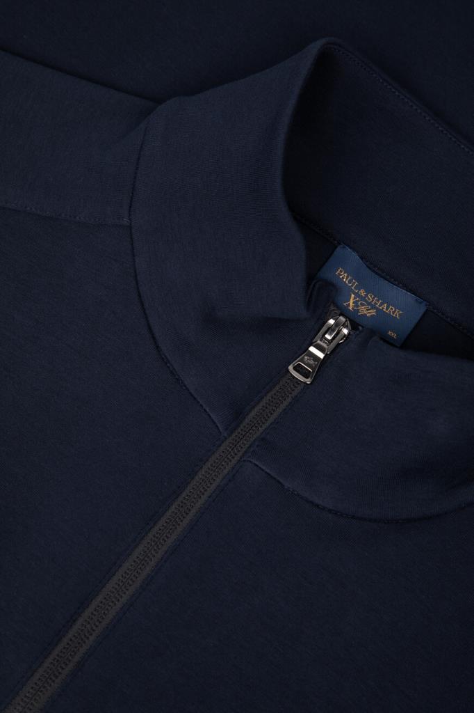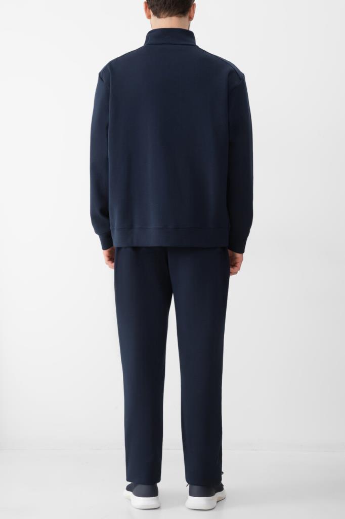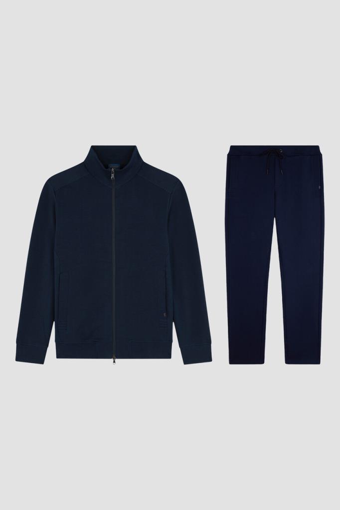 Тёмно-синий спортивный костюм Paul&Shark: брюки и олимпийка. Для изготовления стрейчевого комплекта выбраны хлопок и прочный нейлон с эксклюзивной мягкой обработкой X-Soft. Конструкция верхней части модели характеризуется прямым кроем и застёжкой на встречную молнию с двумя брендированными пуллерами, а нижней - наличием плотного пояса-кулиски и прорезных карманов. Атрибутами Дома являются вставка с культовой акулой на левом кармане толстовки и вышитый силуэт острого плавника акулы сзади на воротнике.
