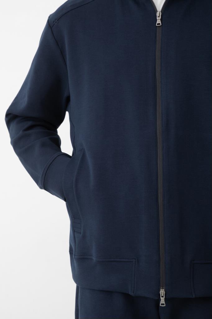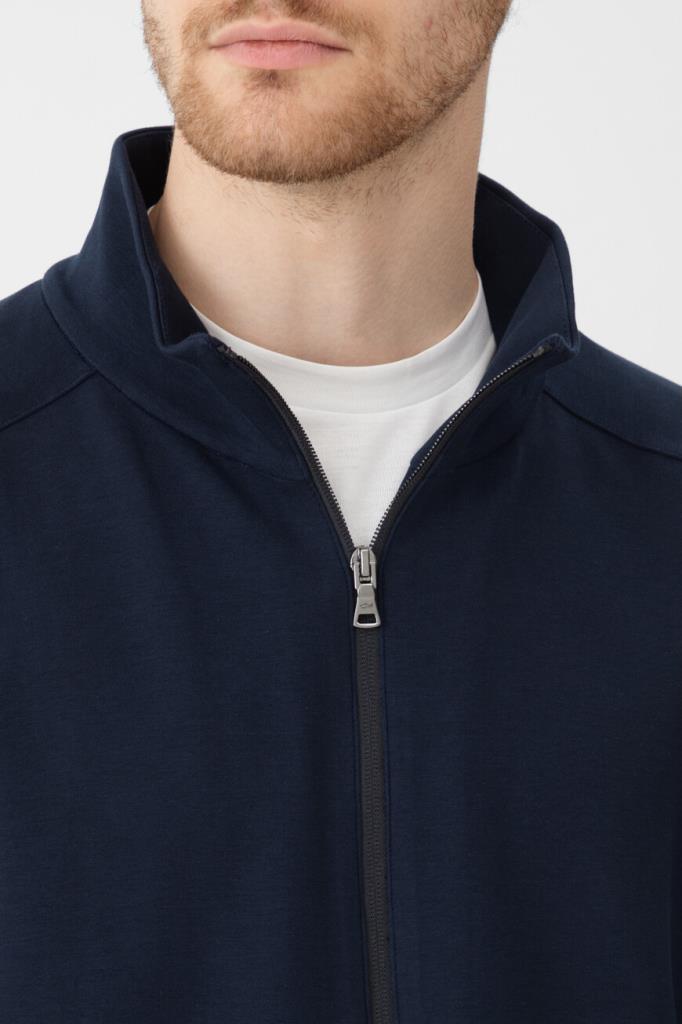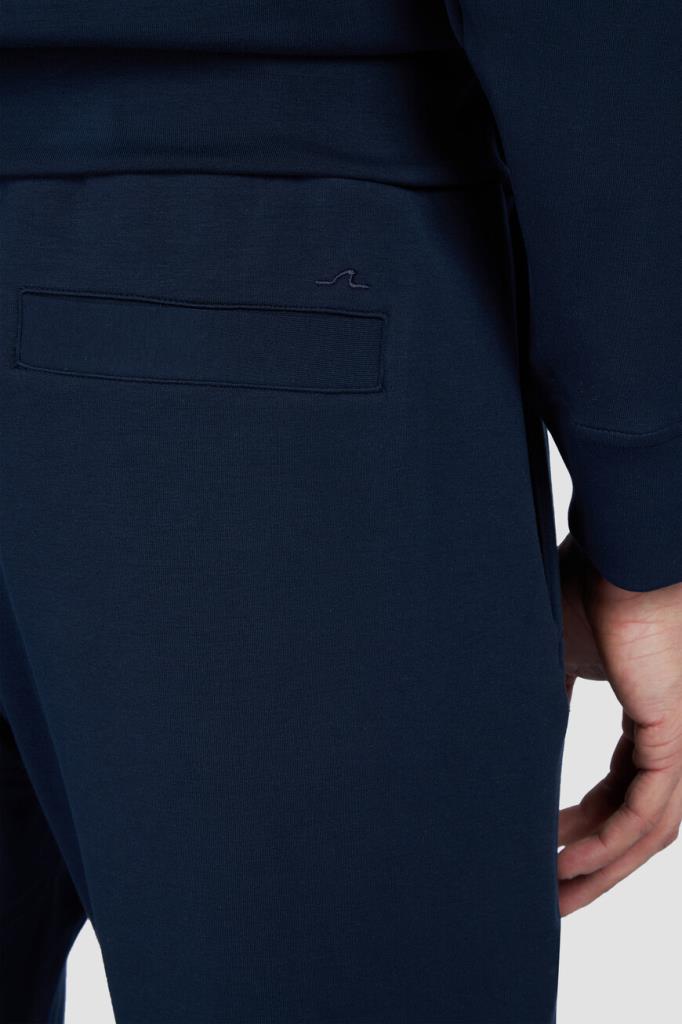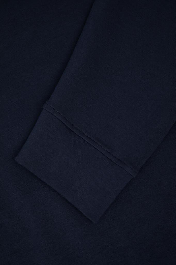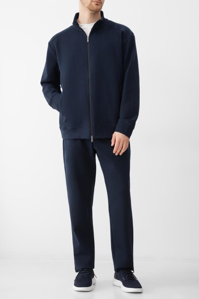 Тёмно-синий спортивный костюм Paul&Shark: брюки и олимпийка. Для изготовления стрейчевого комплекта выбраны хлопок и прочный нейлон с эксклюзивной мягкой обработкой X-Soft. Конструкция верхней части модели характеризуется прямым кроем и застёжкой на встречную молнию с двумя брендированными пуллерами, а нижней - наличием плотного пояса-кулиски и прорезных карманов. Атрибутами Дома являются вставка с культовой акулой на левом кармане толстовки и вышитый силуэт острого плавника акулы сзади на воротнике.