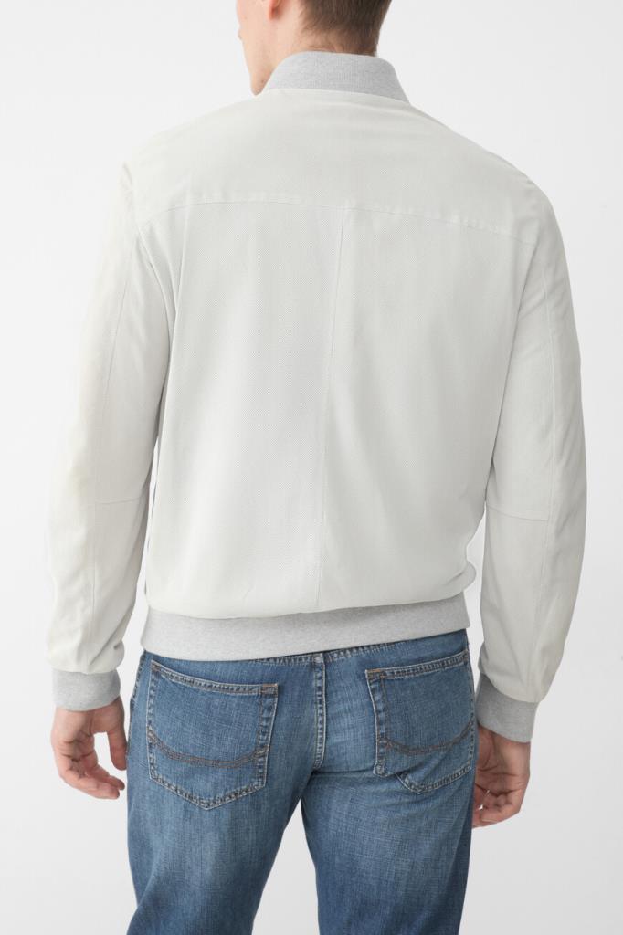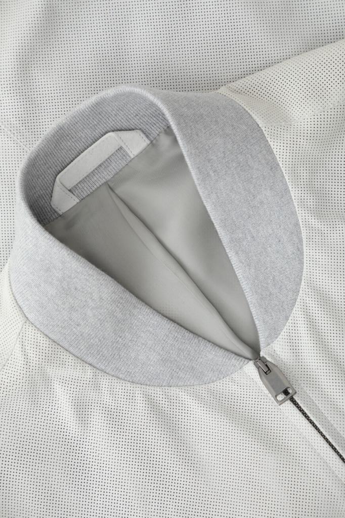 Перфорированный бомбер белого цвета от Brioni. Для производства изделия с невысоким воротником-стойкой используется матовая кожа наппа. Модель застёгивается встречной молнией с двумя металлическими пуллерами и отличается исключительным уровнем конструирования и обработки деталей. Воротник, манжеты рукавов и широкий пояс дополнены серой резинкой для комфортной посадки.
