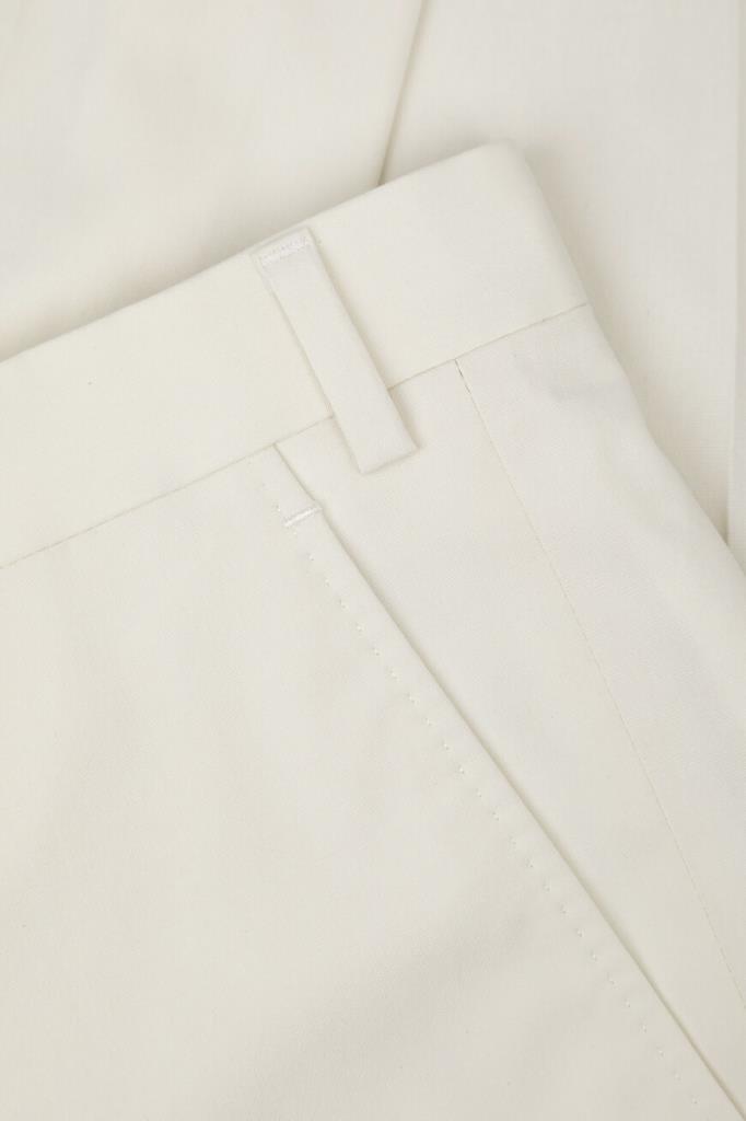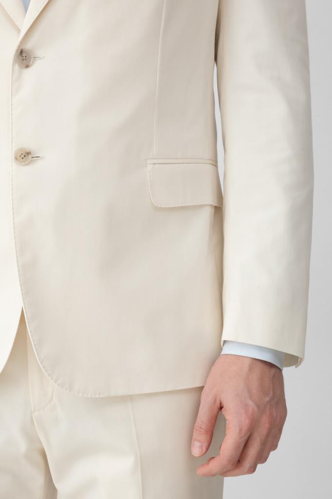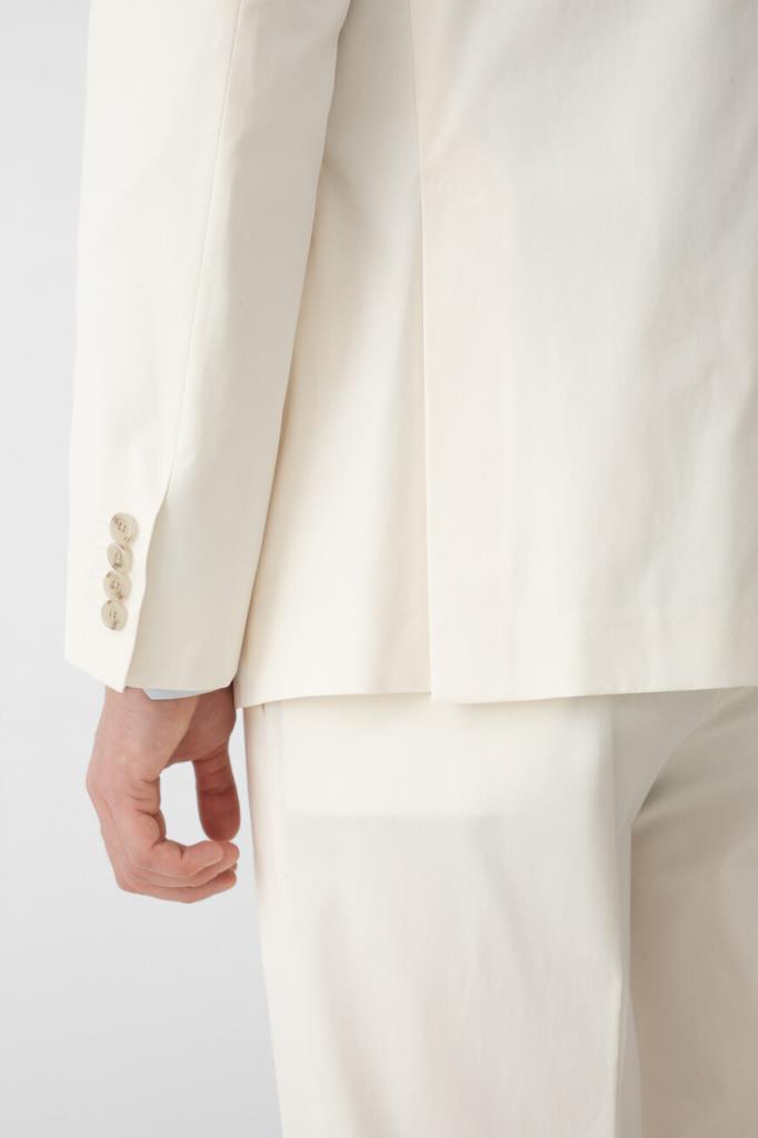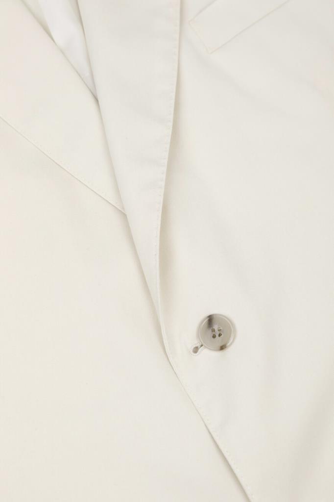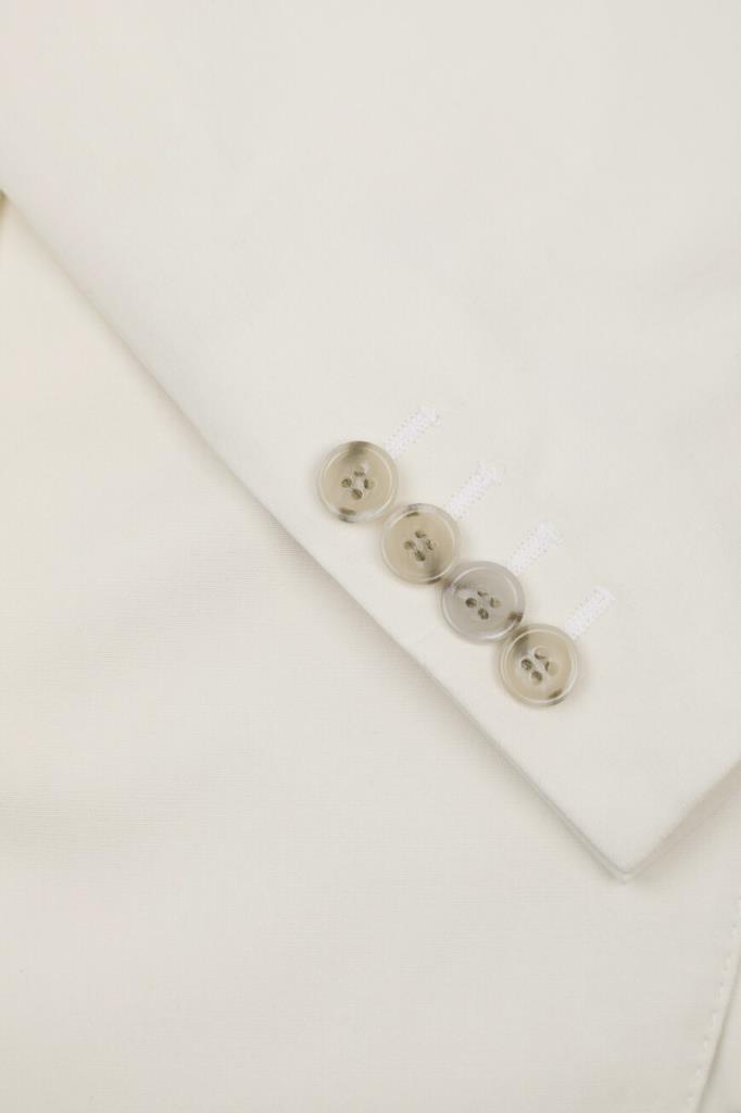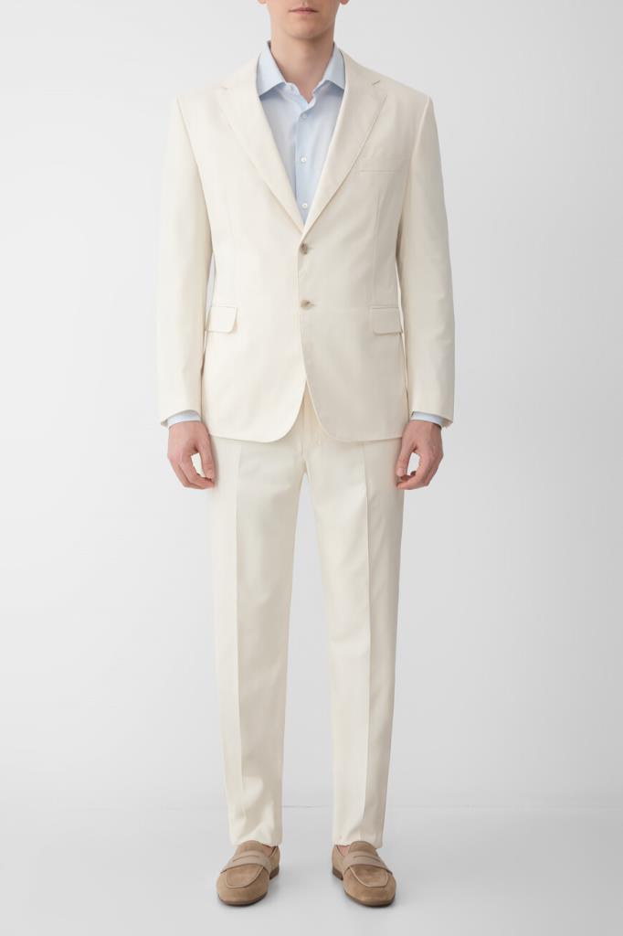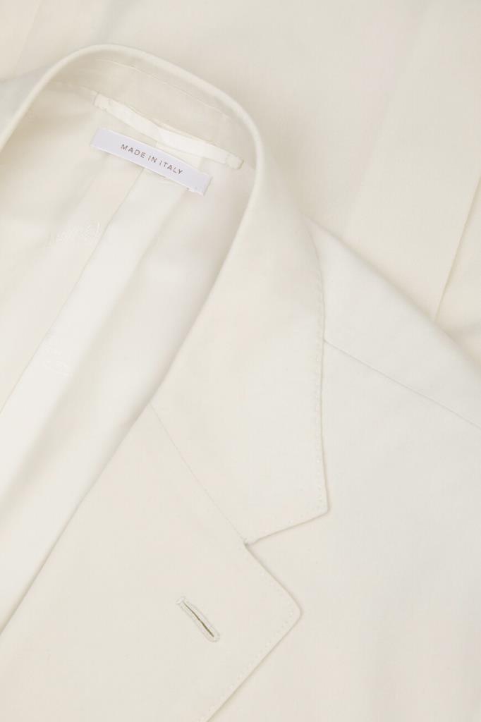 Белоснежный костюм-двойка от Brioni: приталенный пиджак и брюки со стрелками. Комплект сшит из эластичного трикотажа на основе хлопка и гладкого шёлка без броского декора. Однобортный пиджак с двумя шлицами сзади застёгивается на крупные роговые пуговицы, а брюки - на потайную молнию и крючок с планкой. Отличительными особенностями изделия стали тональная строчка-шов и подкладка из трёх видов материалов: на основе купро, хлопка и трикотажа из хлопка и модала.