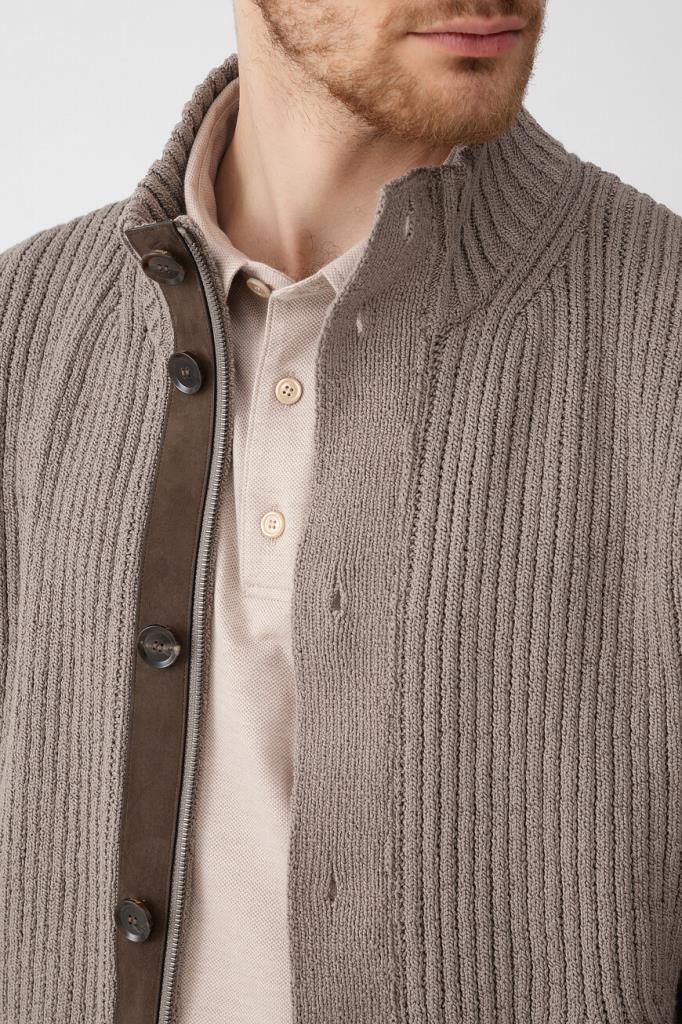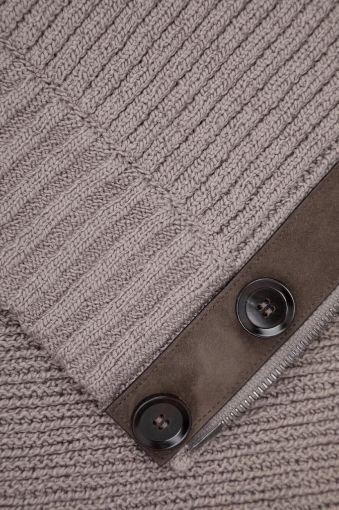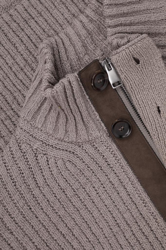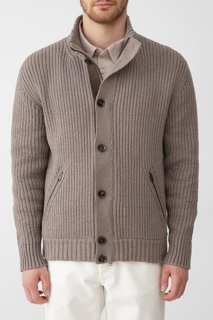 Вязаный блузон Brioni с высоким воротником-стойкой. Для создания изделия прямого силуэта используется мягкий хлопковый трикотаж с фактурным геометрическим узором. Модель застёгивается на молнию, покрытую планкой, и крупные роговые пуговицы и отличается внутренней частью-отделкой планки застёжки, выполненной из бархатистой тёмно-коричневой замши. В прорезных карманах на молнии с диагональным входом по бокам удобно хранить мелкие предметы. Горловина, планка застёжки, манжеты рукавов и широкий пояс оформлены резинкой для оптимальной посадки по фигуре.