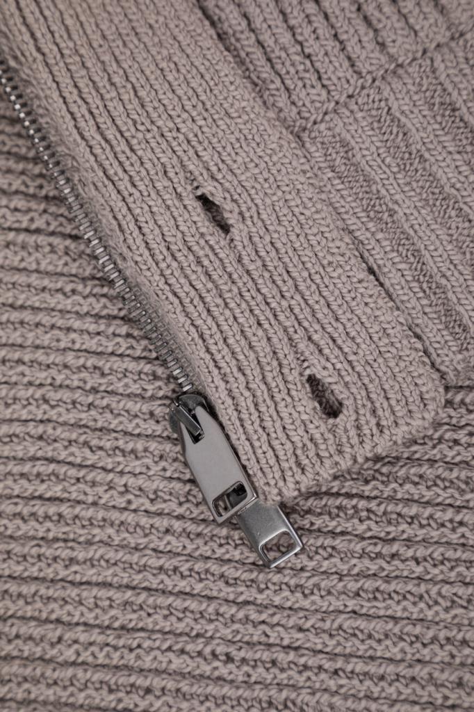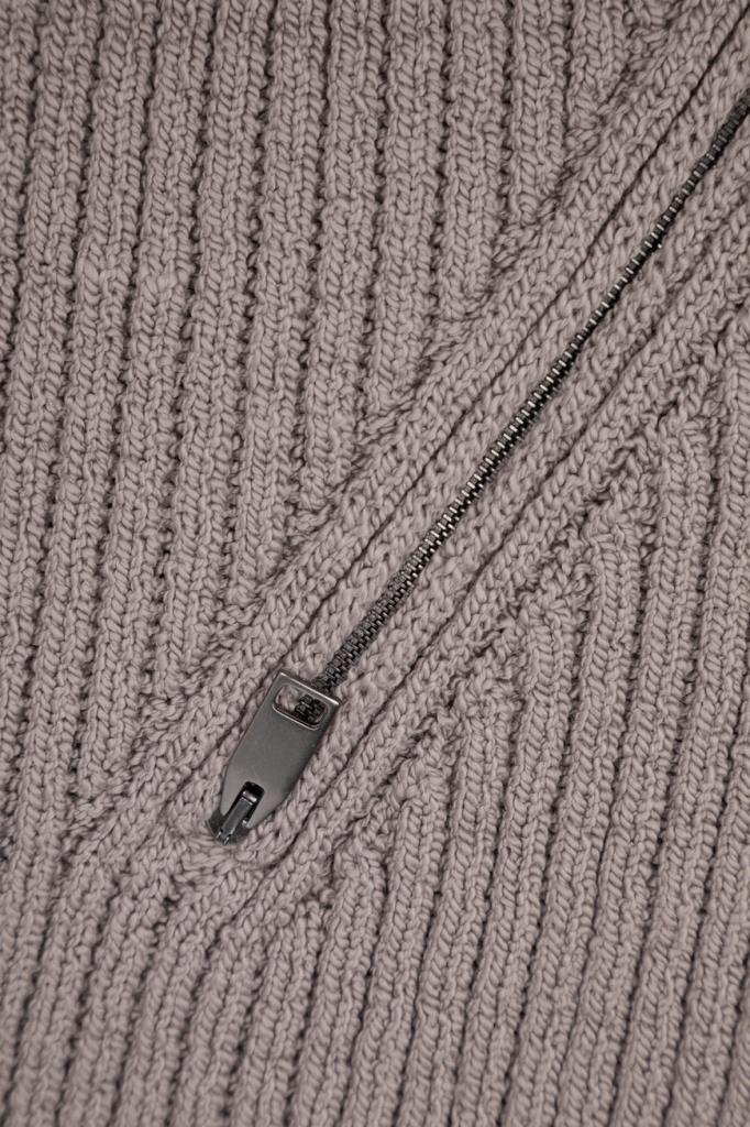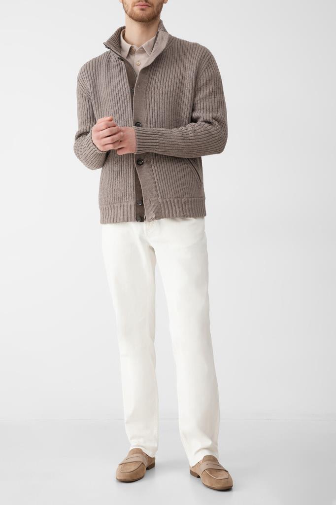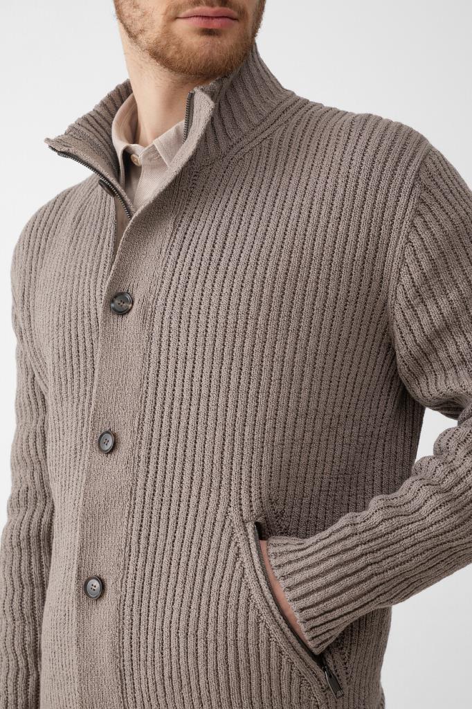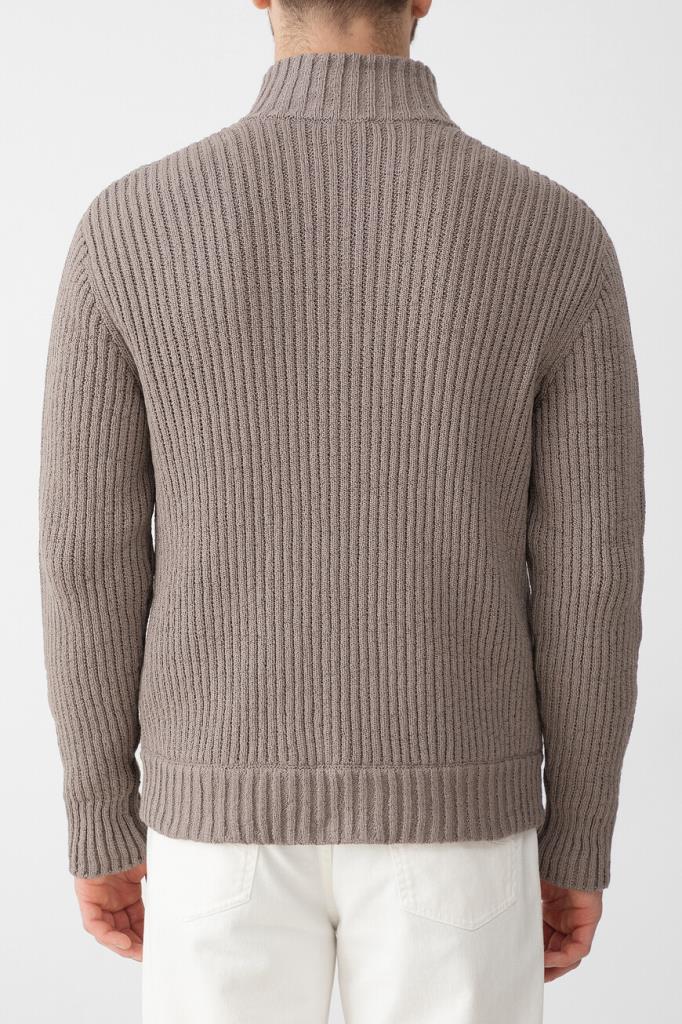 Вязаный блузон Brioni с высоким воротником-стойкой. Для создания изделия прямого силуэта используется мягкий хлопковый трикотаж с фактурным геометрическим узором. Модель застёгивается на молнию, покрытую планкой, и крупные роговые пуговицы и отличается внутренней частью-отделкой планки застёжки, выполненной из бархатистой тёмно-коричневой замши. В прорезных карманах на молнии с диагональным входом по бокам удобно хранить мелкие предметы. Горловина, планка застёжки, манжеты рукавов и широкий пояс оформлены резинкой для оптимальной посадки по фигуре.