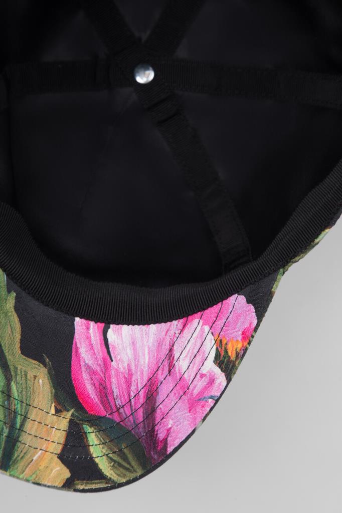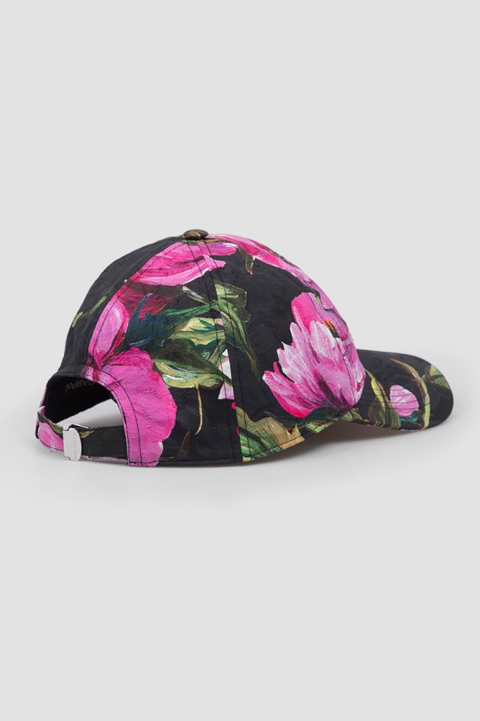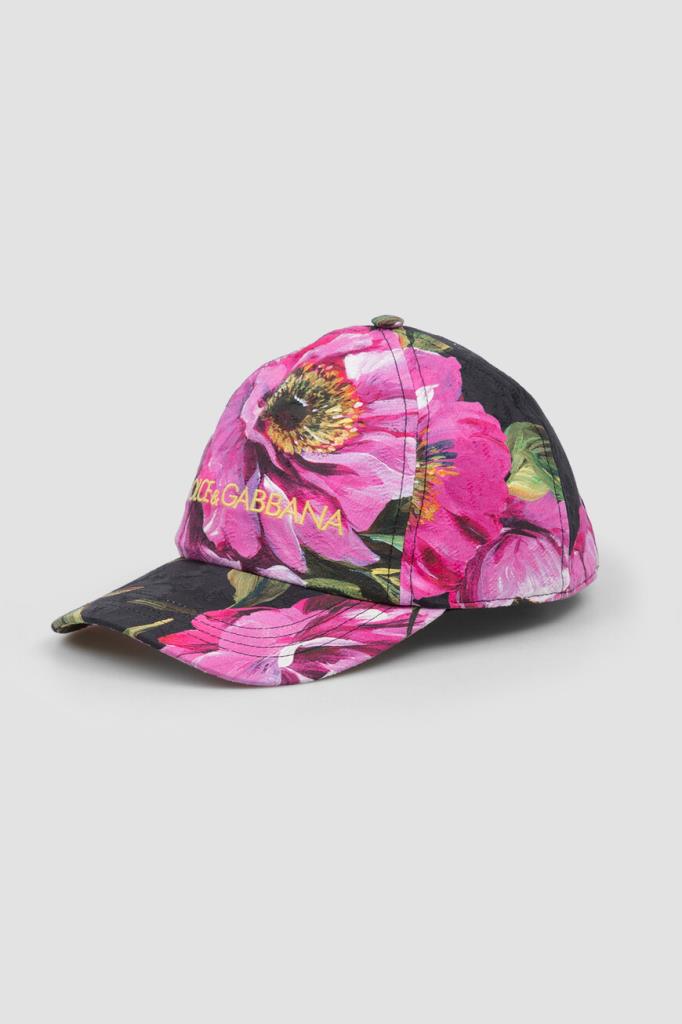 Бейсболка Dolce & Gabbana из коллекции Warm Weather. Это яркая ода красоте цветочного мира, прославляющая элегантность и жизненную силу, лежащие в основе ДНК бренда. Нежные букеты наполняют каждую вещь чувством романтики и свежести, добавляют образу очарования. Для пошива традиционной шестиклинки используется хлопковый жаккард с добавлением эластичных волокон. Изделие украшают крупные принт с изображением пионов и вышитая жёлтая надпись-логотип на тулье.