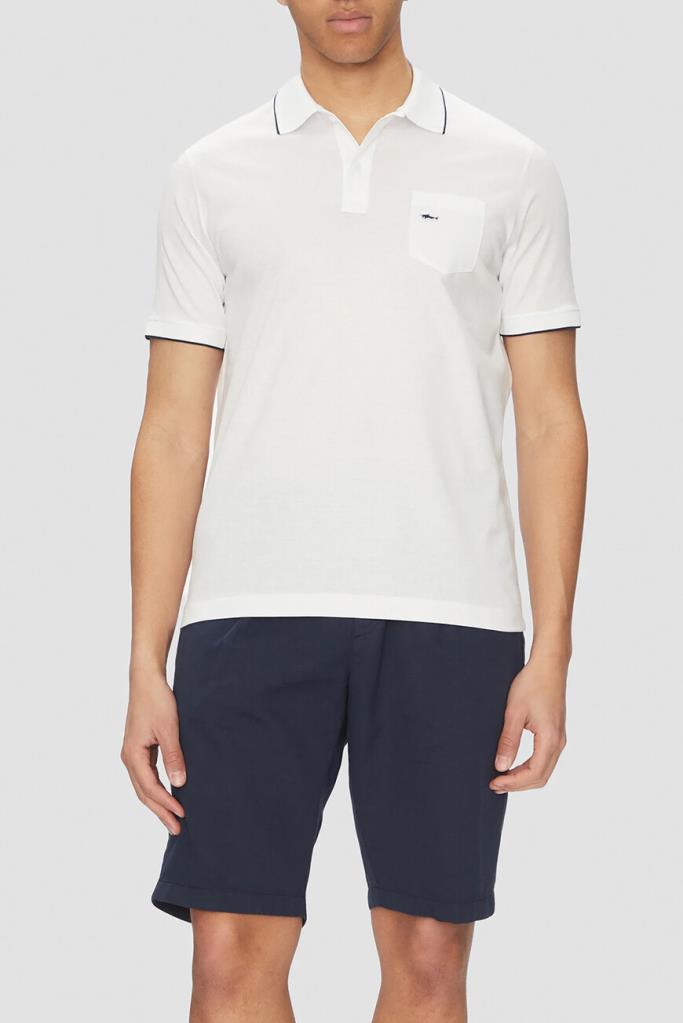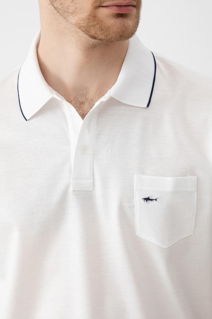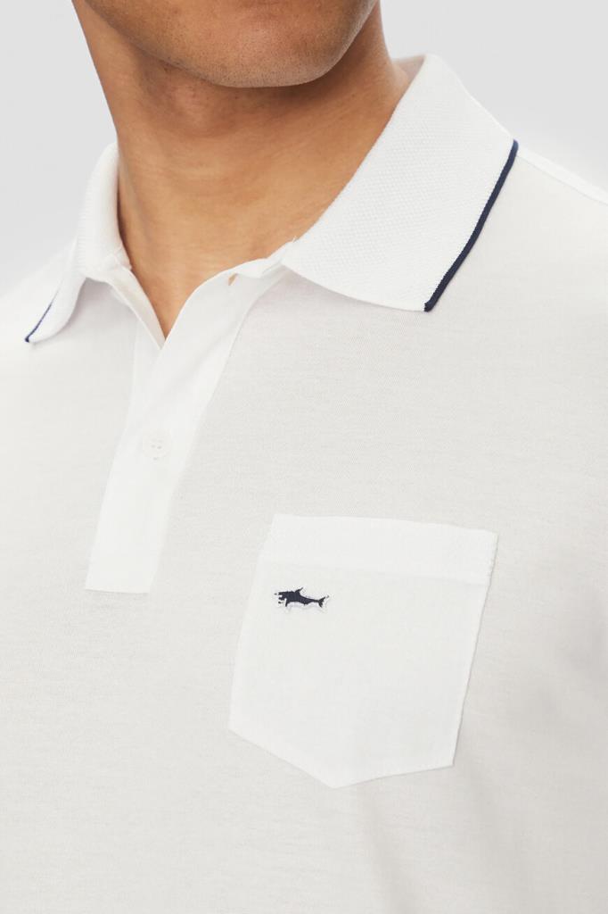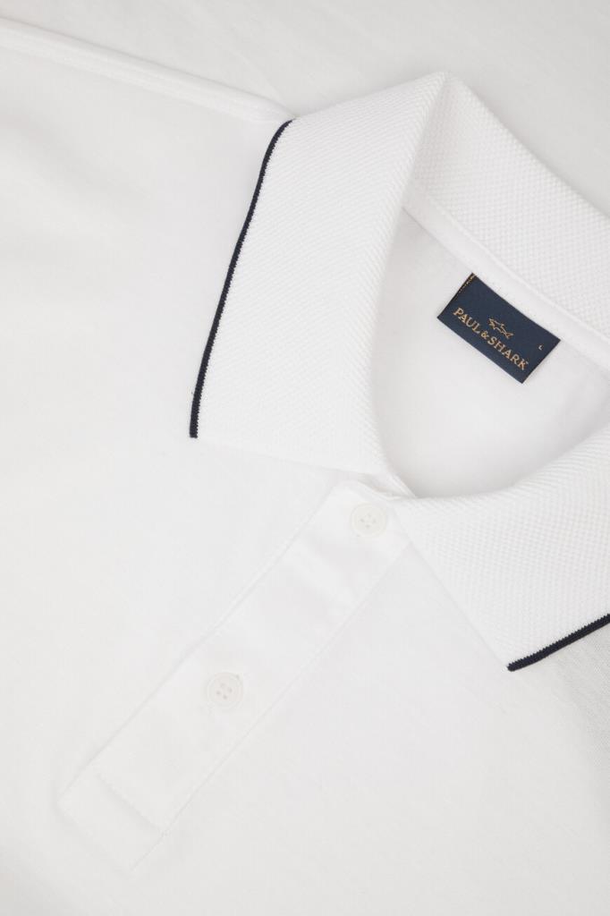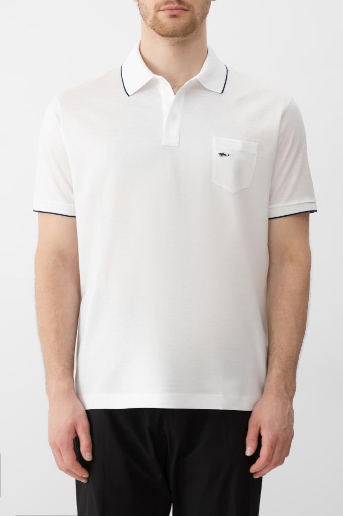 Поло белого цвета от бренда Paul&Shark. Модель прямого силуэта сшита из мягкого хлопкового джерси с гладкой текстурой. Отложной воротник и манжеты рукавов декорированы кантом, а на нагрудном накладном кармане слева размещена вышитая знаковая символика Дома - изображение акулы.