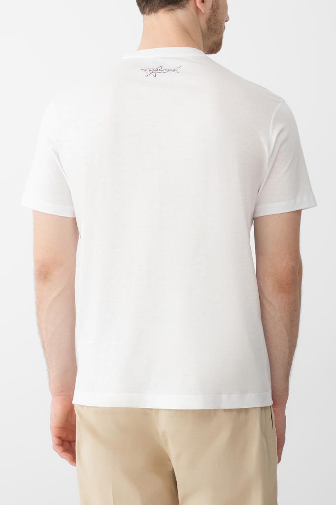 Футболка Paul&Shark входит в коллекцию Riviera Hello Capri. Коллекция передаёт непринуждённую атмосферу летнего сезона в объятиях ярких оттенков и света на итальянском острове. Для производства модели белого цвета используется джерси на основе хлопка и лиоцелла с обработкой X-Soft, которая делает ткань очень мягкой на ощупь. О принадлежности изделия прямого силуэта Дому напоминает крупный тропический принт в акварельной технике с изображением акул и дизайнерской надписью авторства итальянского художника Фабрицио «Биксио» Брагьери спереди.