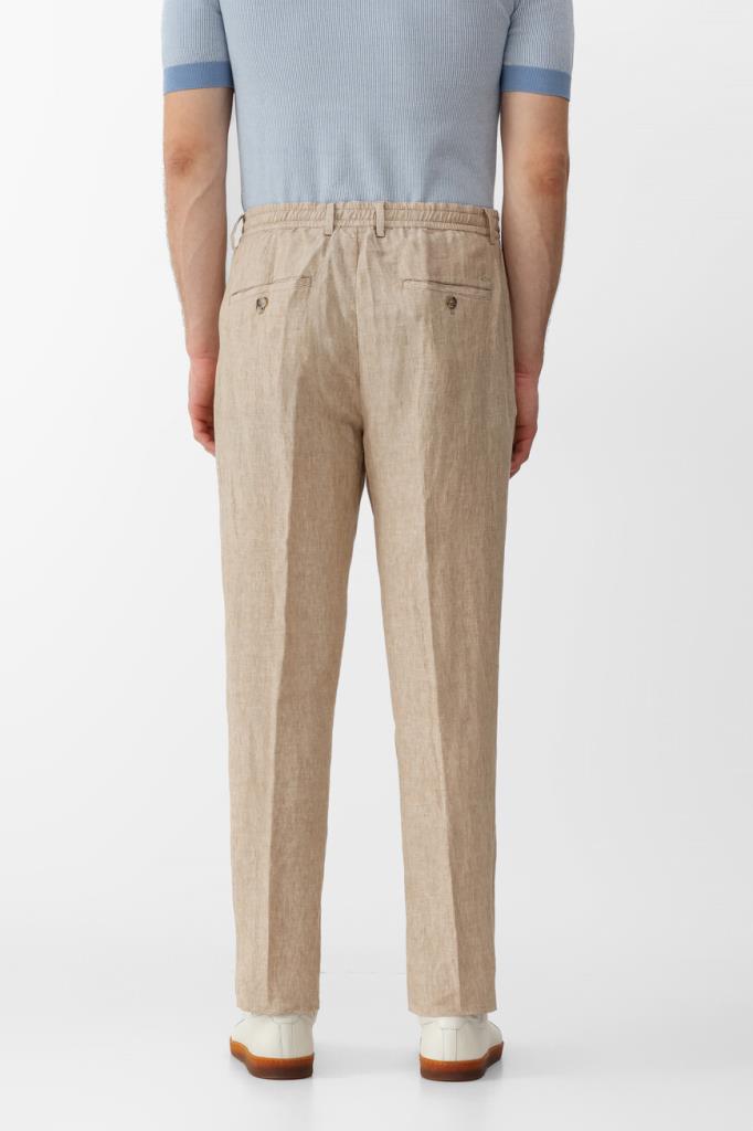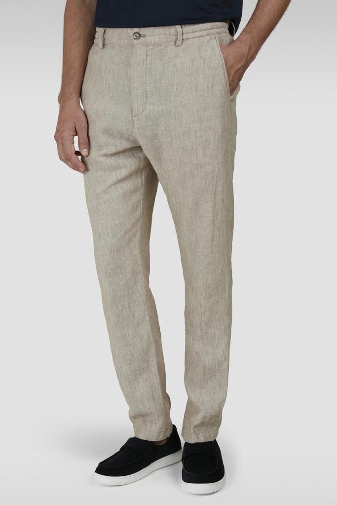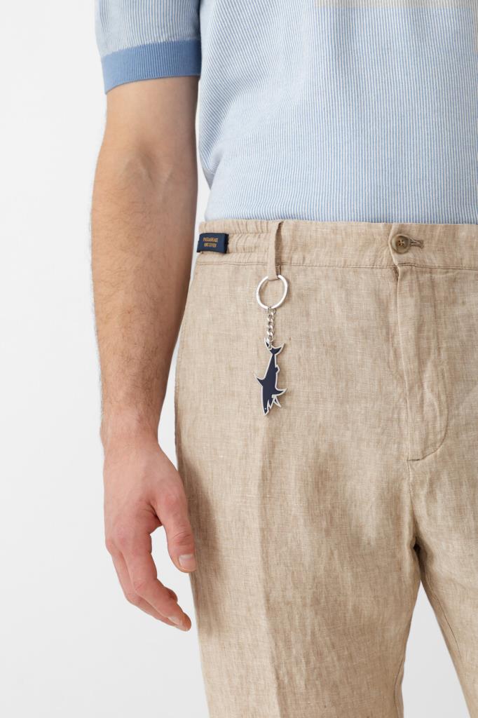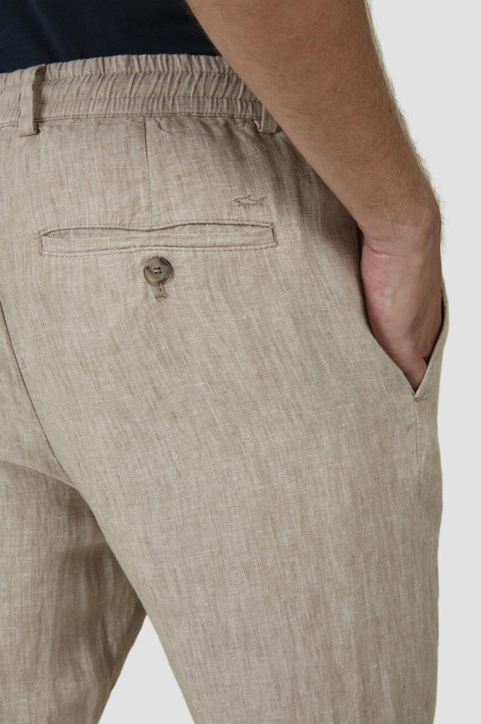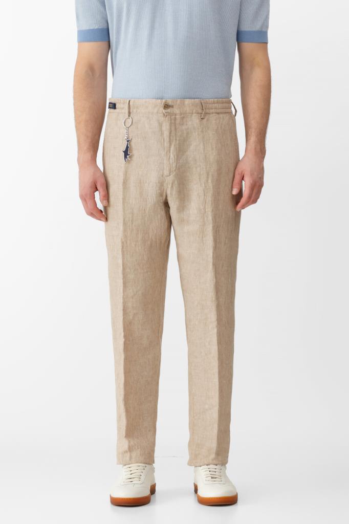 Бежевые брюки-чиносы с широким плотным поясом-резинкой от бренда Paul&Shark. Для производства изделия прямого силуэта используется лёгкий мягкий лён. Модель, идеально подходящая для создания повседневных и более элегантных образов, является воплощением универсального стиля и сочетает в себе функциональность и эстетичность. Брюки оснащены четырьмя прорезными карманами и застёжкой на молнию, покрытую планкой, и крупную роговую пуговицу. Декором выступает миниатюрная вышивка в виде тонального силуэта акулы, размещённая над правым задним карманом.
