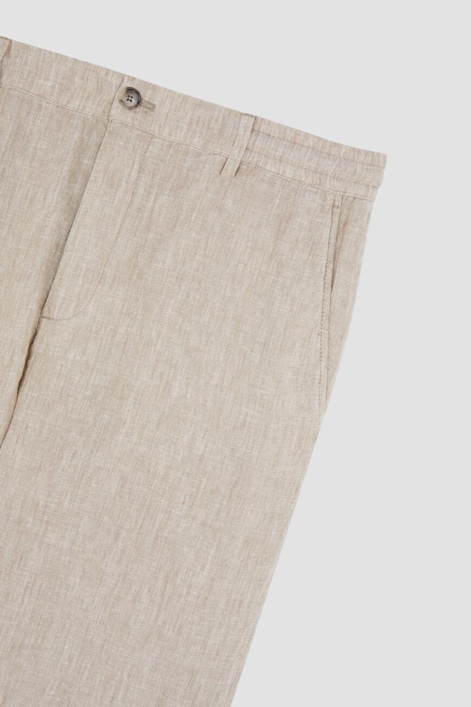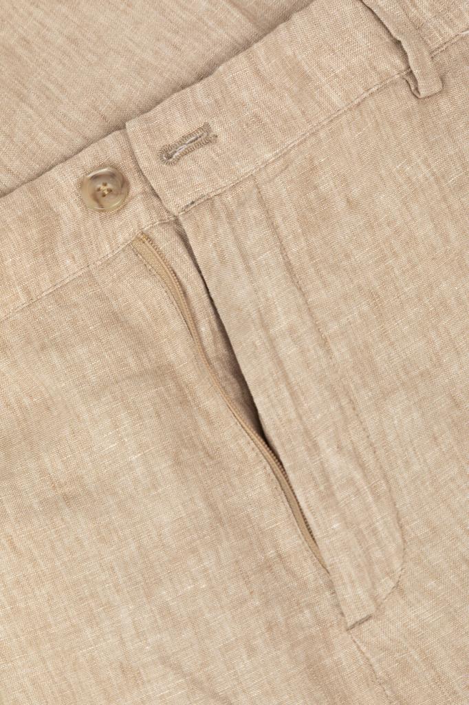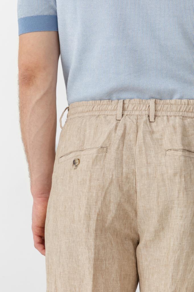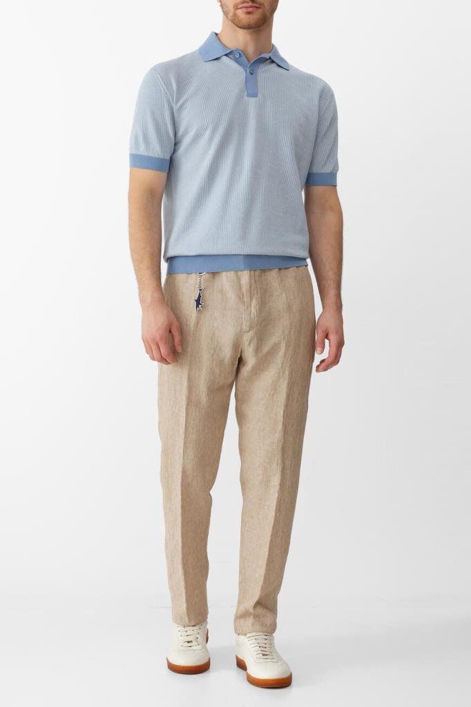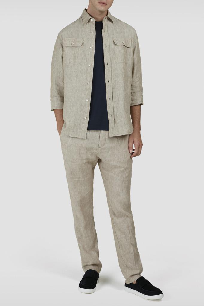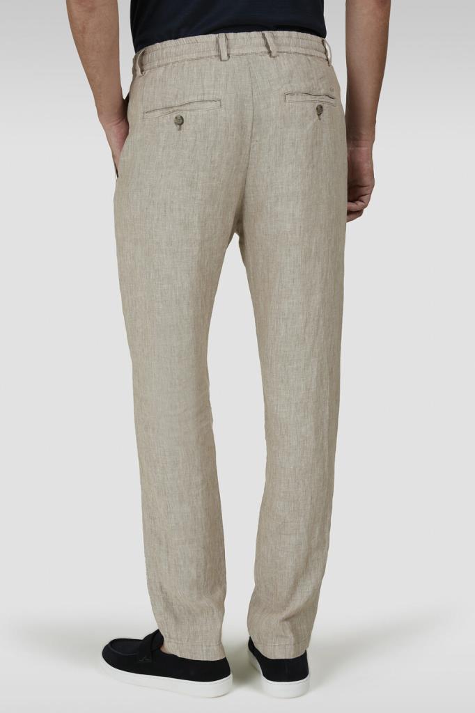 Бежевые брюки-чиносы с широким плотным поясом-резинкой от бренда Paul&Shark. Для производства изделия прямого силуэта используется лёгкий мягкий лён. Модель, идеально подходящая для создания повседневных и более элегантных образов, является воплощением универсального стиля и сочетает в себе функциональность и эстетичность. Брюки оснащены четырьмя прорезными карманами и застёжкой на молнию, покрытую планкой, и крупную роговую пуговицу. Декором выступает миниатюрная вышивка в виде тонального силуэта акулы, размещённая над правым задним карманом.