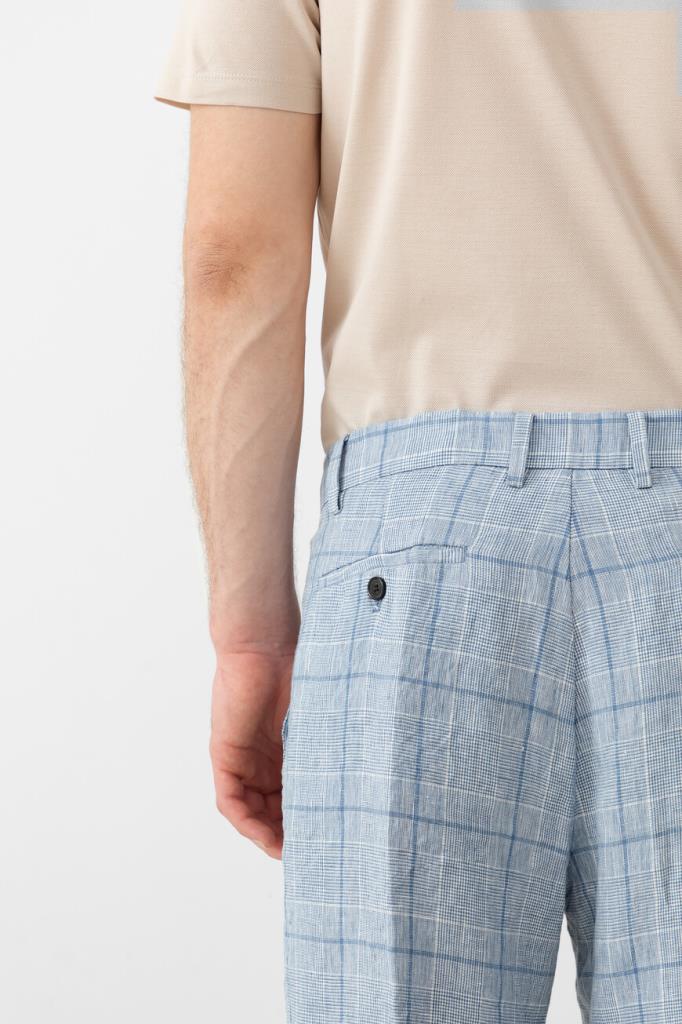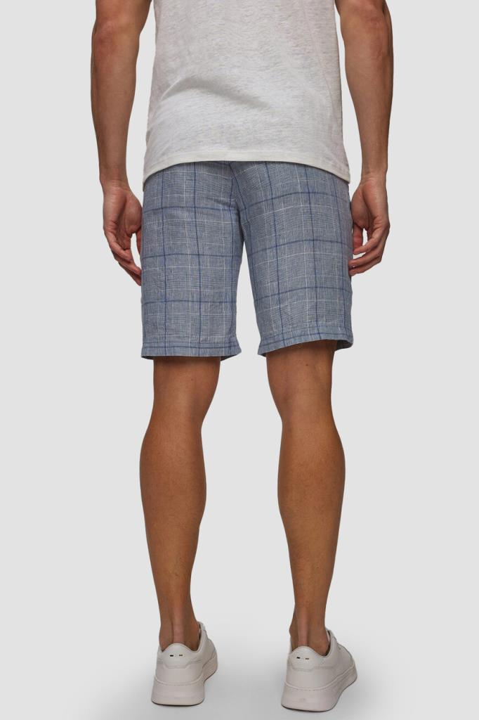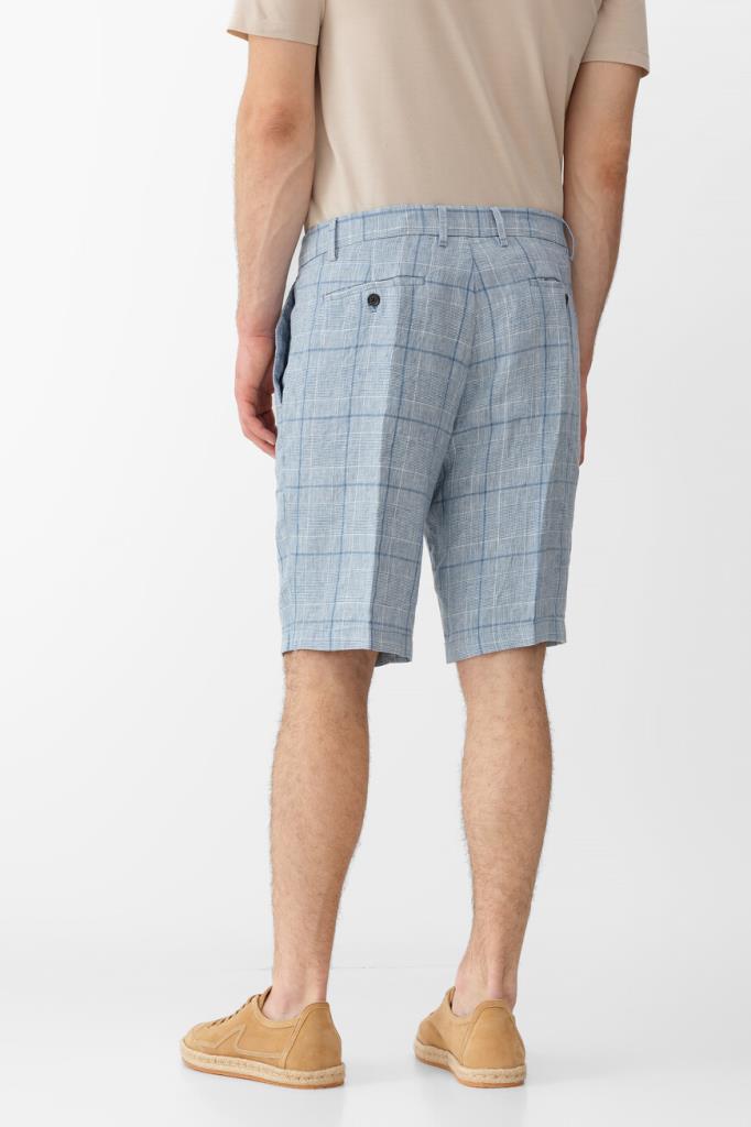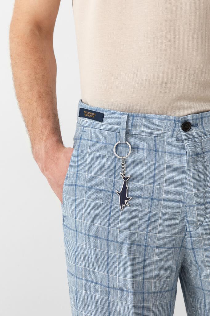 Короткие бермуды Paul&Shark выполнены в белом и голубых тонах. Модель изготовлена из лёгкого льна, который обеспечивает воздухопроницаемость и комфорт в тёплые дни, и покрыта геометрическим мотивом в крупную клетку. О принадлежности изделия Дому напоминает миниатюрная вышивка в виде силуэта акулы над правым задним карманом. В комплекте также - крупный фирменный брелок с акулой.