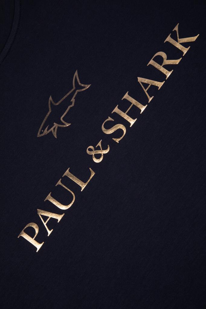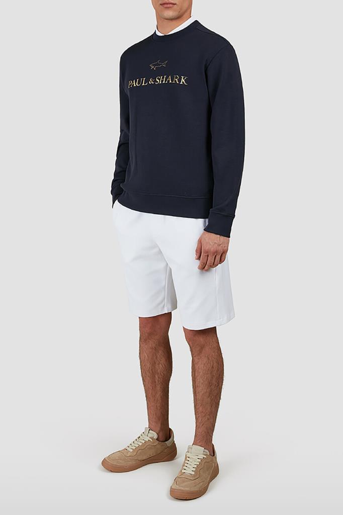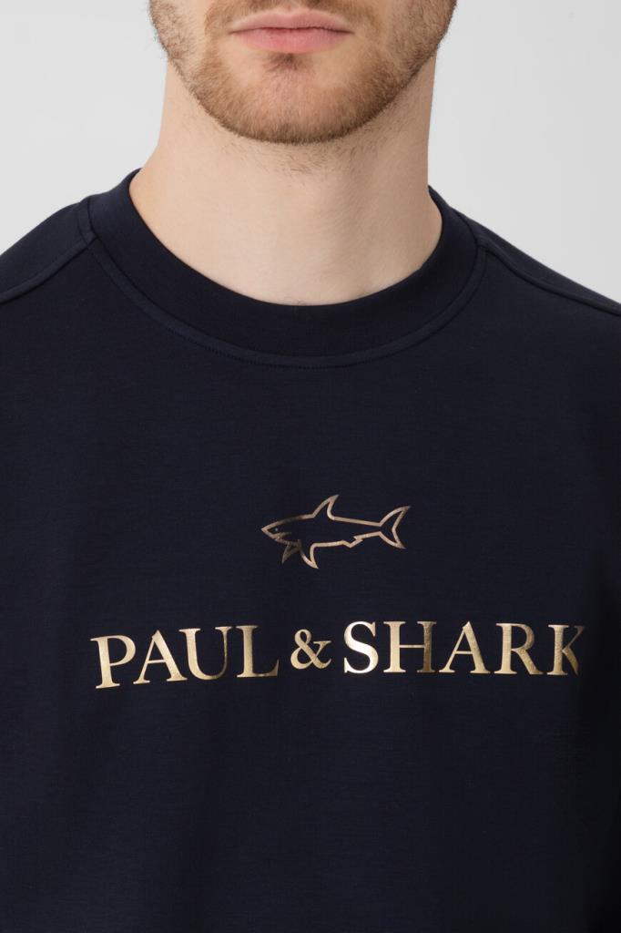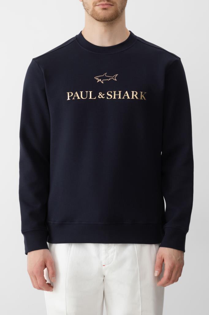 Свитшот тёмно-синего цвета от бренда Paul&Shark. Изделие прямого силуэта выполнено из эластичного трикотажа на основе хлопка и прочного нейлона с эксклюзивной мягкой обработкой X-Soft и круглым вырезом горловины на резинке. Модель в спортивном стиле декорирована крупным золотистым принтом со знаковыми изображением акулы и надписью-логотипом спереди. Свитшот добавит фирменный акцент в Ваши повседневные образы.