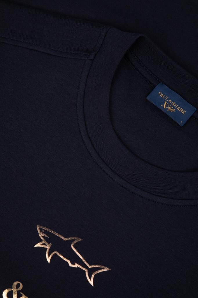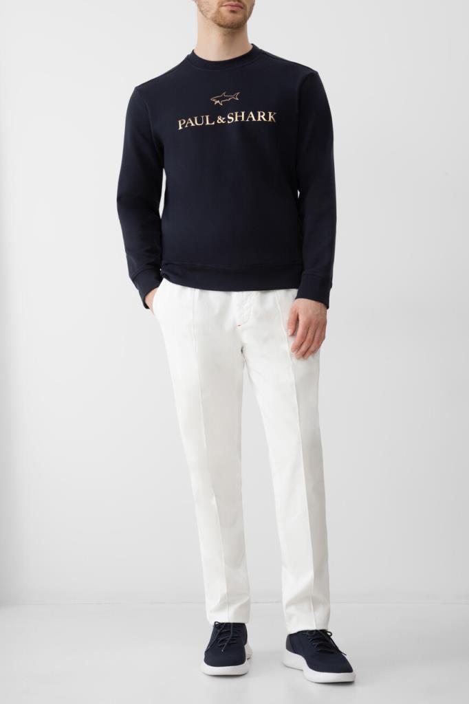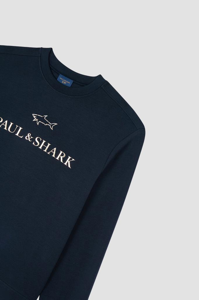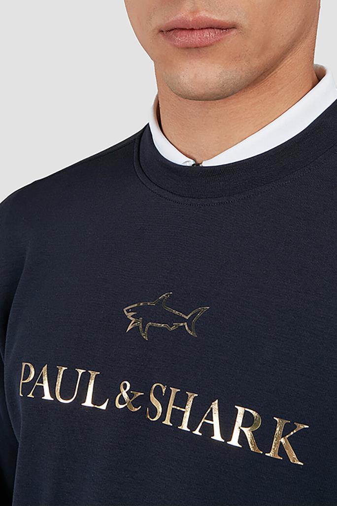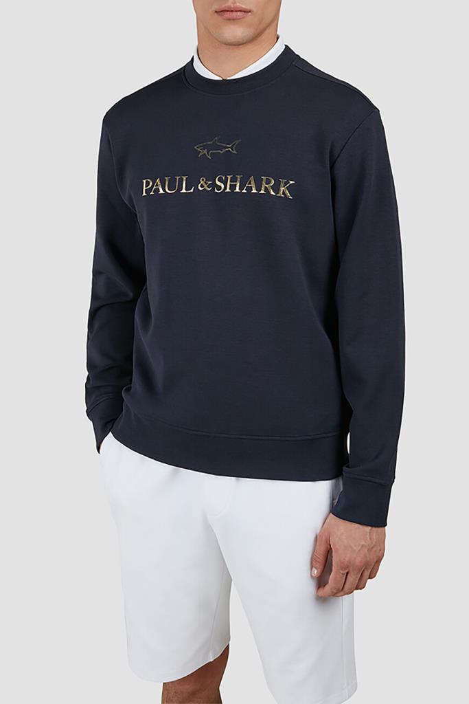 Свитшот тёмно-синего цвета от бренда Paul&Shark. Изделие прямого силуэта выполнено из эластичного трикотажа на основе хлопка и прочного нейлона с эксклюзивной мягкой обработкой X-Soft и круглым вырезом горловины на резинке. Модель в спортивном стиле декорирована крупным золотистым принтом со знаковыми изображением акулы и надписью-логотипом спереди. Свитшот добавит фирменный акцент в Ваши повседневные образы.